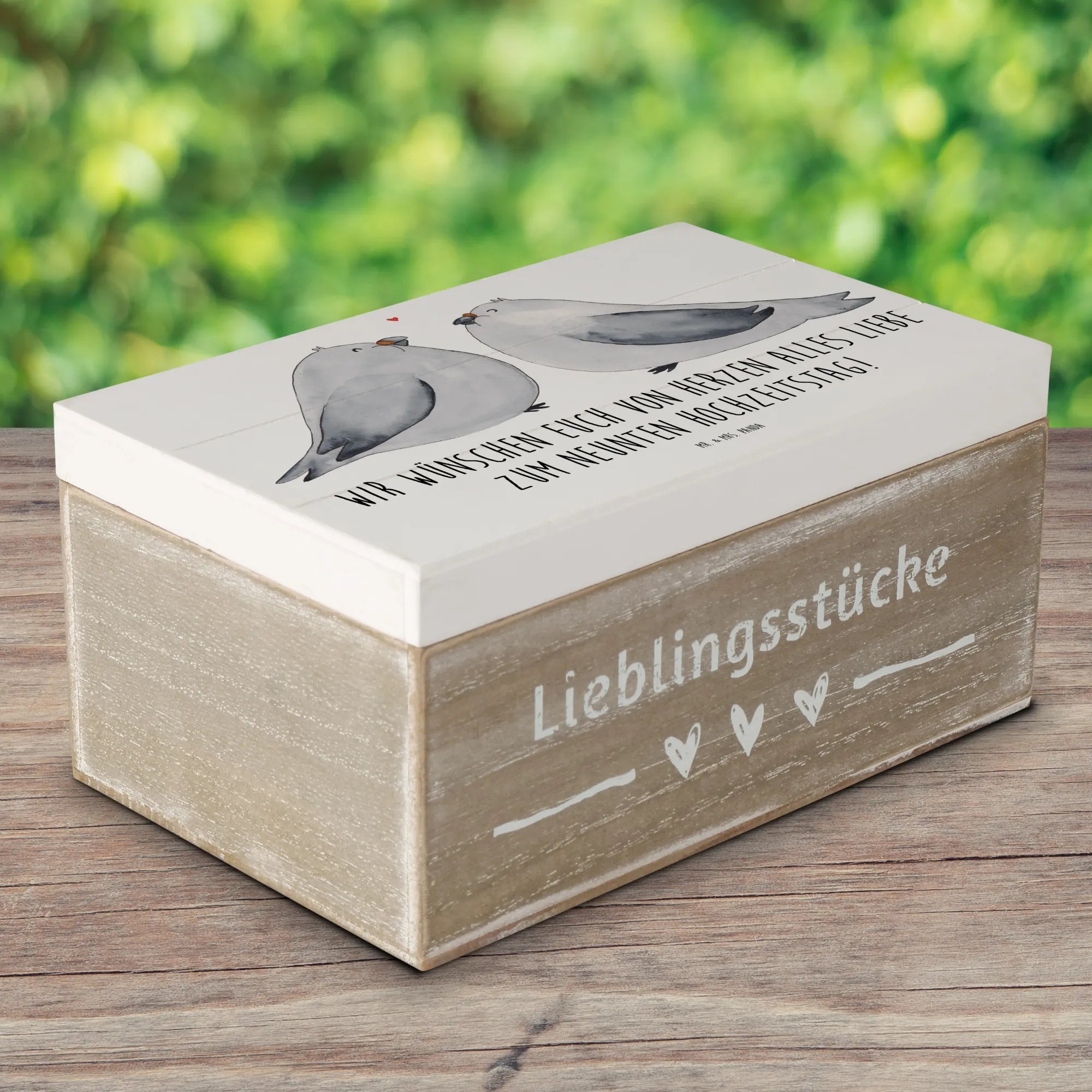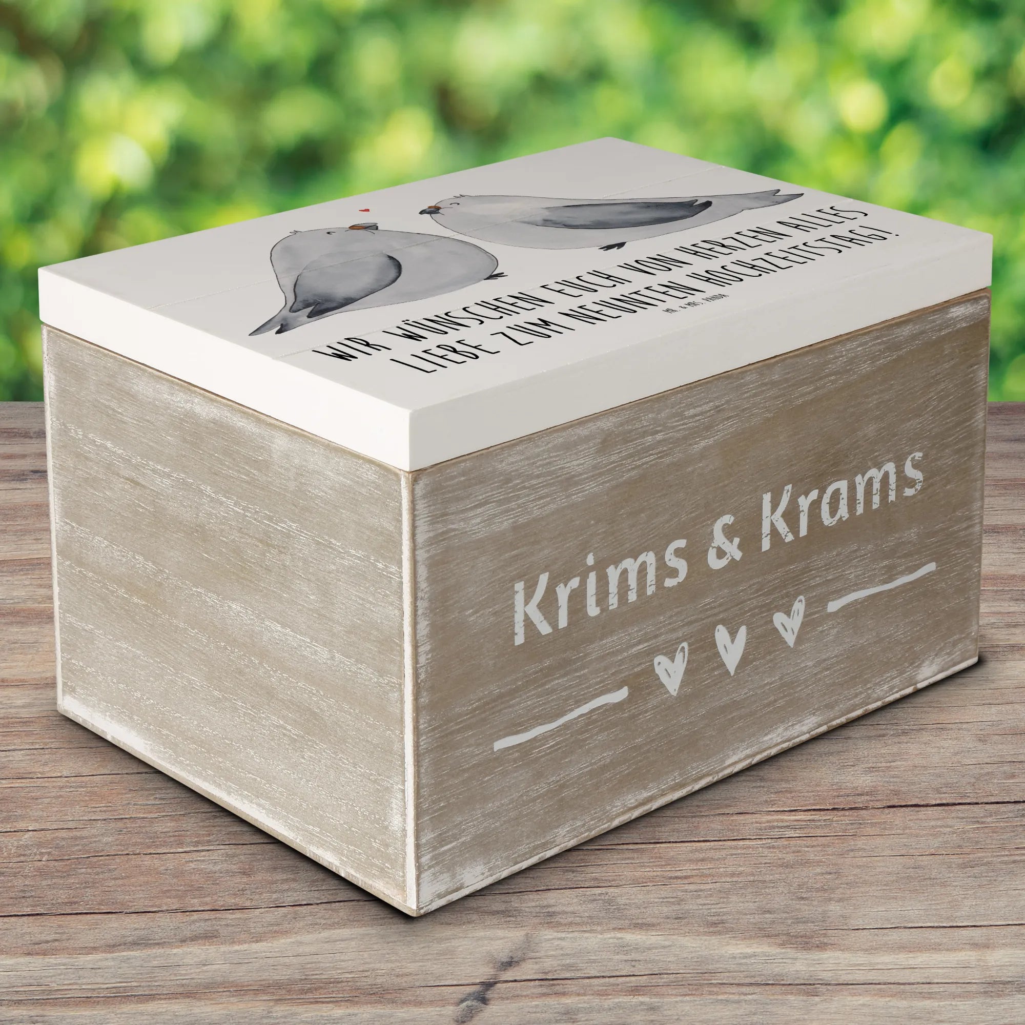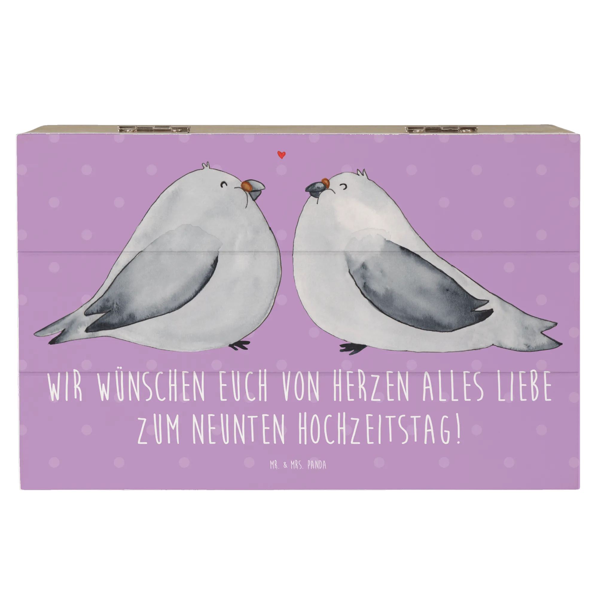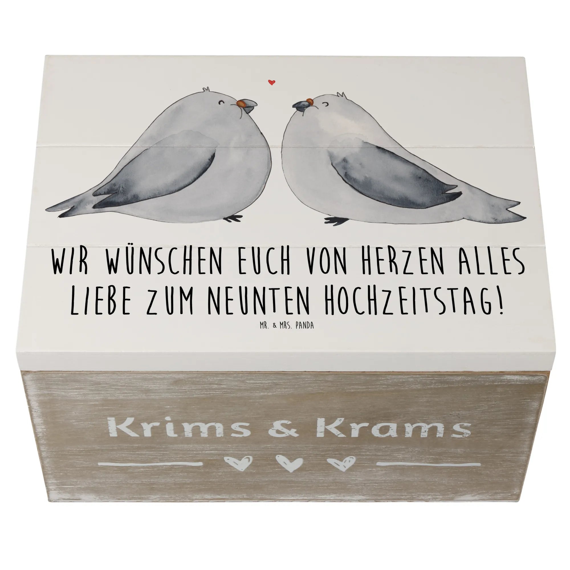 Ob als Erinnerungskiste für festliche Anlässe oder einfach als nachhaltige und wiederverwendbare Geschenkbox, sie ist besonders stabil und wird mit einem liebevollen Spruch von Mr. & Mrs. Panda bedruckt: 'Wir wünschen euch von Herzen alles Liebe zum neunten Hochzeitstag!'. Diese Holzkiste ist eine tolle Möglichkeit, die kleinen Dinge des Lebens zu bewahren. Ein wunderbares Hochzeitsgeschenk, das für immer in Erinnerung bleibt!