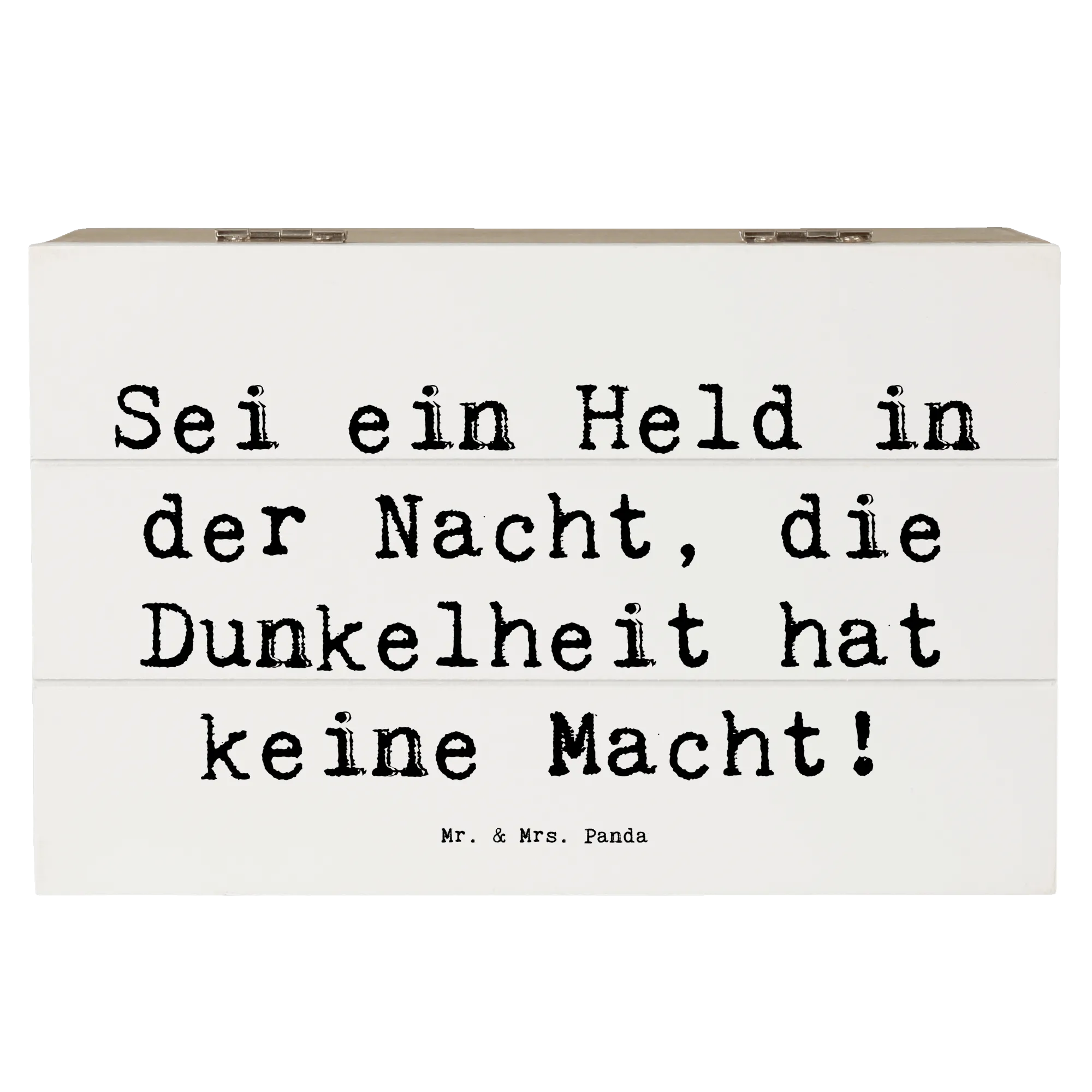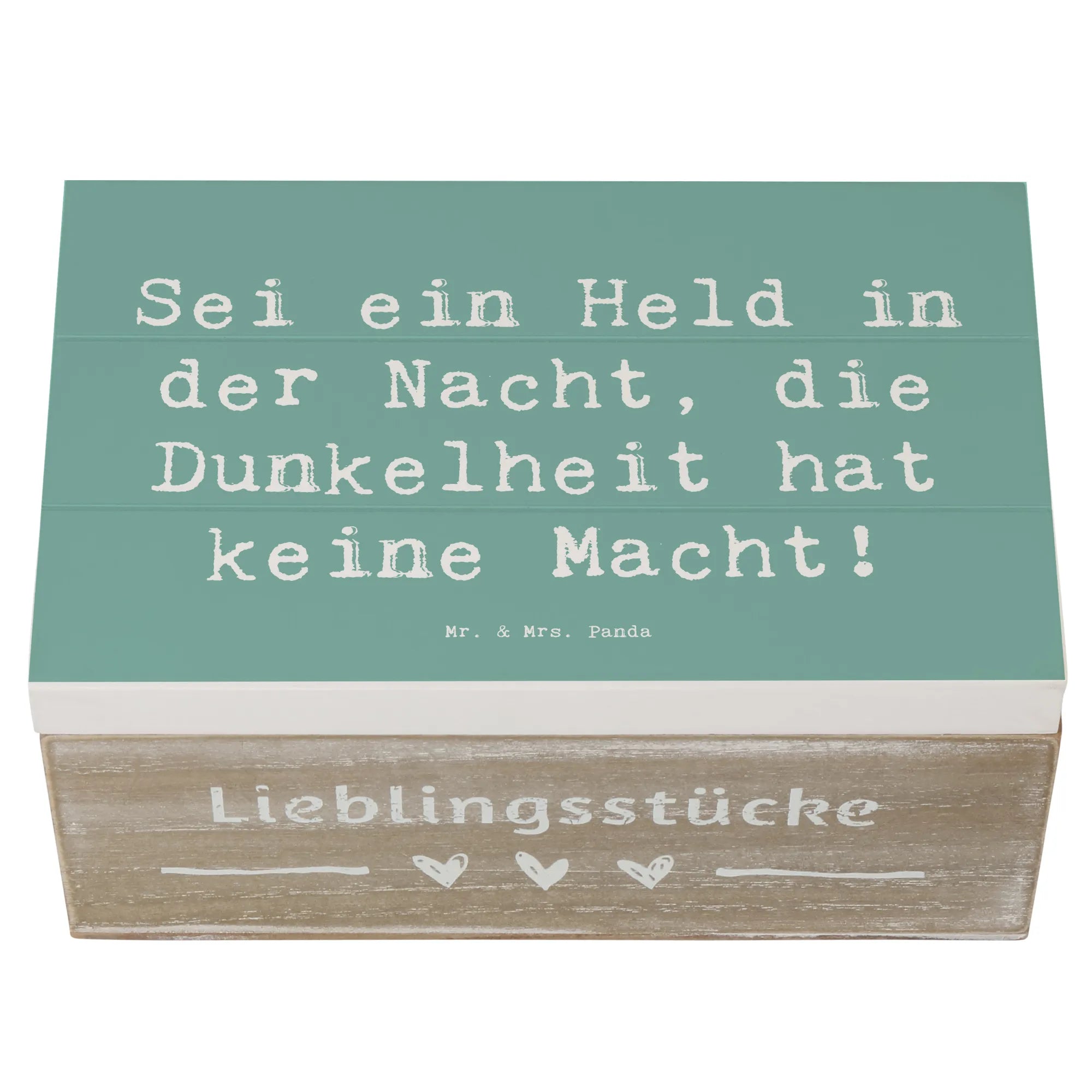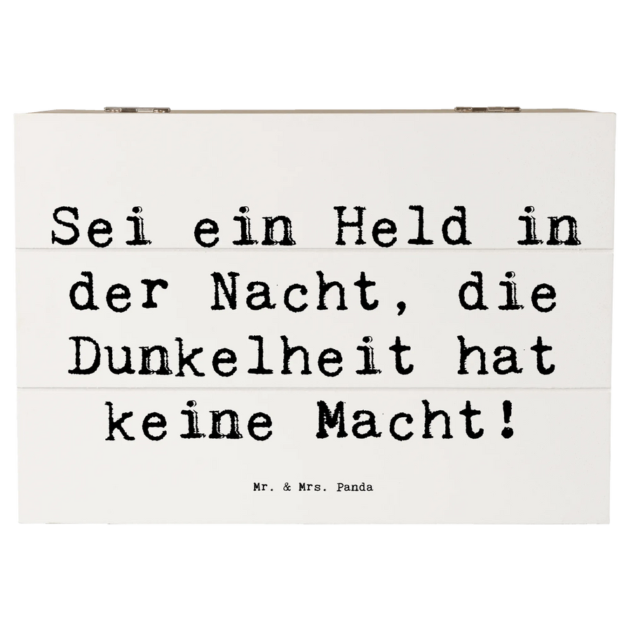 Entdecke die wunderschöne Holzkiste von Mr. & Mrs. Panda mit dem motivierenden Spruch "Sei ein Held in der Nacht, die Dunkelheit hat keine Macht!". Diese Erinnerungskiste ist der perfekte Ort, um wertvolle Schätze, Erinnerungen oder auch kleine Geschenke aufzubewahren.