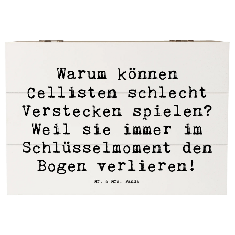 Entdecke die perfekte Holzkiste von Mr. & Mrs. Panda im einzigartigen Cello-Design! Diese wunderschöne Kiste mit dem Spruch "Warum können Cellisten schlecht Verstecken spielen? Weil sie immer im Schlüsselmoment den Bogen verlieren!" bringt nicht nur ein Lächeln auf die Lippen, sondern ist auch das ideale Geschenk für Musikliebhaber und Cellisten.