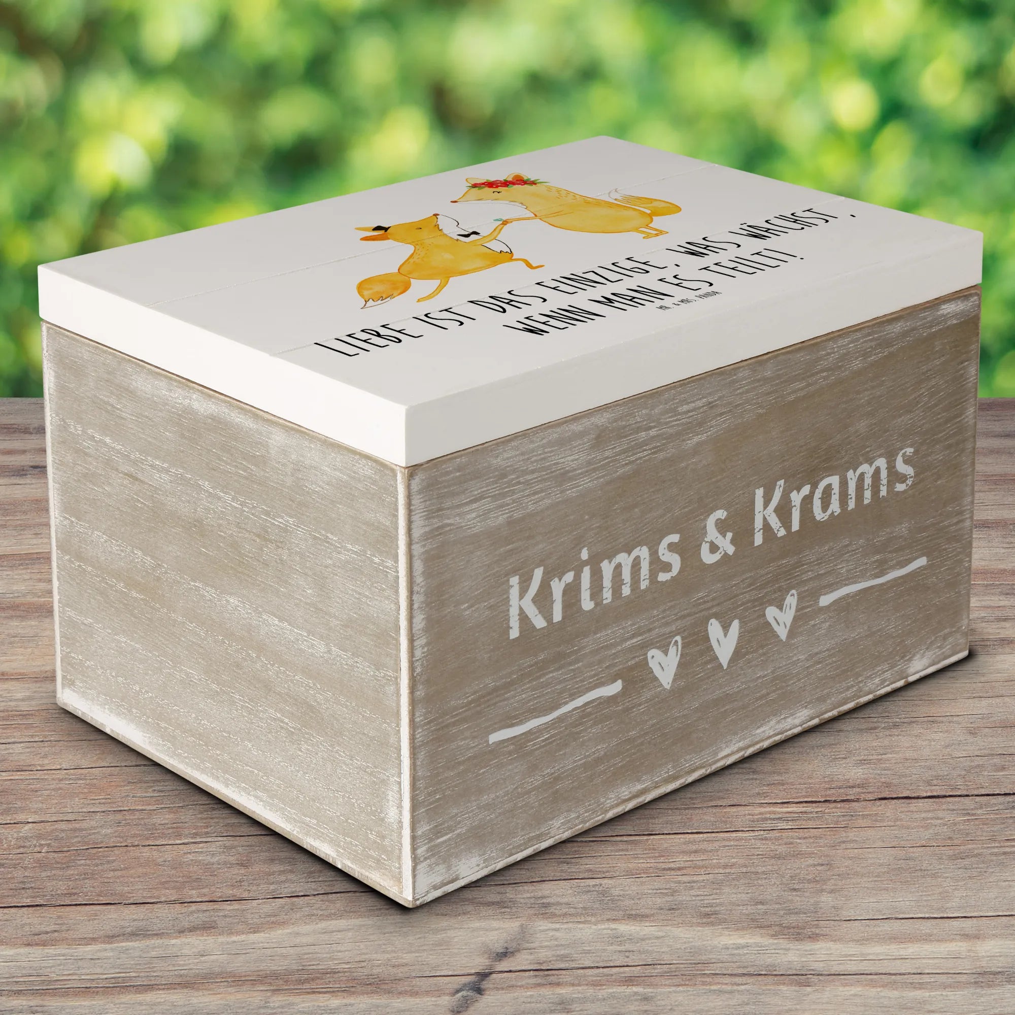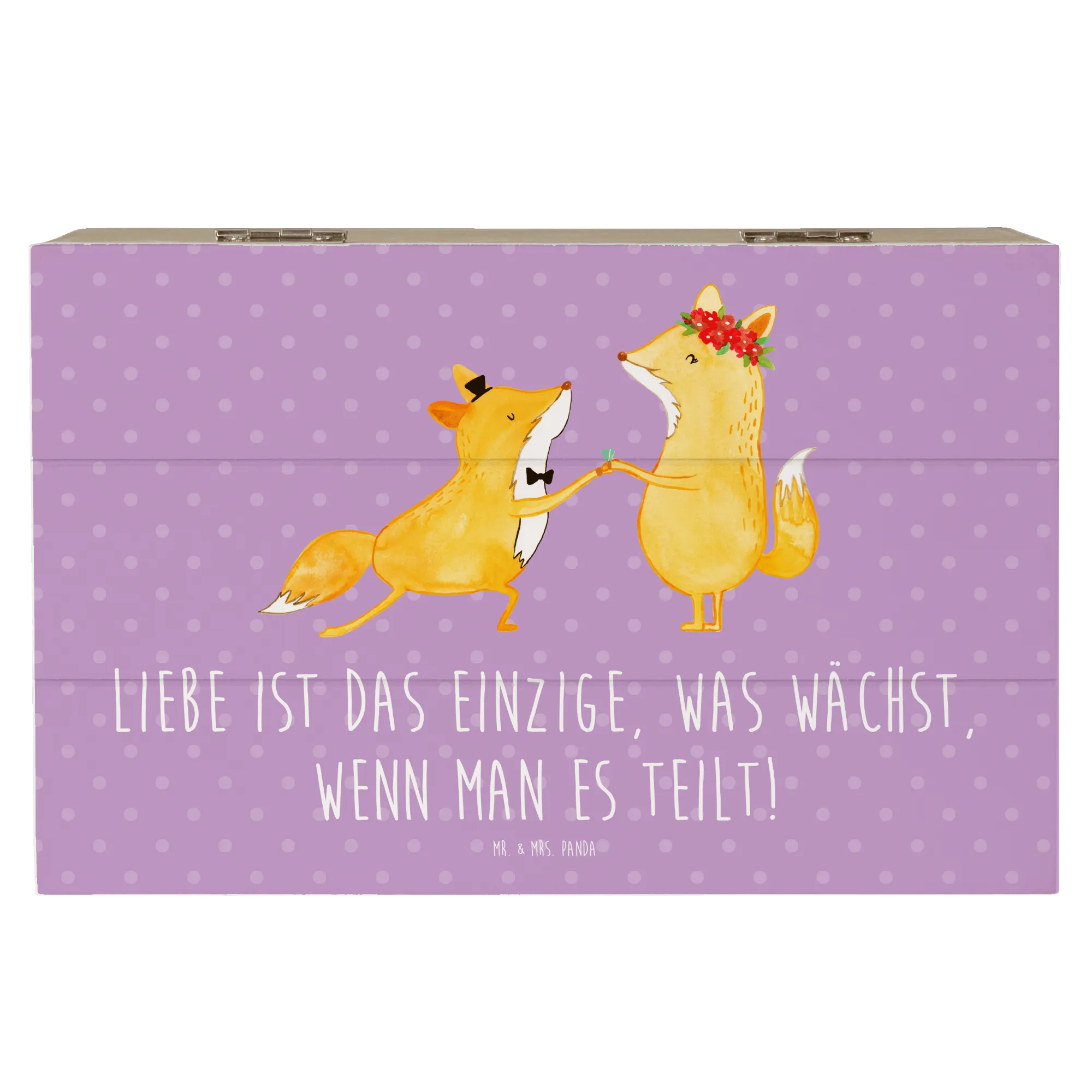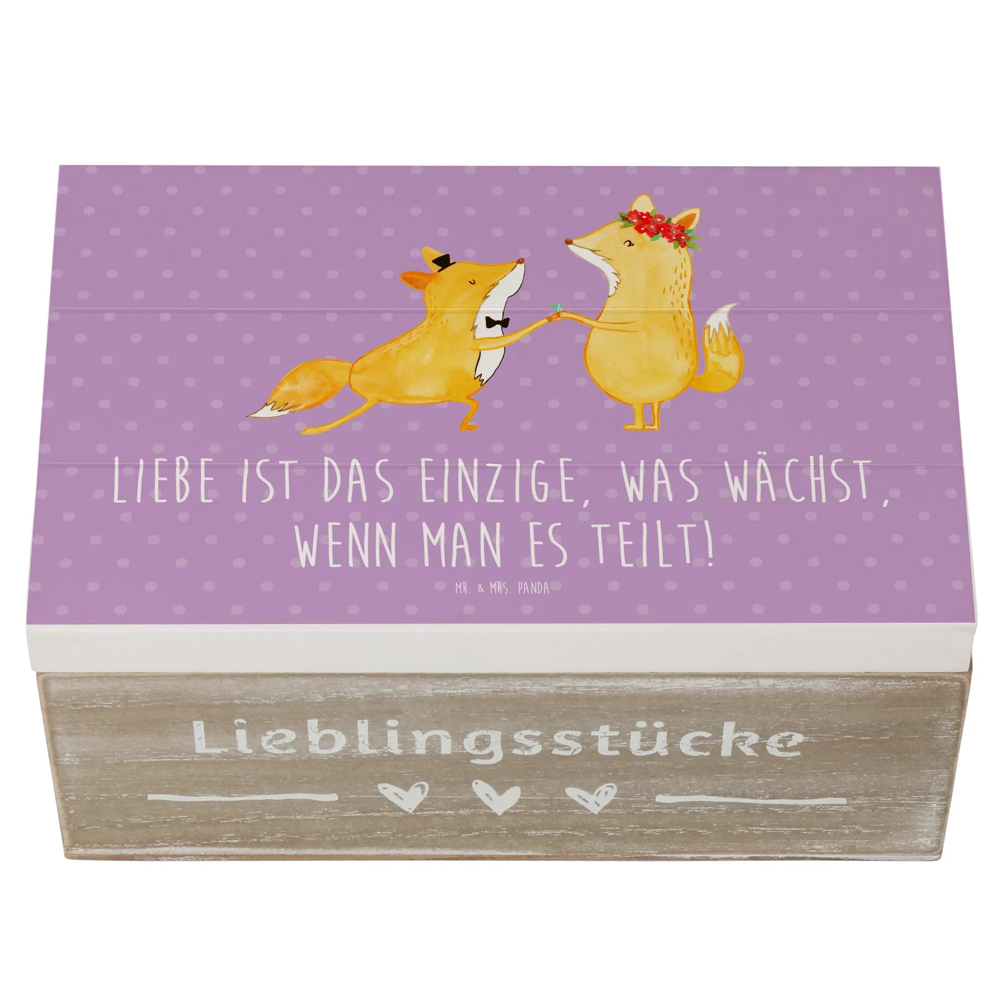 Die wunderschöne Holzkiste "Eheversprechen" von Mr. & Mrs. Panda ist das perfekte Geschenk für jeden, der auf der Suche nach einer romantischen und einzigartigen Aufbewahrungslösung ist. Egal ob für die eigene Hochzeit, als Hochzeitsgeschenk für das Brautpaar oder zur Feier eines besonderen Jahrestages – diese stilvolle Kiste ist genau das Richtige! Mit dem berührenden Spruch "Liebe ist das Einzige, was wächst, wenn man es teilt!" motiviert sie dazu, die schönsten Erinnerungen und Schätze fürs Leben zu bewahren.