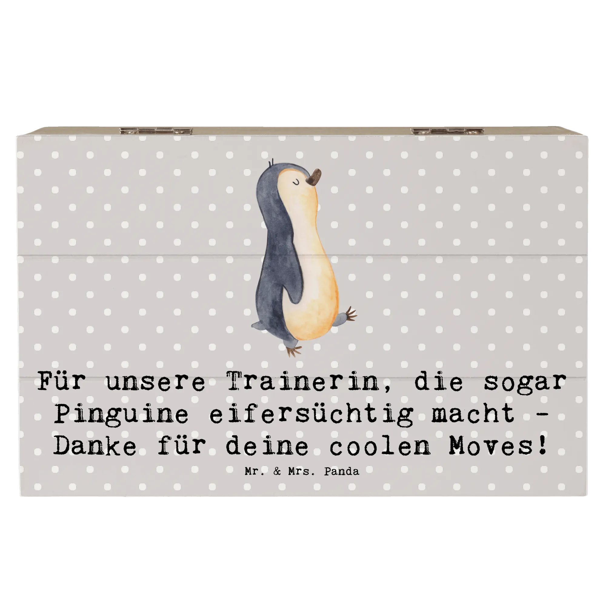 Mit dem süßen Spruch "Für unsere Trainerin, die sogar Pinguine eifersüchtig macht - Danke für deine coolen Moves!" wird jede Trainerin sich besonders wertgeschätzt fühlen. Die Holzkiste hat die Maße 220 mm x 150 mm x 120 mm und das Gewicht von 540 g macht sie nicht nur stabil, sondern auch ideal für eine Vielzahl von Verwendungsmöglichkeiten.
