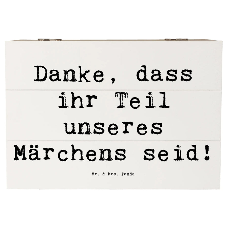 Wenn Du auf der Suche nach einem ganz besonderen Geschenk für den schönsten Tag im Leben bist, dann ist die Holzkiste mit dem süßen Motiv "Gastgeschenke" von Mr. & Mrs. Panda genau das Richtige für Dich! Diese wunderschöne Holzkiste ist mehr als nur eine einfache Erinnerungskiste. Sie ist ein wahrer Schatz, der nicht nur als Aufbewahrungsort für kostbare Erinnerungen dient, sondern auch als stilvolle Dekoration für Deine Hochzeitsfeier. Der liebevolle Spruch "Danke, dass ihr Teil unseres Märchens seid!" bringt das Gefühl von Verbundenheit und Dankbarkeit perfekt zum Ausdruck und macht sie zu einem unvergesslichen Geschenk für das Brautpaar und alle Gäste.