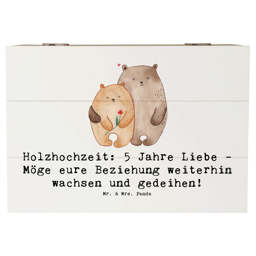 Die zauberhafte Holzkiste von Mr. & Mrs. Panda ist das perfekte Geschenk für den 5. Hochzeitstag, auch Holzhochzeit genannt! Mit dem liebevollen Spruch "Holzhochzeit: 5 Jahre Liebe - Möge eure Beziehung weiterhin wachsen und gedeihen!" bringt sie eine ganz besondere Note in eure Feier.