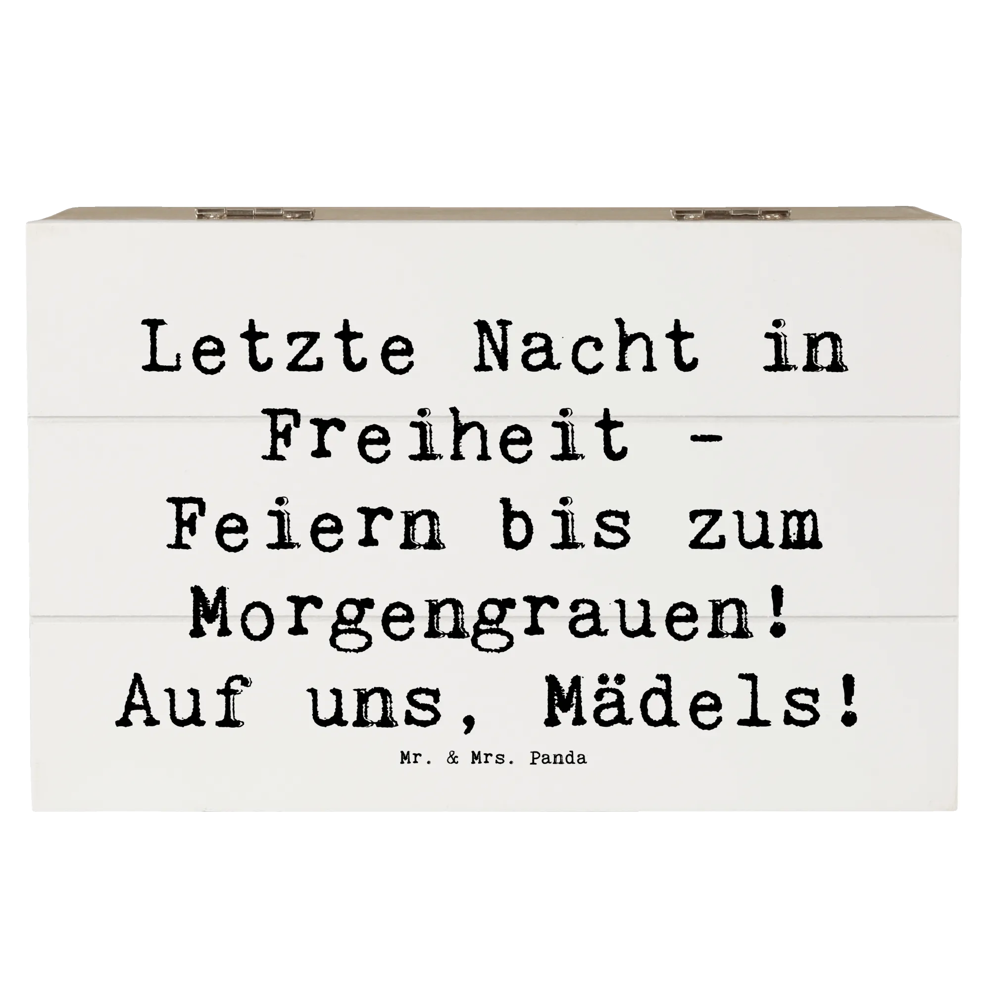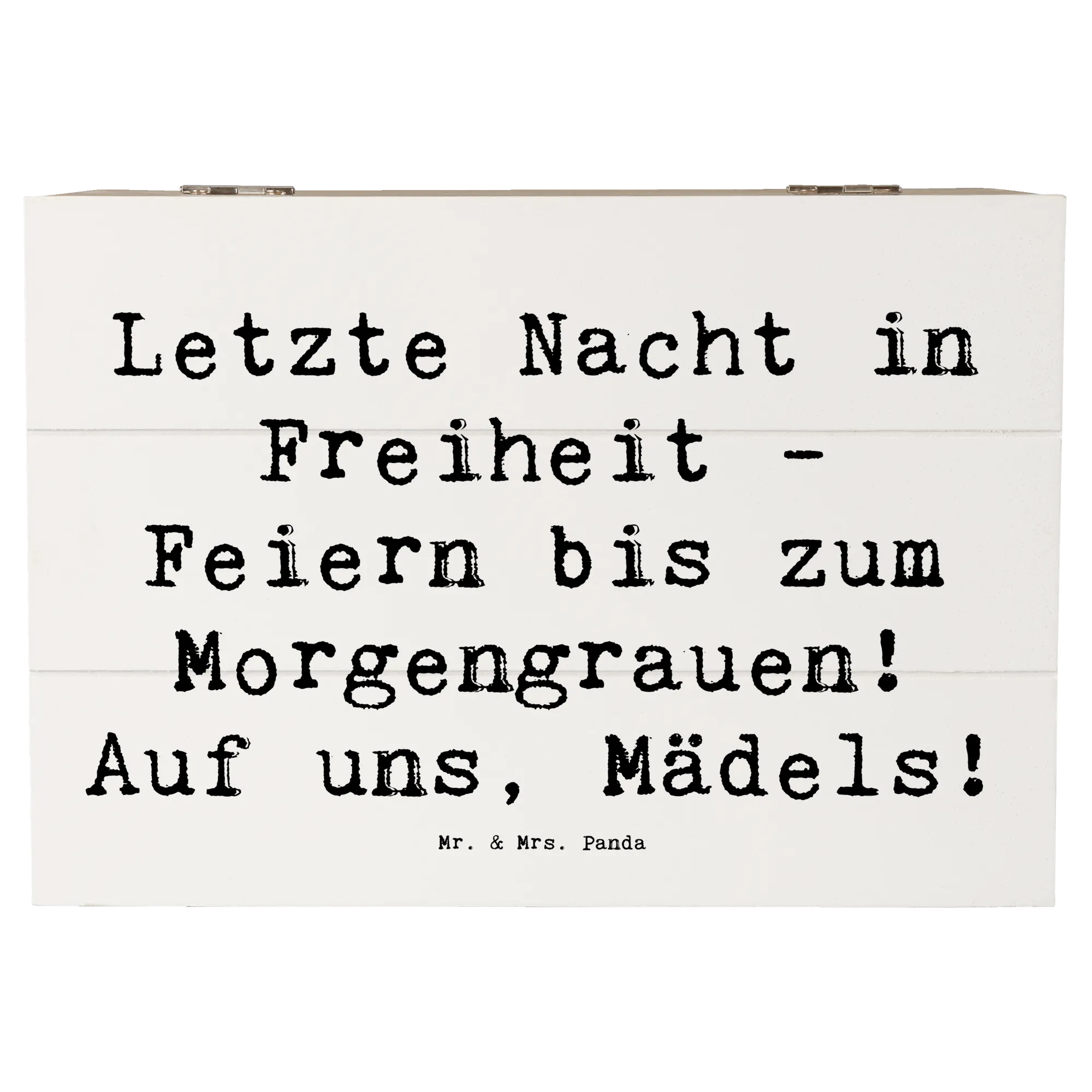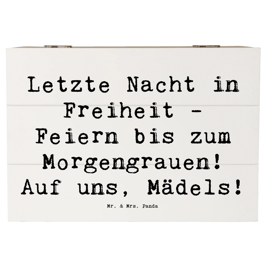 Du suchst das perfekte Geschenk für einen Junggesellinnenabschied? Unsere wunderschöne Holzkiste von Mr. & Mrs. Panda ist genau das Richtige! Mit dem motivierenden Spruch „Letzte Nacht in Freiheit - Feiern bis zum Morgengrauen! Auf uns, Mädels!“ ist diese Erinnerungskiste genau richtig, um die unvergesslichen Momente des Abends festzuhalten.