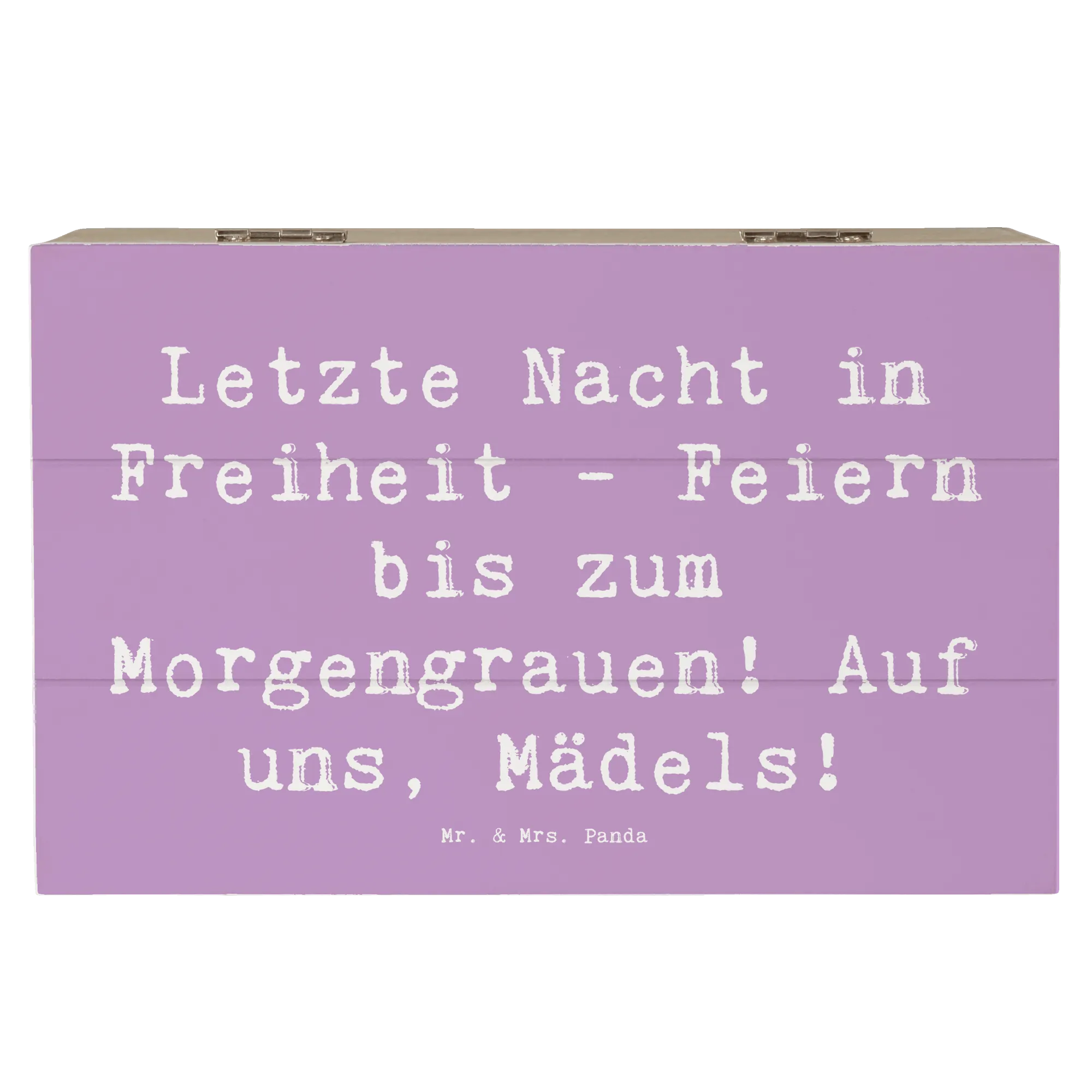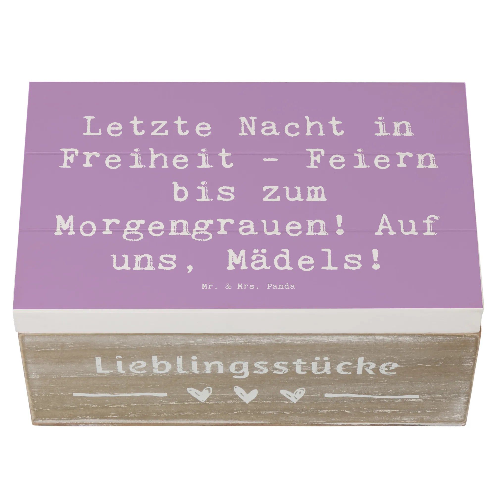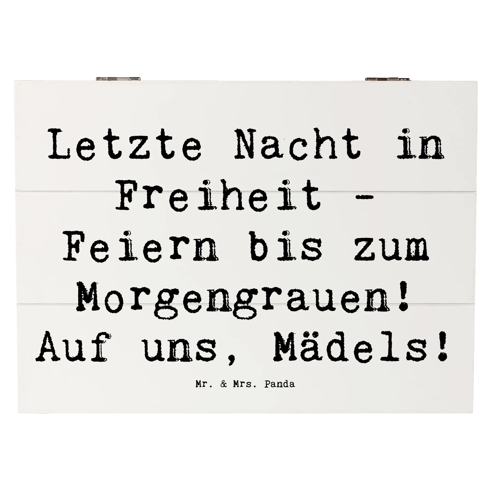 Du suchst das perfekte Geschenk für einen Junggesellinnenabschied? Unsere wunderschöne Holzkiste von Mr. & Mrs. Panda ist genau das Richtige! Mit dem motivierenden Spruch „Letzte Nacht in Freiheit - Feiern bis zum Morgengrauen! Auf uns, Mädels!“ ist diese Erinnerungskiste genau richtig, um die unvergesslichen Momente des Abends festzuhalten.