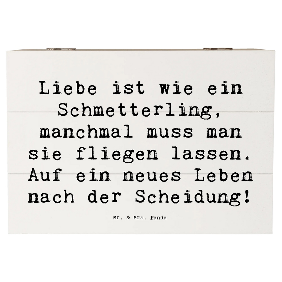 Die wunderschöne Holzkiste von Mr. & Mrs. Panda ist der perfekte Begleiter für all die kostbaren Erinnerungen, die du in deinem Leben gesammelt hast. Mit ihrem bezaubernden Motif 'Liebe ist wie ein Schmetterling, manchmal muss man sie fliegen lassen. Auf ein neues Leben nach der Scheidung!' ist diese Erinnerungskiste nicht nur ein Aufbewahrungsort für deine Schätze, sondern auch ein wunderbares Geschenk zu besonderen Anlässen.