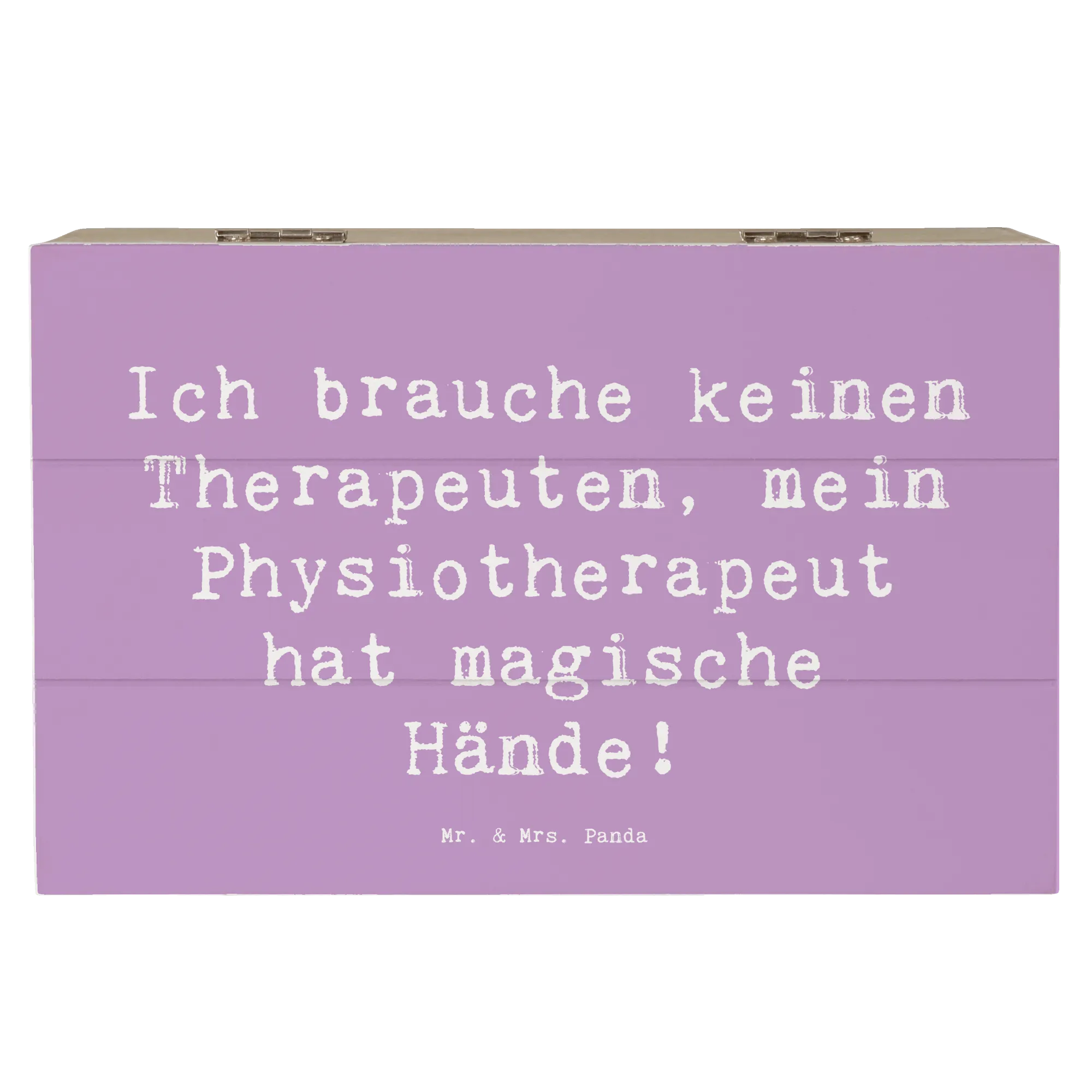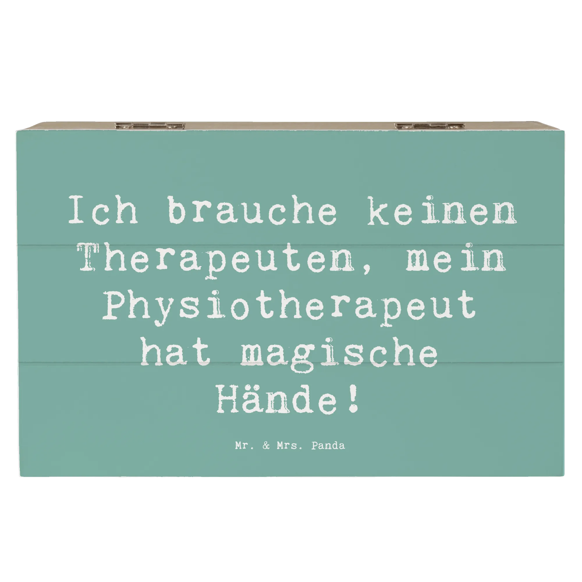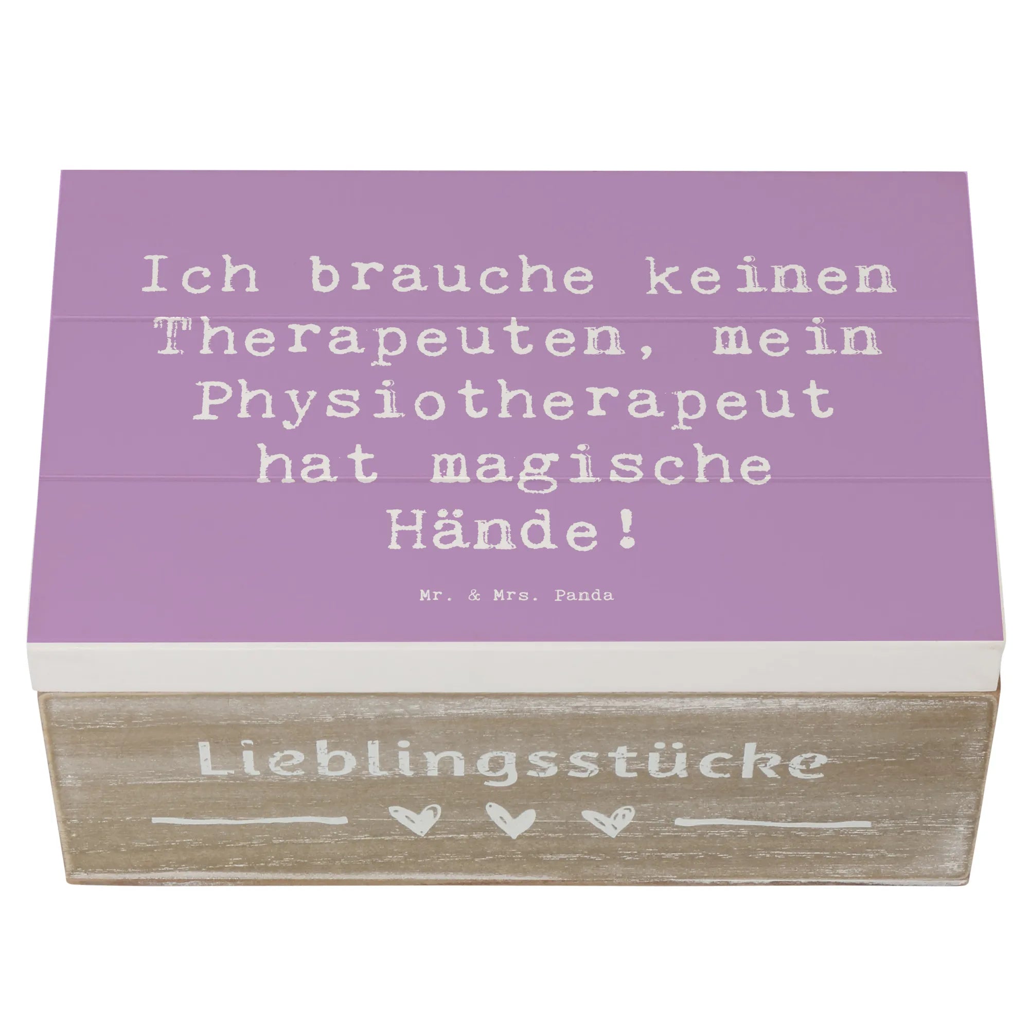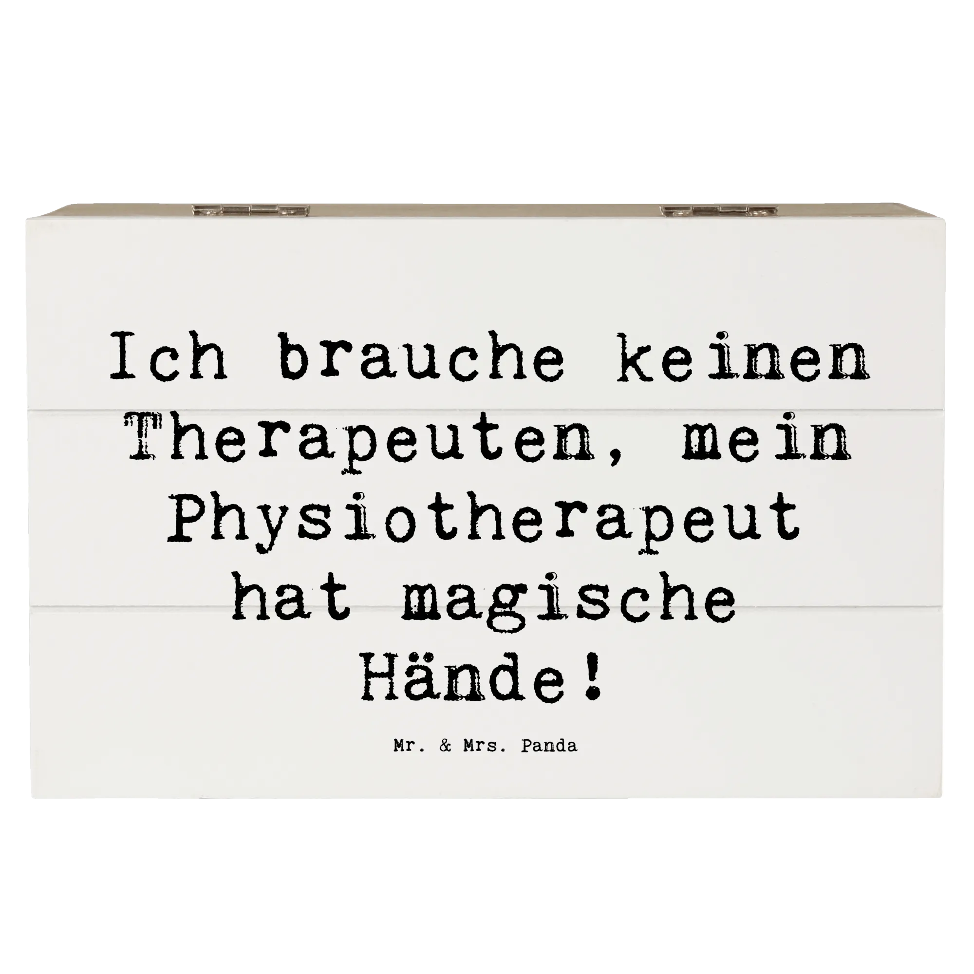 Diese zauberhafte Holzkiste von Mr. & Mrs. Panda vereint Humor, Design und praktischen Nutzen. Auf dem Deckel steht der liebevolle Spruch „Ich brauche keinen Therapeuten, mein Physiotherapeut hat magische Hände!“, umrahmt von einem handgezeichneten Aquarellmotiv von Mrs. Panda. Eine ideale Aufbewahrungsbox und zugleich ein persönliches Dankeschön.
