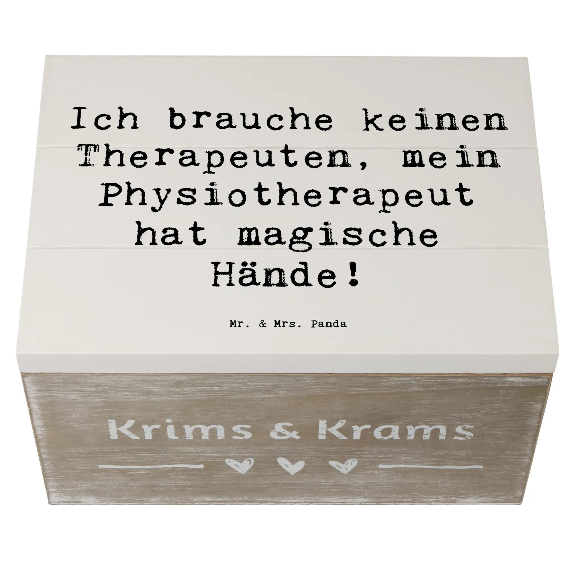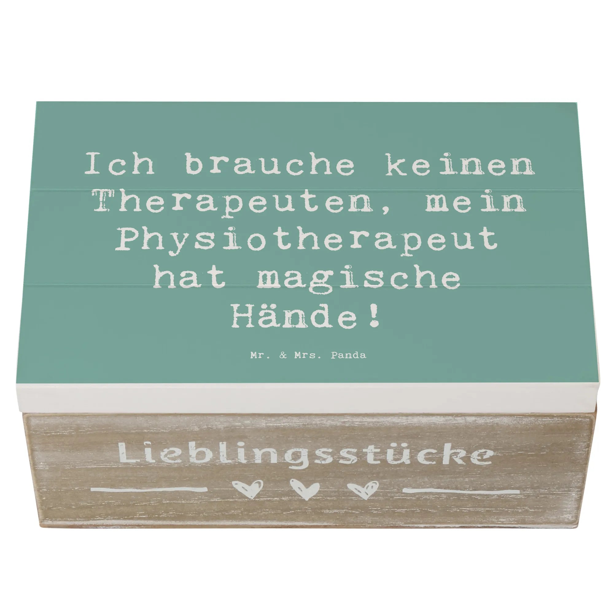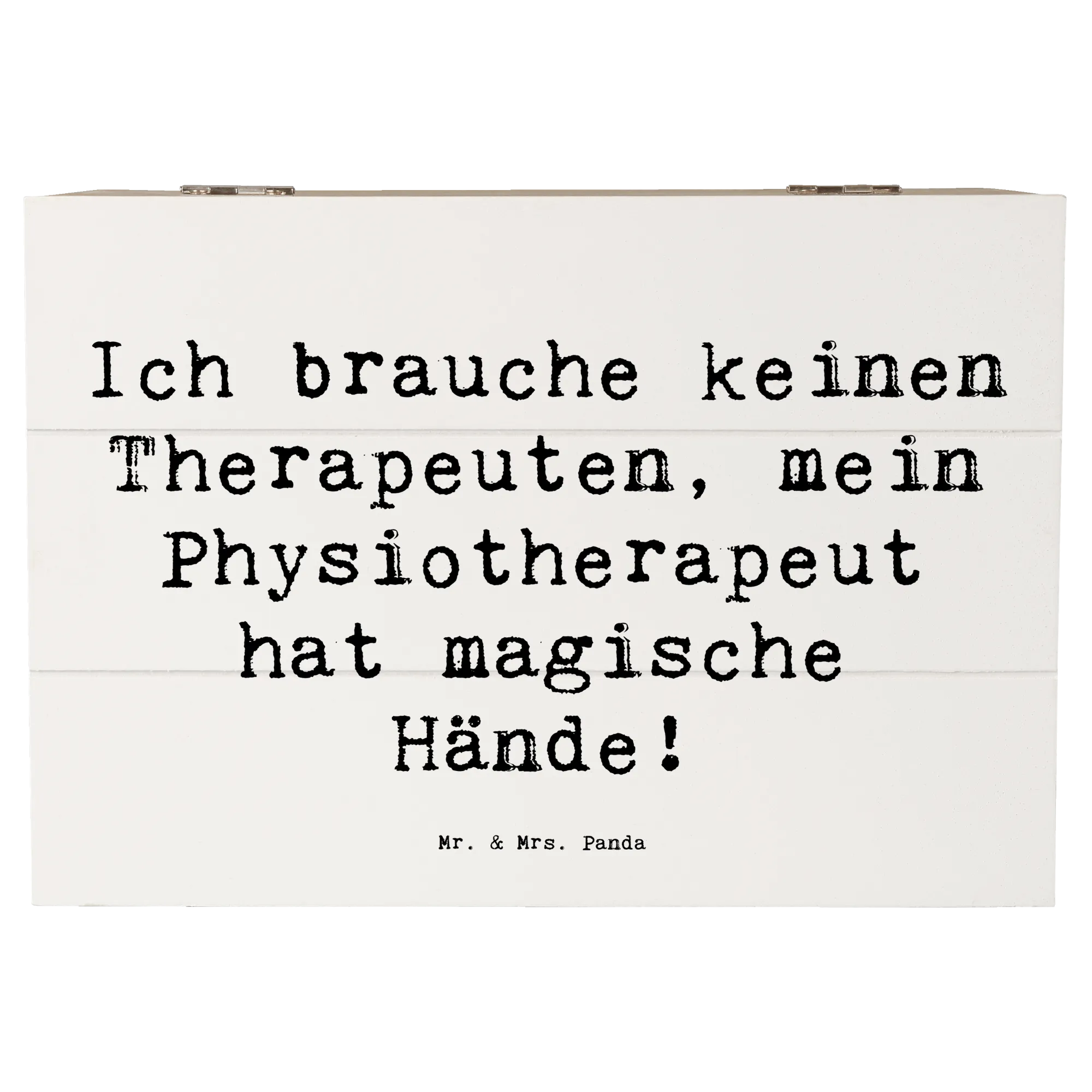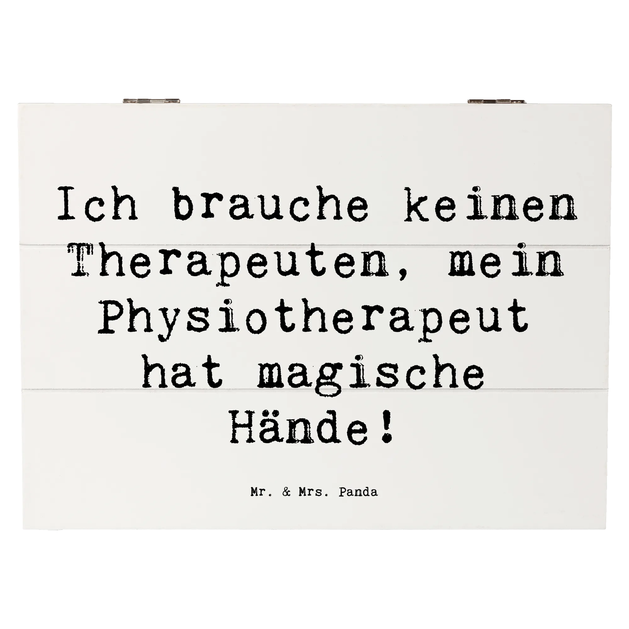 Diese zauberhafte Holzkiste von Mr. & Mrs. Panda vereint Humor, Design und praktischen Nutzen. Auf dem Deckel steht der liebevolle Spruch „Ich brauche keinen Therapeuten, mein Physiotherapeut hat magische Hände!“, umrahmt von einem handgezeichneten Aquarellmotiv von Mrs. Panda. Eine ideale Aufbewahrungsbox und zugleich ein persönliches Dankeschön.