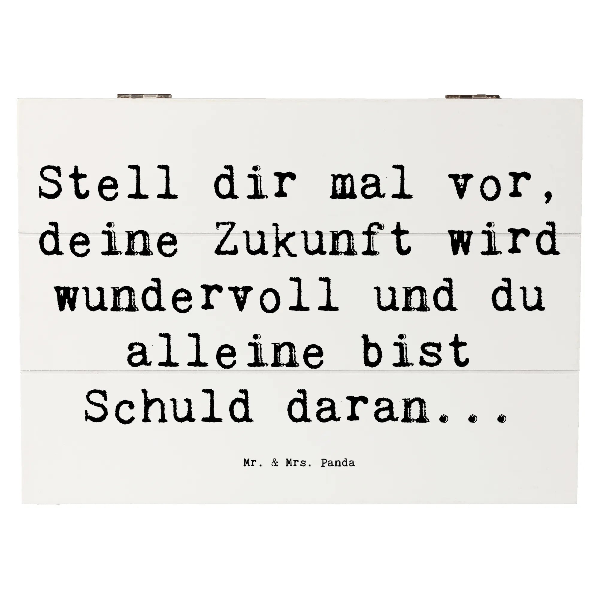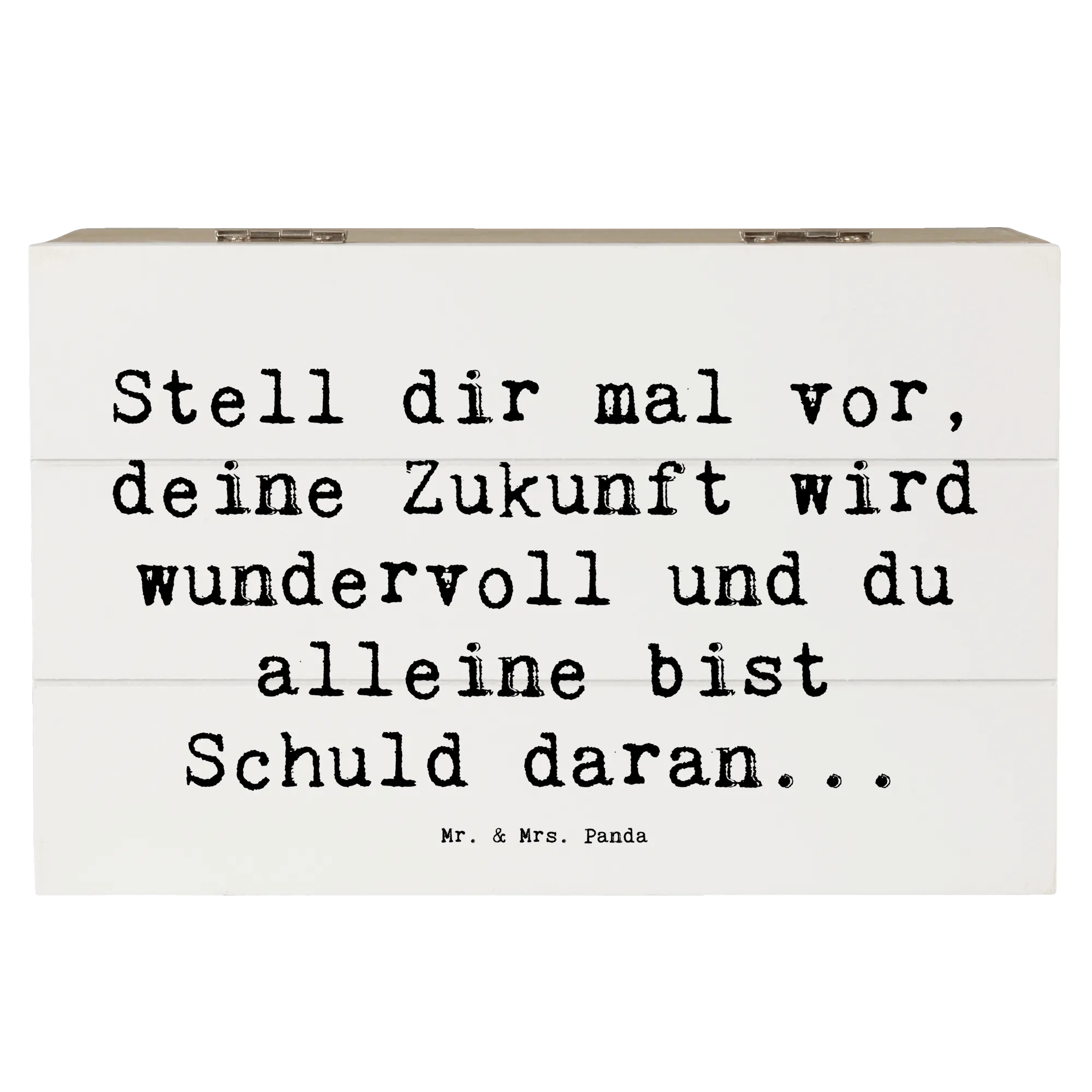 Hergestellt aus robuster Premium Hartfaser, bietet diese wunderschöne Holzkiste nicht nur Stabilität, sondern ist auch äußerst langlebig und wasserabweisend. Mit ihren praktischen Einschlagscharnieren lässt sie sich kinderleicht öffnen und schließen, sodass du jederzeit Zugriff auf deine wertvollsten Schätze hast. Das besondere Design mit dem aufgedruckten Motto "Stell dir mal vor, deine Zukunft wird wundervoll und du alleine bist Schuld daran..." aus der Mutmacher-Kollektion schenkt dir jeden Tag einen kleinen Moment der Zuversicht und des Trostes.