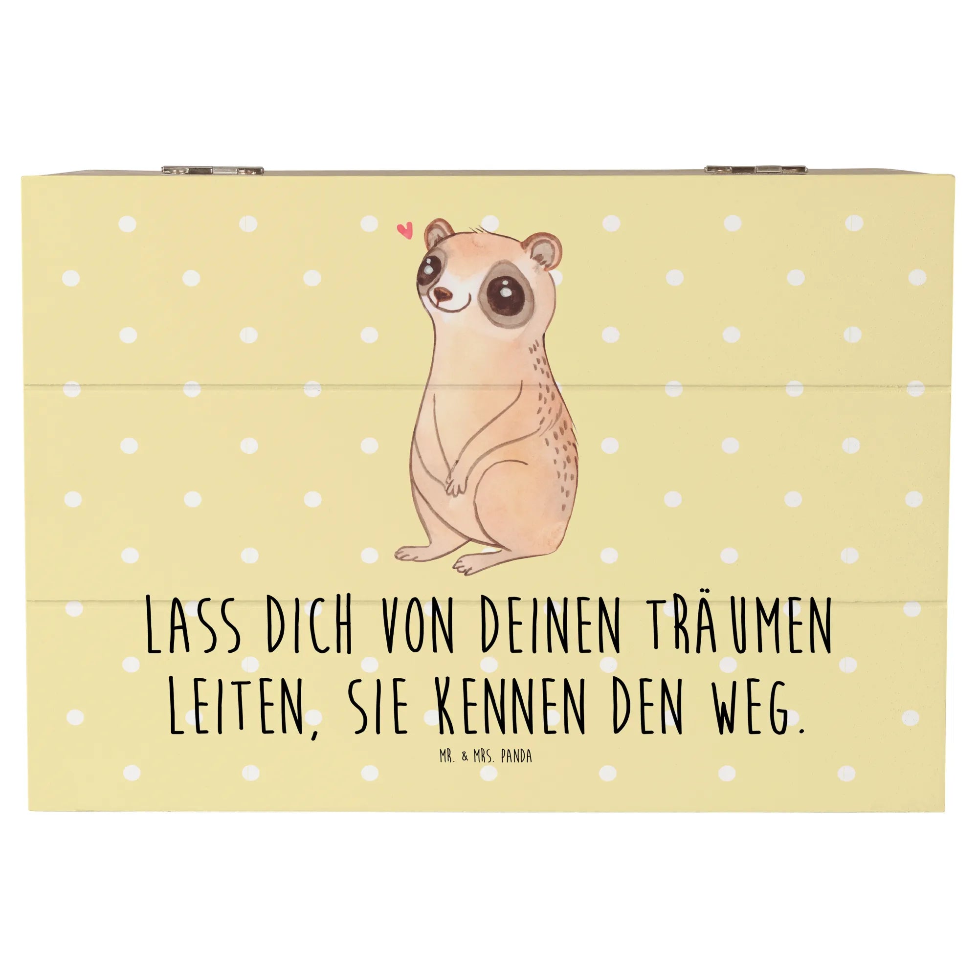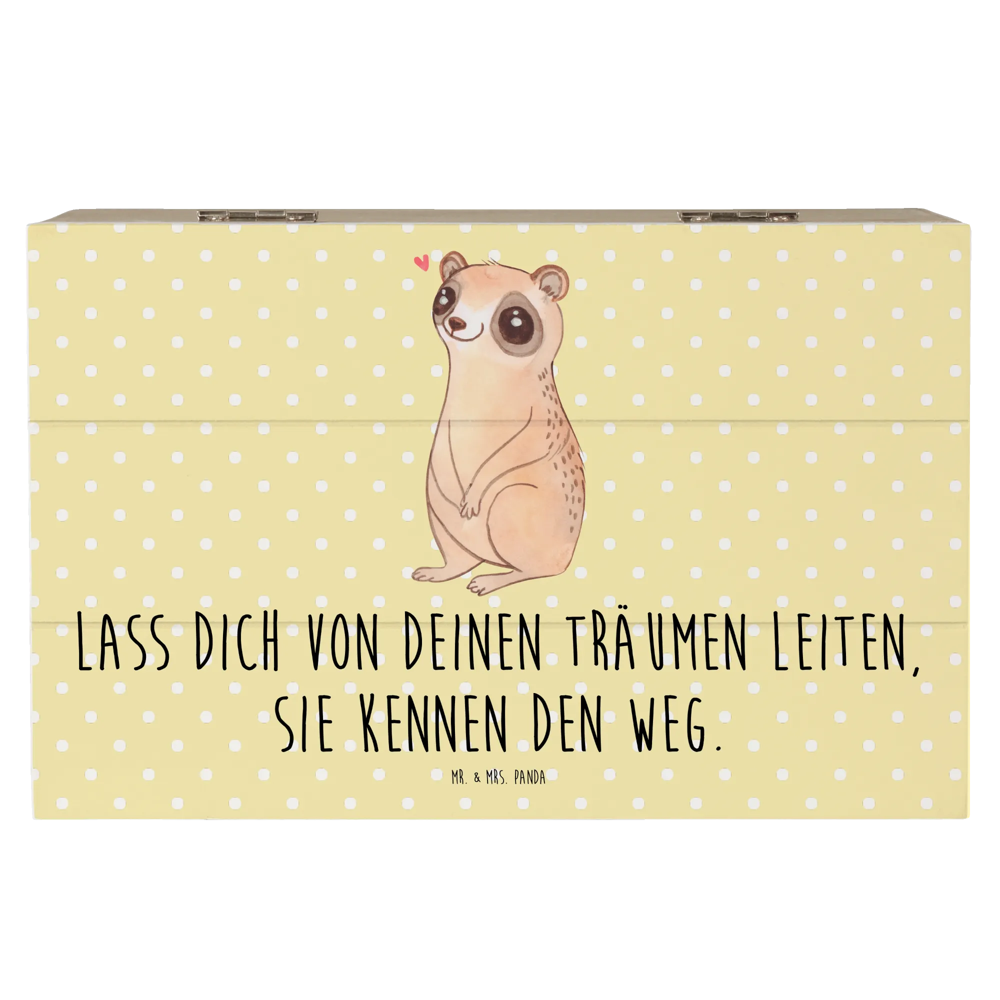 Hergestellt aus robuster Premium Hartfaser und umgeben von einem strahlenden, pastellgelben Design, bringt die Kiste nicht nur Farbe in jeden Raum, sondern ist auch besonders stabil und langlebig. Die liebevolle Gestaltung zeigt einen süßen Plumplori, der glücklich in die Welt blickt und mit seinen großen, strahlenden Augen jeden Betrachter verzaubert. Der Spruch 'Lass dich von deinen Träumen leiten, sie kennen den Weg' erinnert uns daran, immer an unsere Ziele zu glauben und unseren Träumen zu folgen.