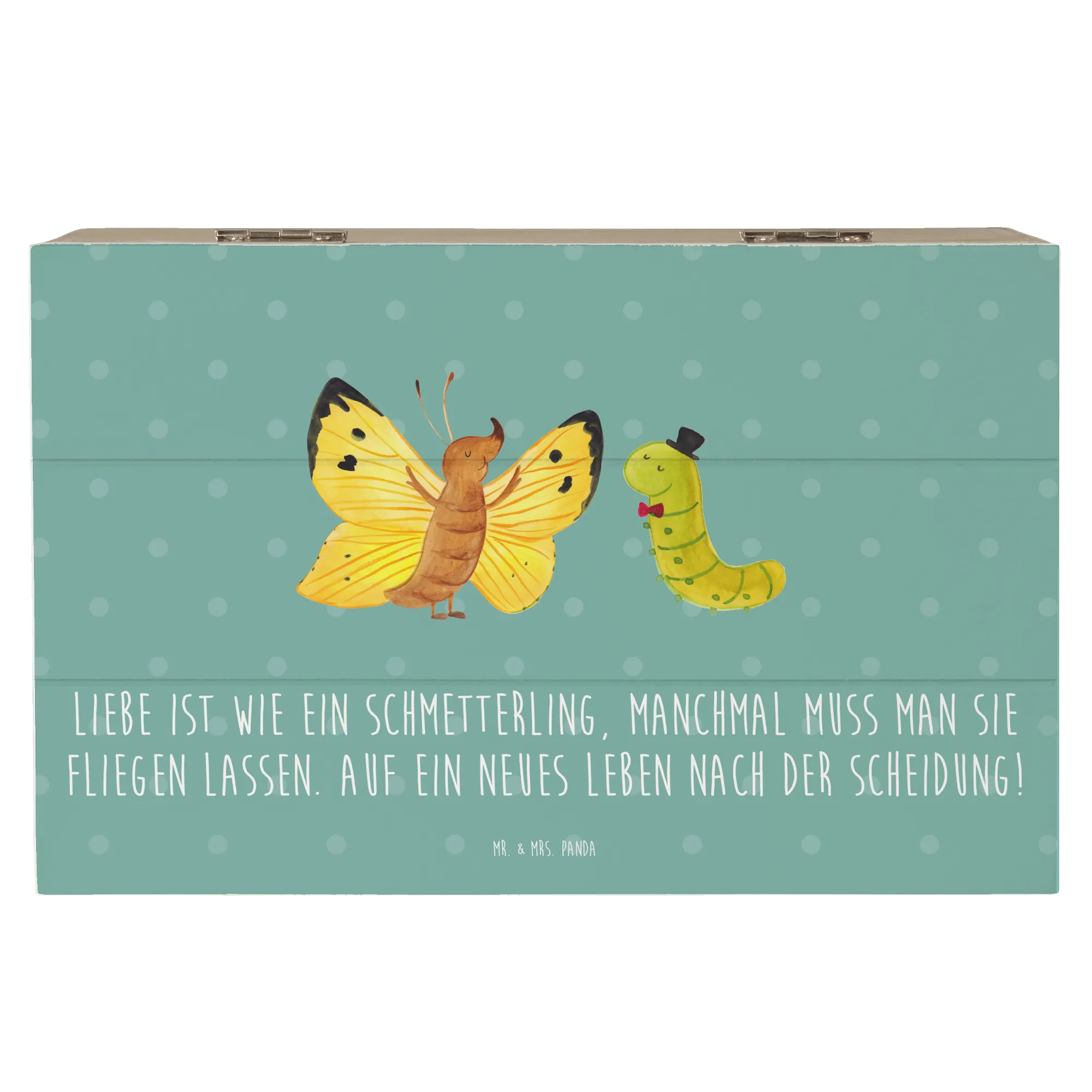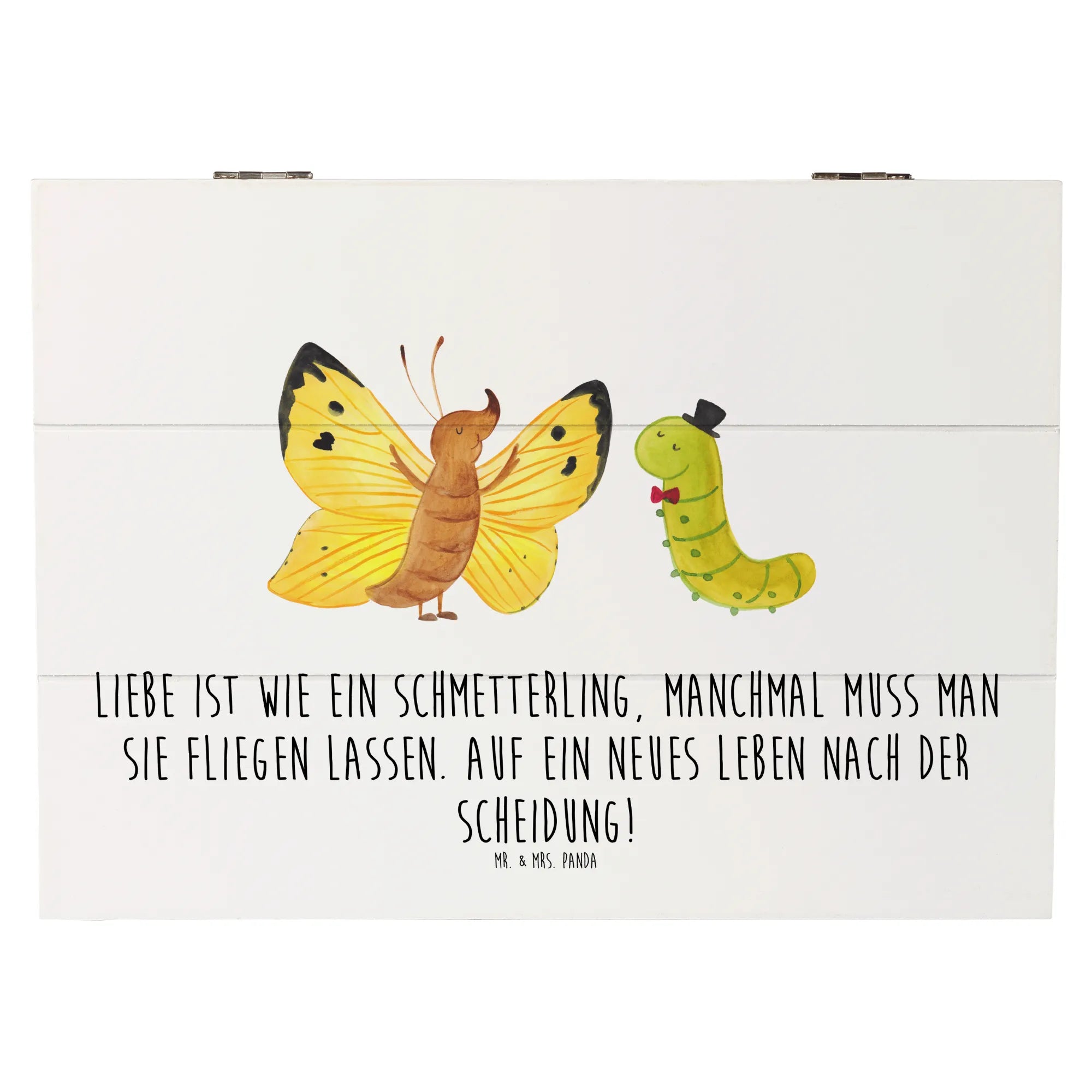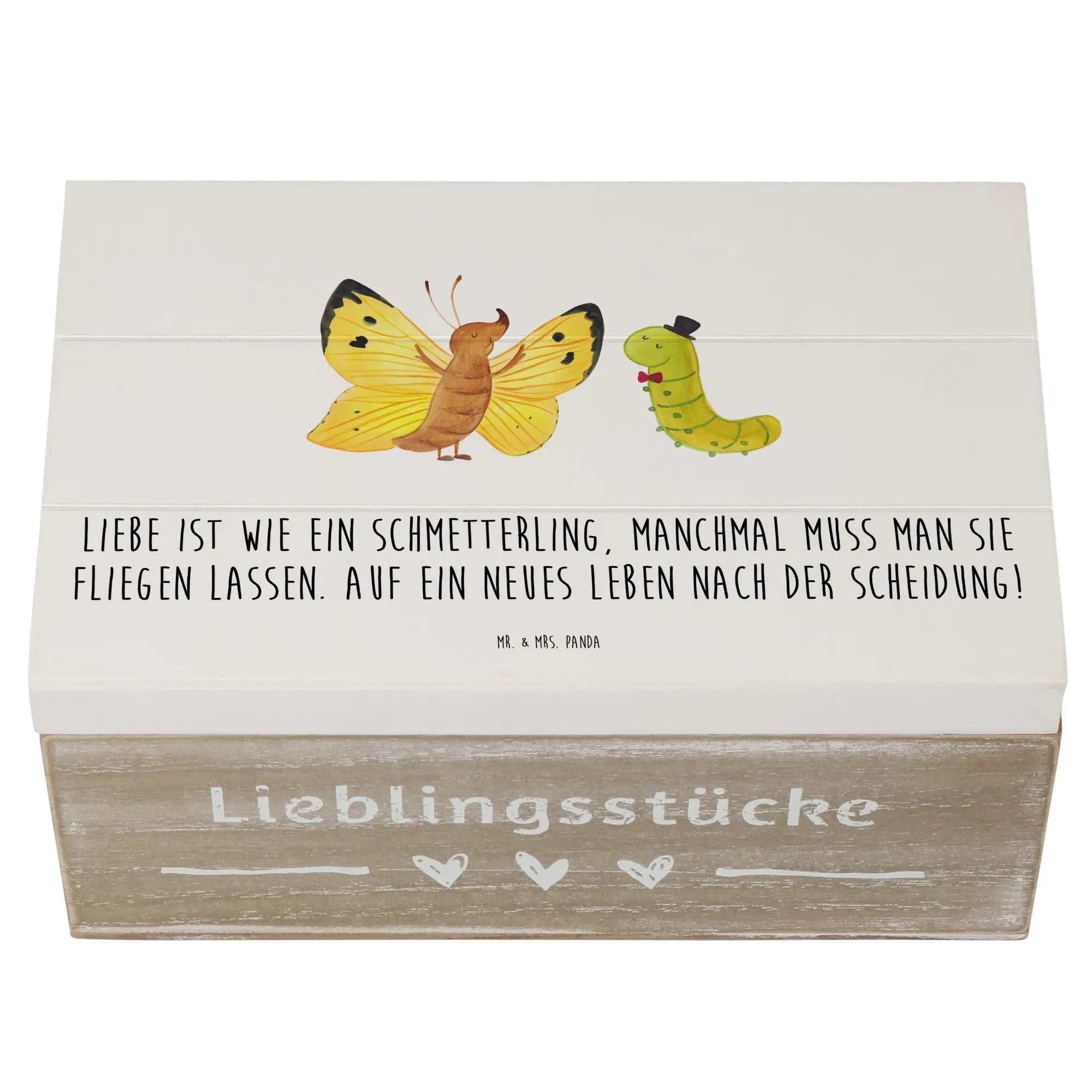 Die wunderschöne Holzkiste von Mr. & Mrs. Panda ist die perfekte Aufbewahrungsbox für all die besonderen Momente in deinem Leben. Diese Erinnerungskiste, bedruckt mit dem Slogan 'Liebe ist wie ein Schmetterling, manchmal muss man sie fliegen lassen. Auf ein neues Leben nach der Scheidung!', eignet sich hervorragend als Geschenk zur Scheidung oder als tolles Andenken an eine Hochzeit. Ob für Fotos, liebevolle Erinnerungen oder andere Schätze - diese Dekokiste bietet dir nicht nur die Möglichkeit, deine Erinnerungen sicher aufzubewahren, sondern sieht dabei auch wunderschön aus!