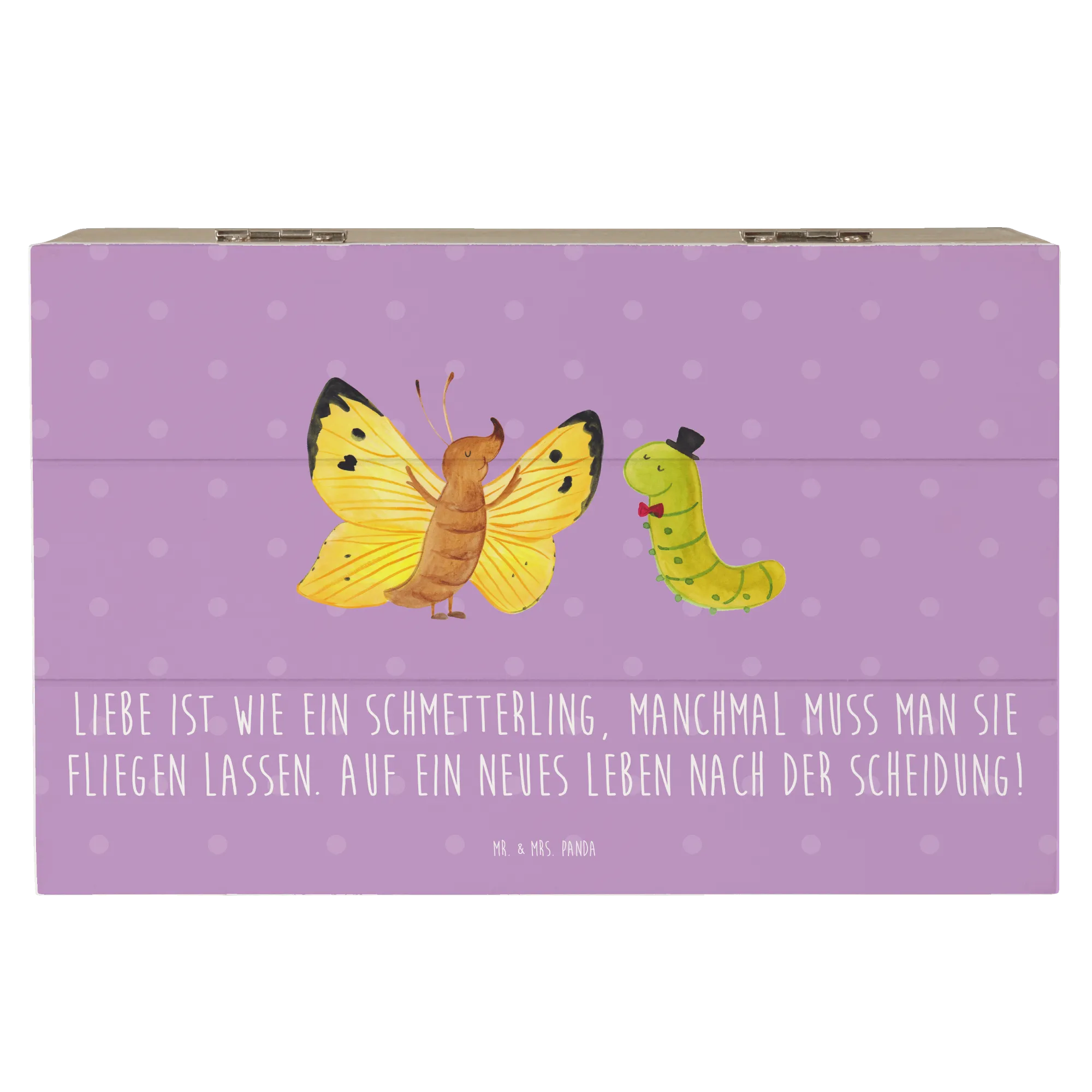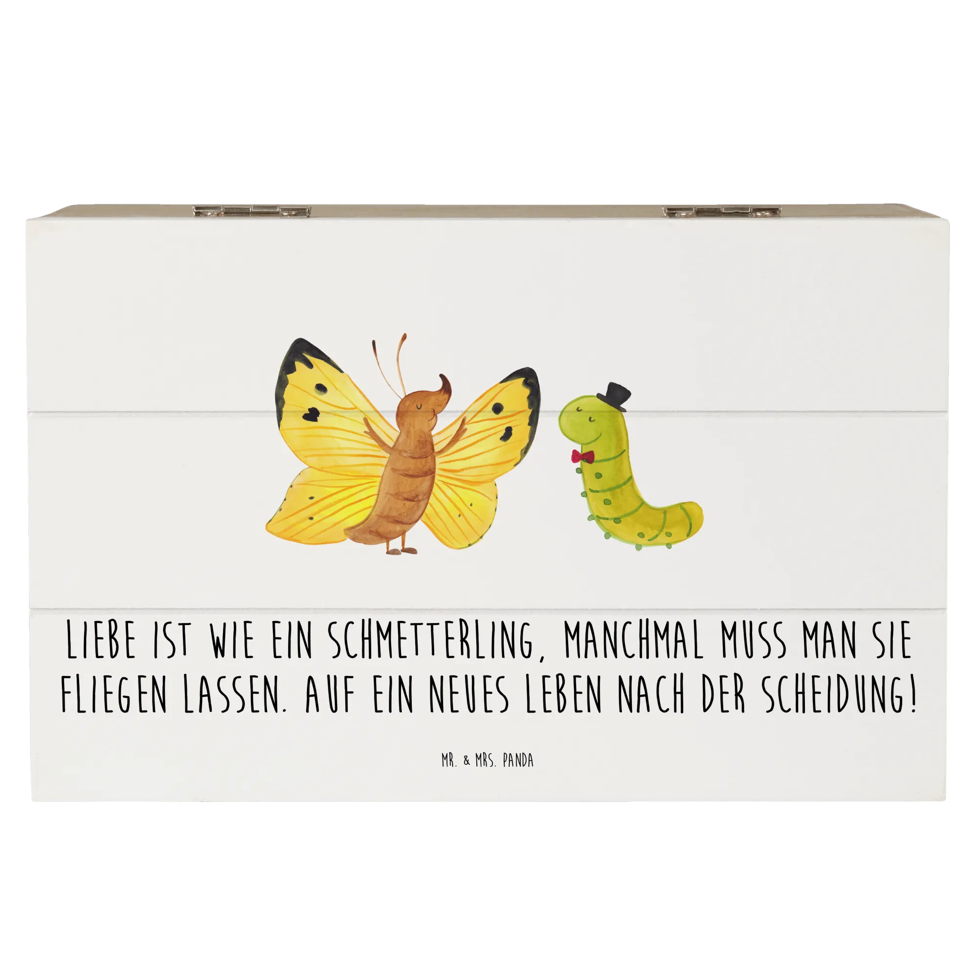 Entdecke die wundervolle Holzkiste von Mr. & Mrs. Panda, die nicht nur ein stilvolles Aufbewahrungselement ist, sondern auch ein bedeutungsvolles Geschenk für besondere Anlässe! Bedruckt mit einem berührenden Spruch, "Liebe ist wie ein Schmetterling, manchmal muss man sie fliegen lassen. Auf ein neues Leben nach der Scheidung!", ist diese entzückende Erinnerungskiste perfekt für Menschen, die einen Neuanfang nach einer Scheidung feiern möchten.