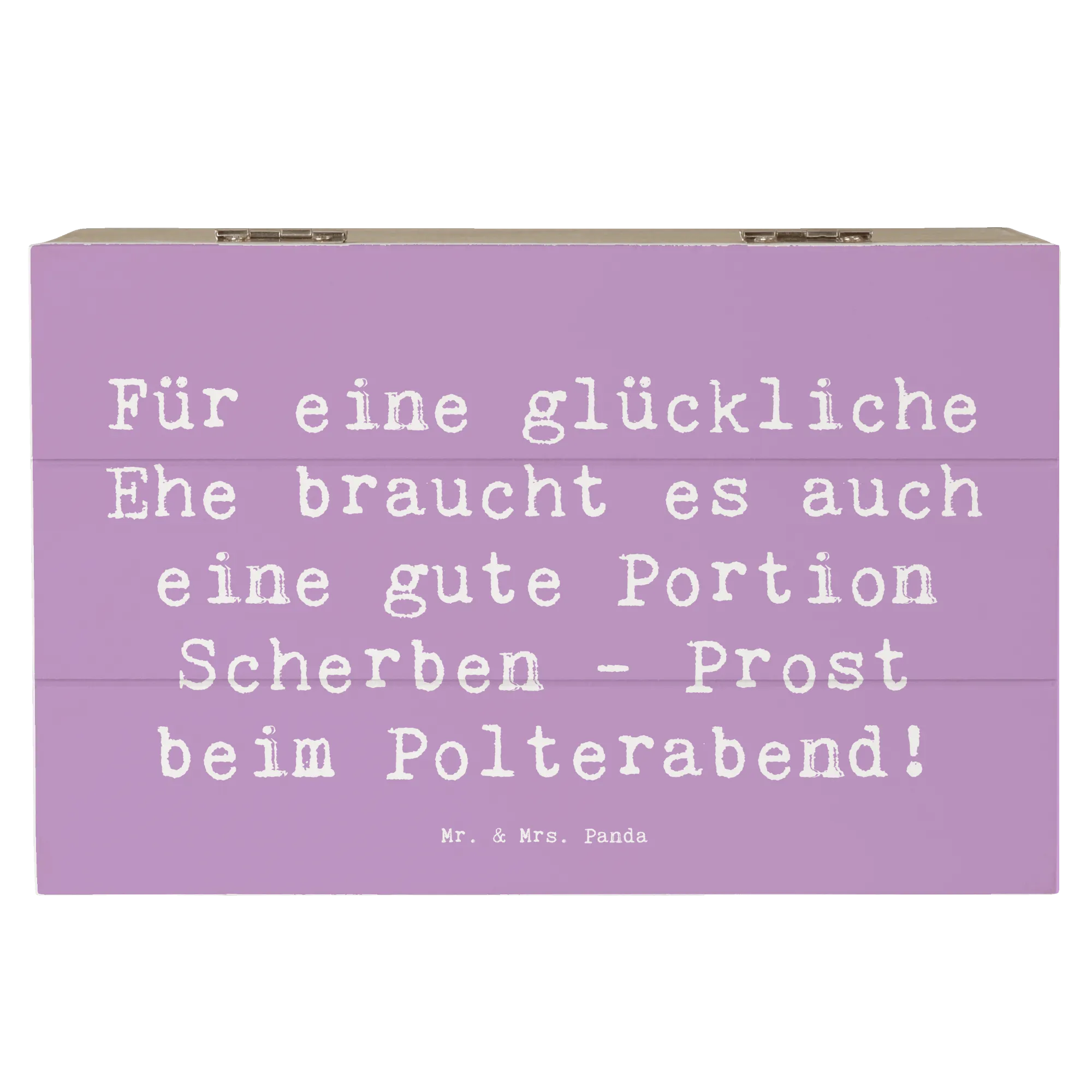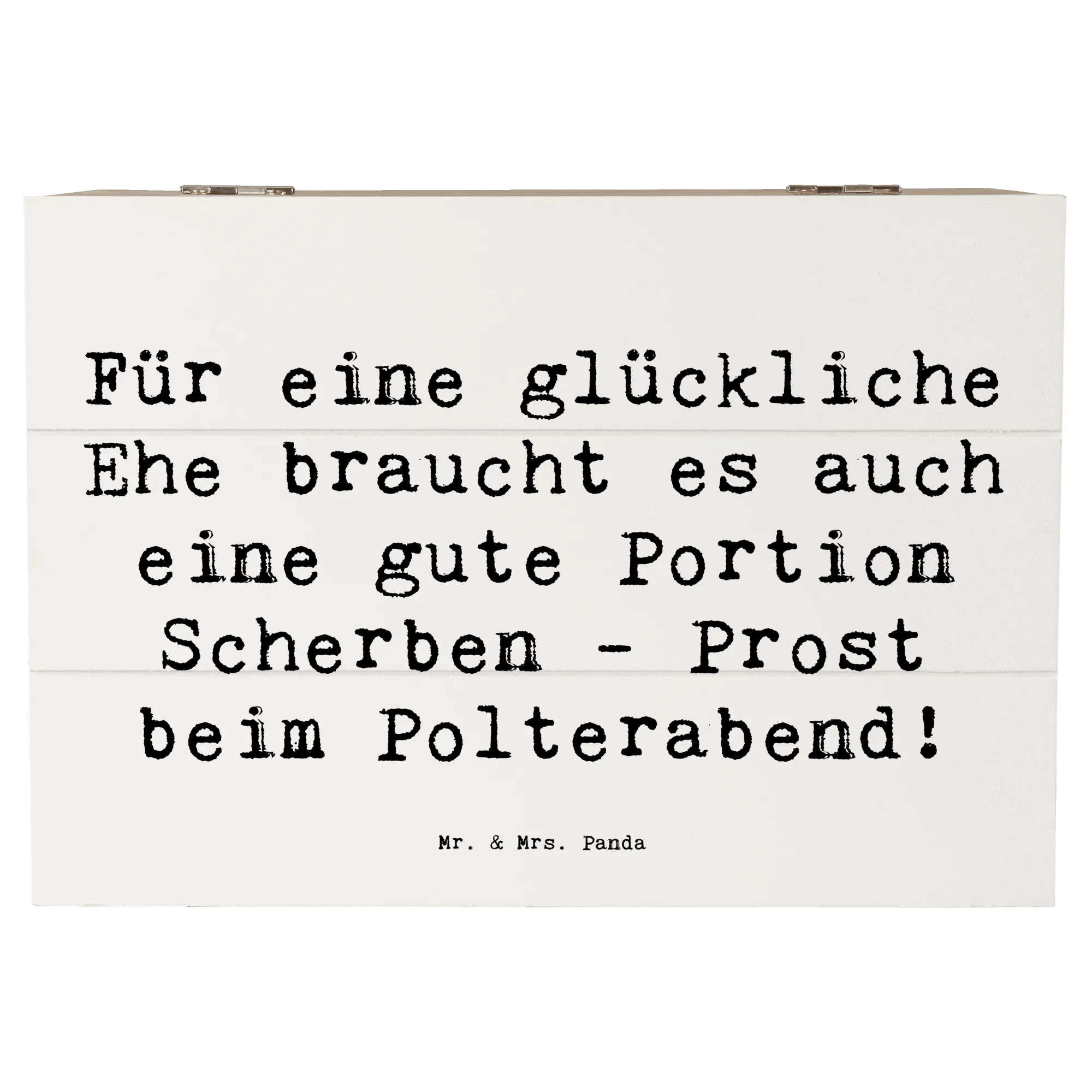 Mit einem liebevollen Spruch 'Für eine glückliche Ehe braucht es auch eine gute Portion Scherben - Prost beim Polterabend!' sorgt die Kiste für ein Lächeln auf den Gesichtern der Beschenkten. Die robuste Holzfaser sorgt für Stabilität und Langlebigkeit, während die praktischen Einschlagscharniere ein einfaches Öffnen und Schließen ermöglichen.