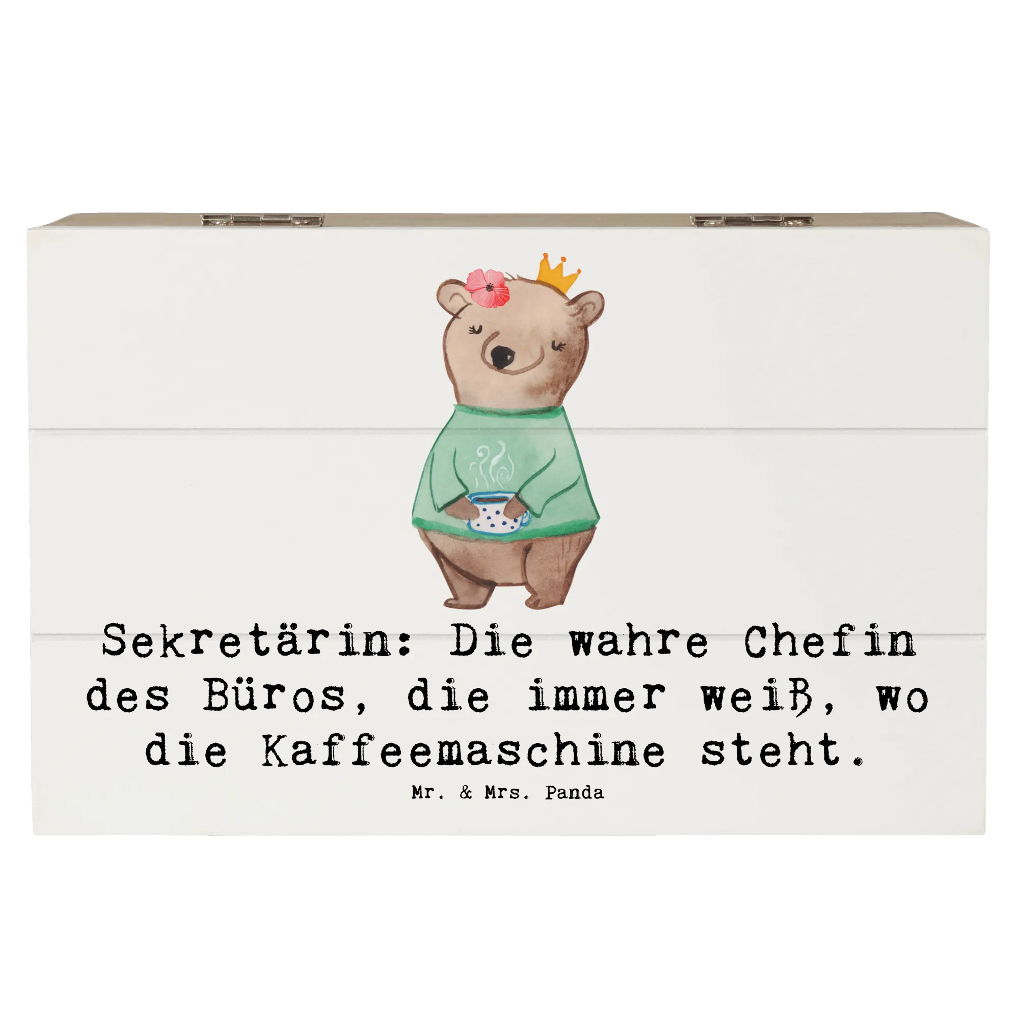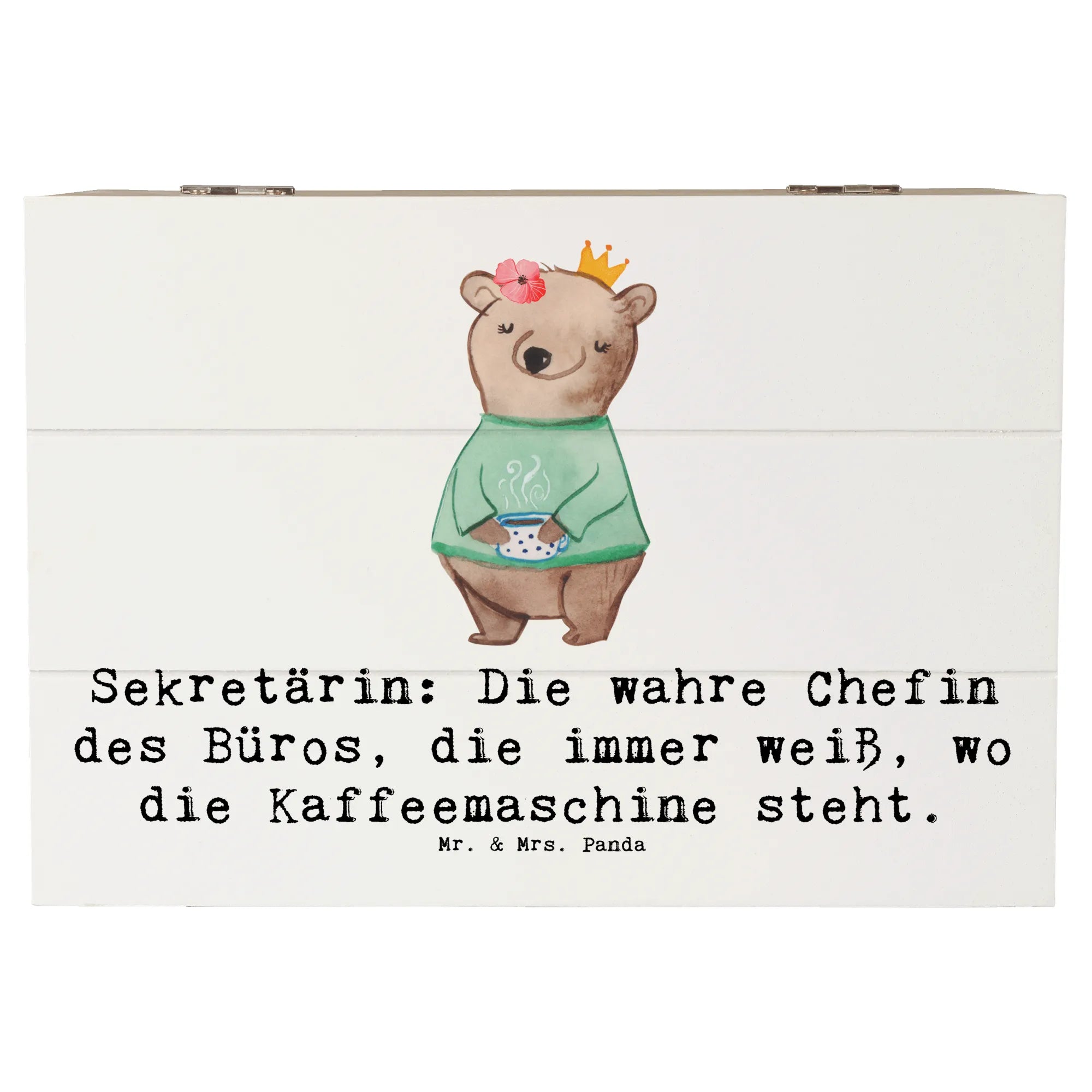 Die wunderschöne Holzkiste von Mr. & Mrs. Panda ist das perfekte Geschenk für alle Sekretärinnen, die im Büro das Sagen haben. Mit dem liebevollen Spruch "Sekretärin: Die wahre Chefin des Büros, die immer weiß, wo die Kaffeemaschine steht." zauberst Du jedem ein Lächeln ins Gesicht. Diese Kiste ist ideal, um persönliche Schätze, Erinnerungen und schöne Momente aufzubewahren.
