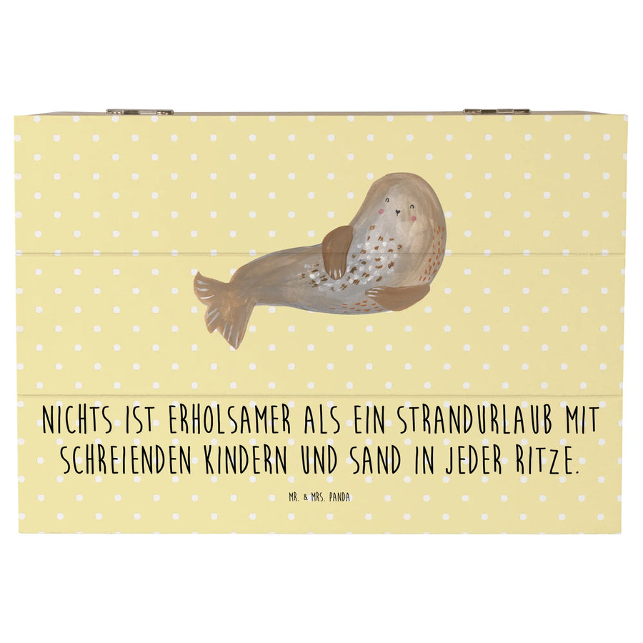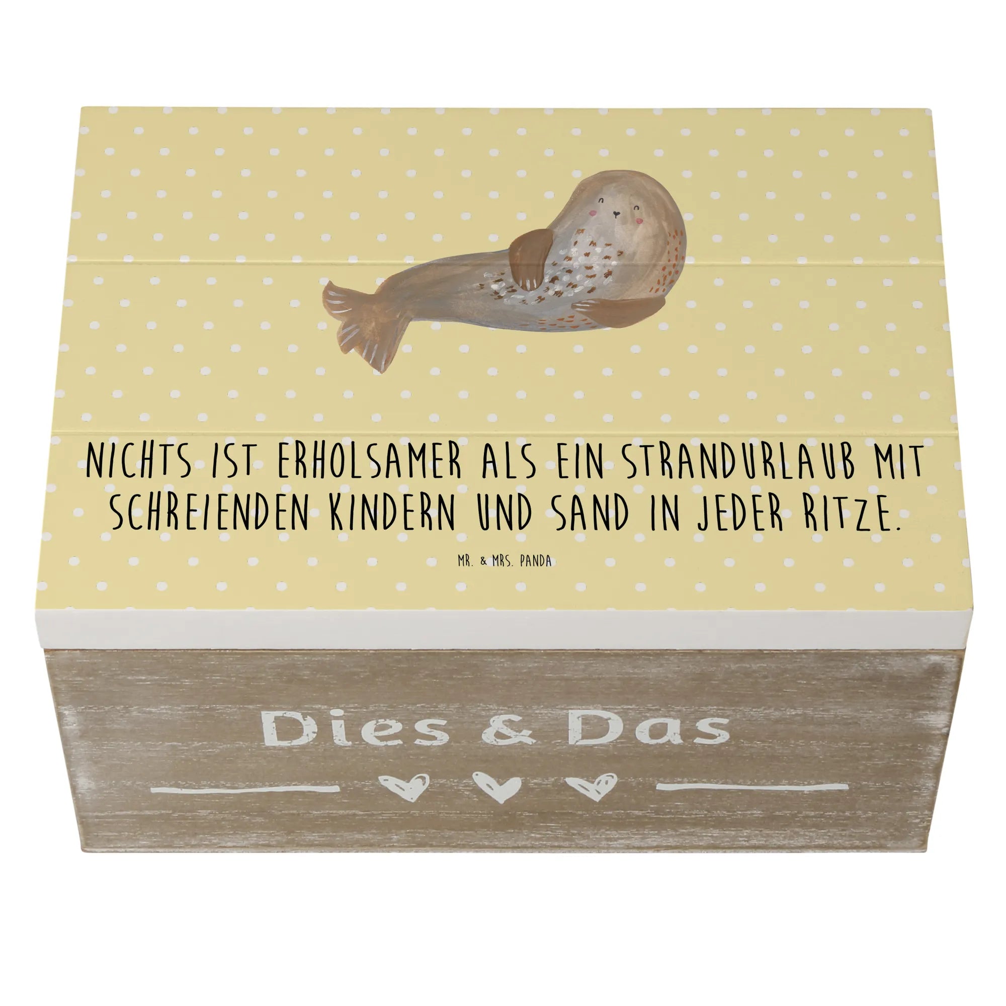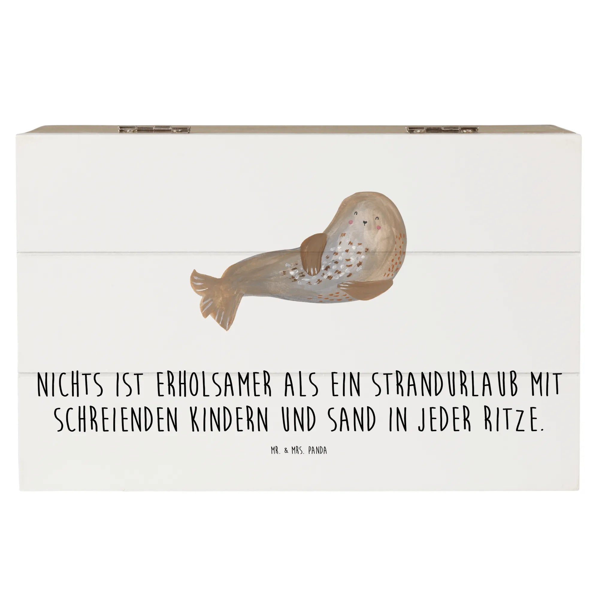 Die wunderschöne Holzkiste von Mr. & Mrs. Panda ist nicht nur ein praktischer Aufbewahrungsort, sondern auch ein echtes Schmuckstück für deine Erinnerungen! Mit einem zauberhaften Sommer-Motiv und dem witzigen Spruch 'Nichts ist erholsamer als ein Strandurlaub mit schreienden Kindern und Sand in jeder Ritze.' bringt diese Kiste pures Sommergefühl in dein Zuhause.