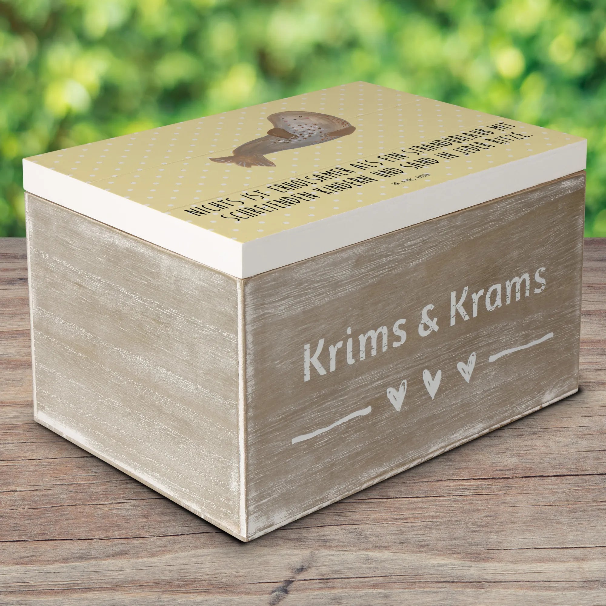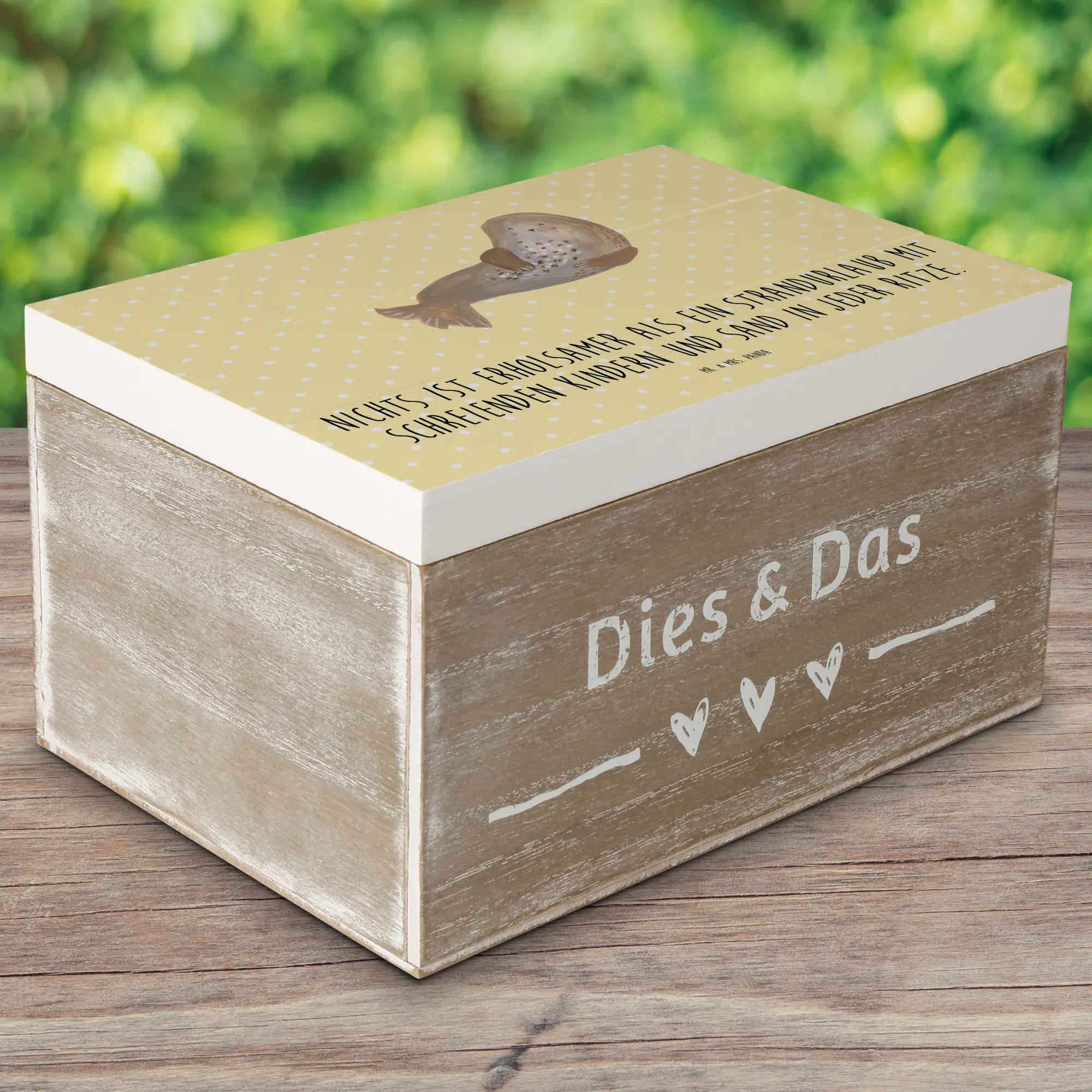 Diese wunderschöne Holzkiste von Mr. & Mrs. Panda ist der perfekte Begleiter für alle, die den Sommer in vollen Zügen genießen möchten. Die Box, bedruckt mit dem charmanten Slogan 'Nichts ist erholsamer als ein Strandurlaub mit schreienden Kindern und Sand in jeder Ritze.', strahlt pure Lebensfreude und Sommergefühle aus. Sie ist nicht nur ein hübsches Deko-Element, sondern auch eine praktische Aufbewahrungsbox für all Deine sommerlichen Schätze. Ob es sich um Erinnerungen an unvergessliche Urlaubstage, Fotos von der letzten Sommerparty oder kleine Geschenke handelt, diese Kiste bietet ausreichend Platz für alles Wichtige. Mit den Abmessungen von 25 x 18 cm ist sie kompakt und dennoch groß genug, um all Deine kleinen Kostbarkeiten unterzubringen.