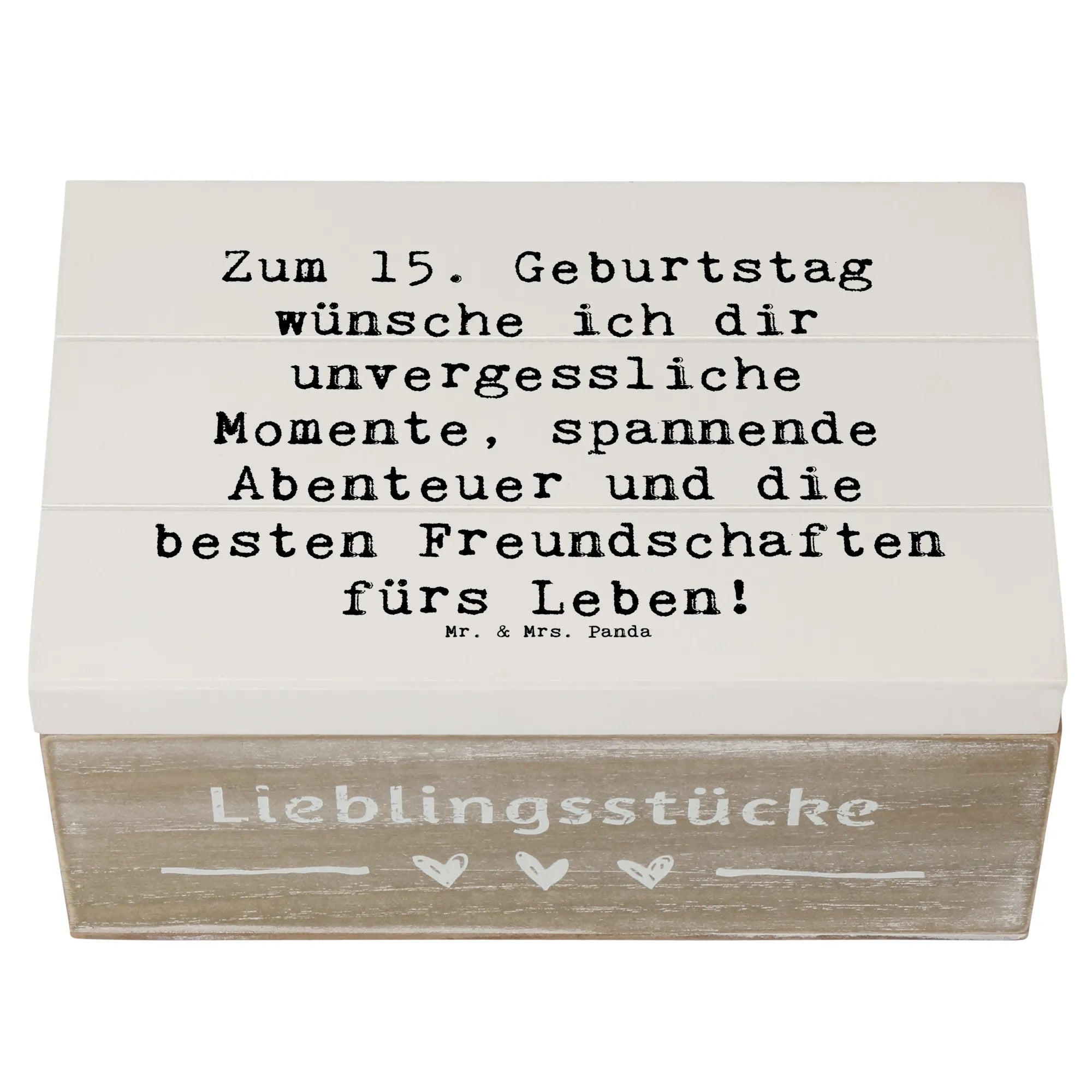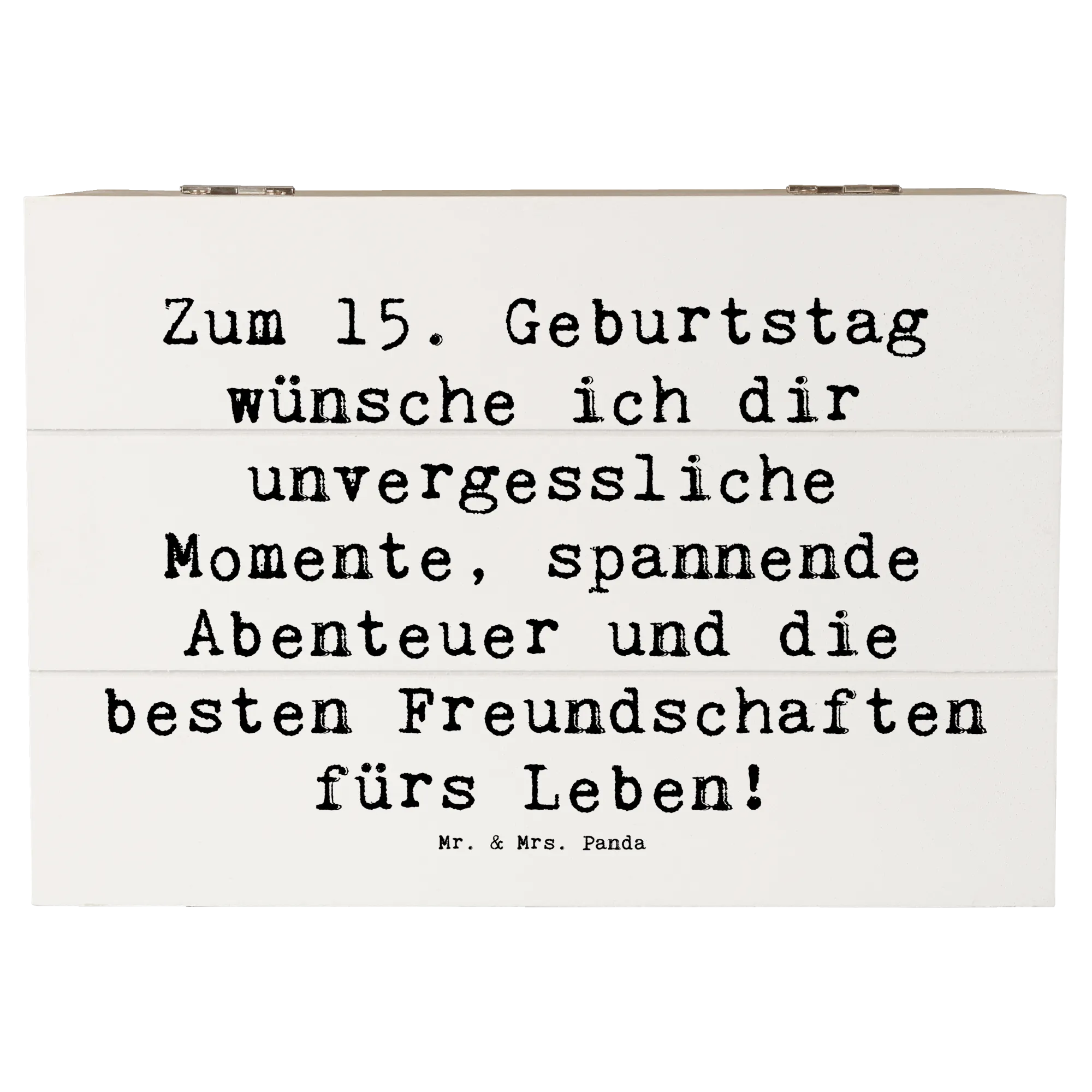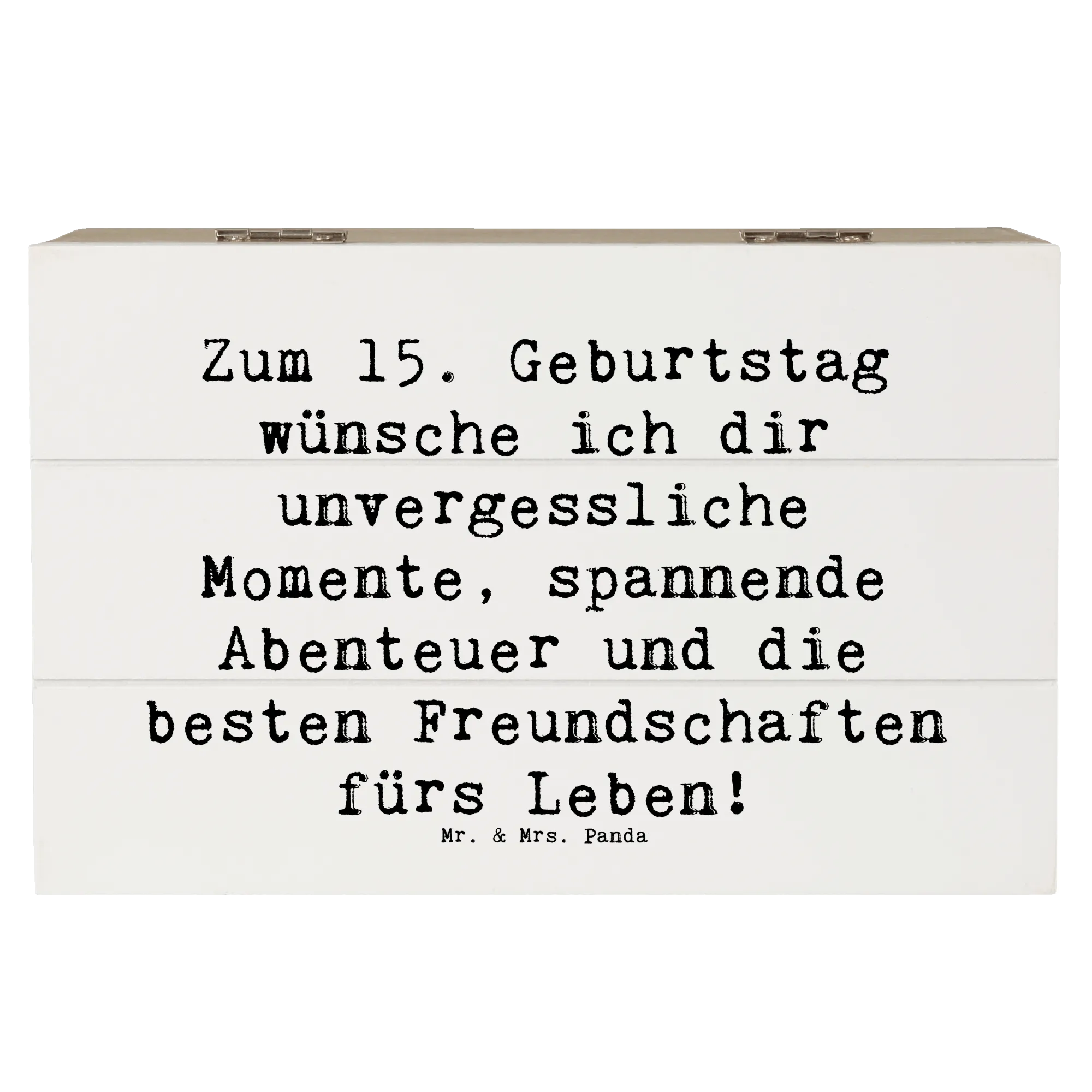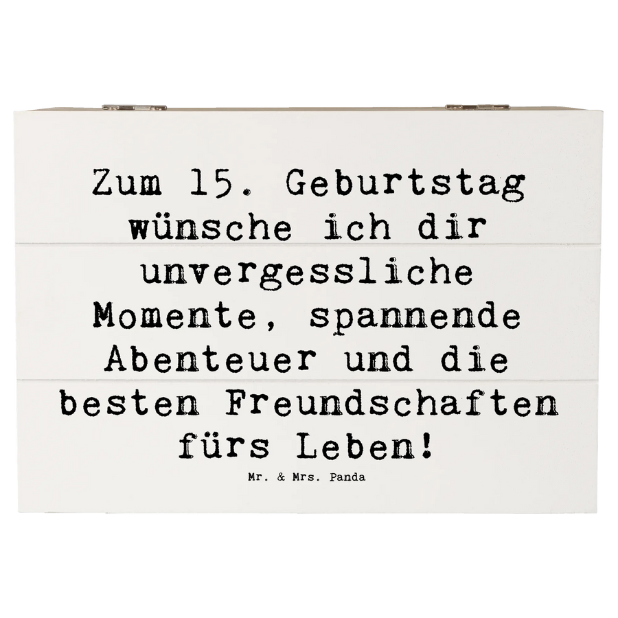 Die liebevoll gestaltete Holzkiste von Mr. & Mrs. Panda ist das perfekte Geschenk zum 15. Geburtstag! Mit dem charmanten Spruch "Zum 15. Geburtstag wünsche ich dir unvergessliche Momente, spannende Abenteuer und die besten Freundschaften fürs Leben!" sorgt diese Kiste für strahlende Augen und wird zur ganz besonderen Erinnerung.