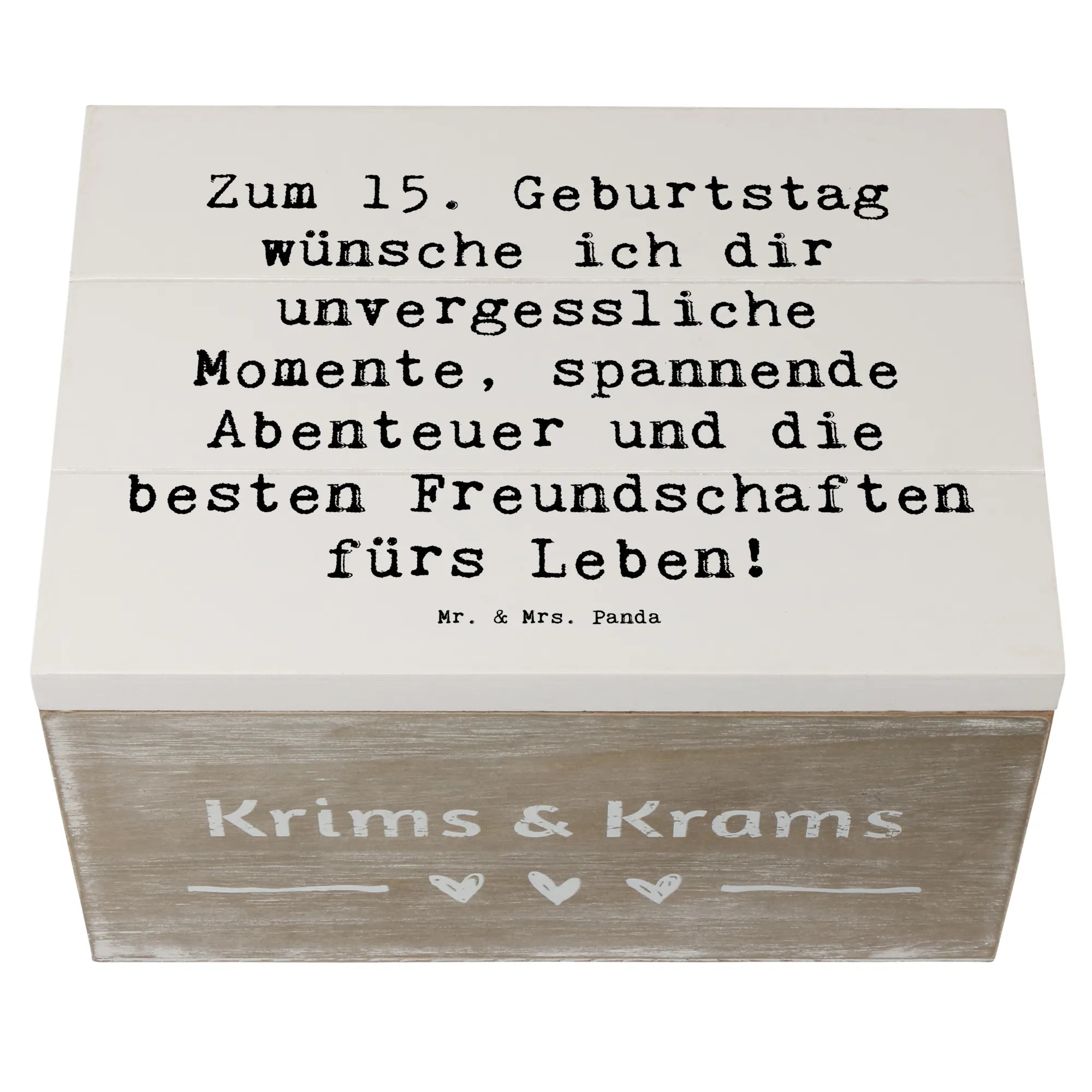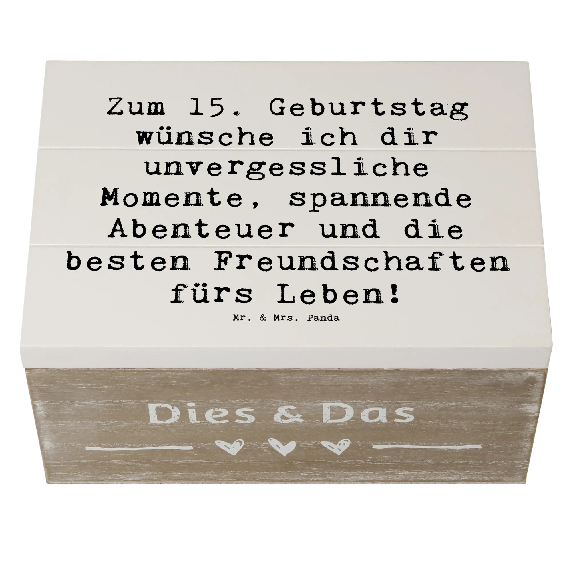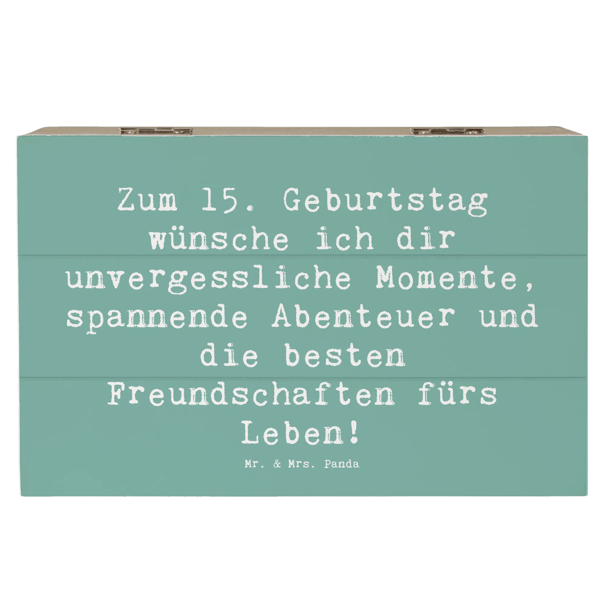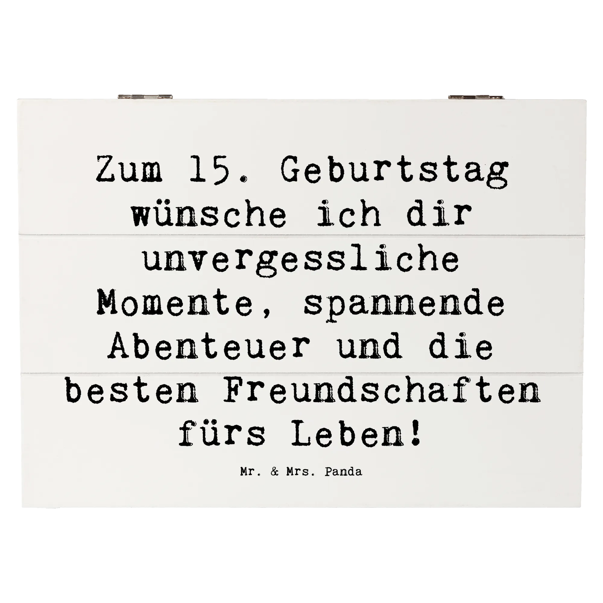 Die liebevoll gestaltete Holzkiste von Mr. & Mrs. Panda ist das perfekte Geschenk zum 15. Geburtstag! Mit dem charmanten Spruch "Zum 15. Geburtstag wünsche ich dir unvergessliche Momente, spannende Abenteuer und die besten Freundschaften fürs Leben!" sorgt diese Kiste für strahlende Augen und wird zur ganz besonderen Erinnerung.