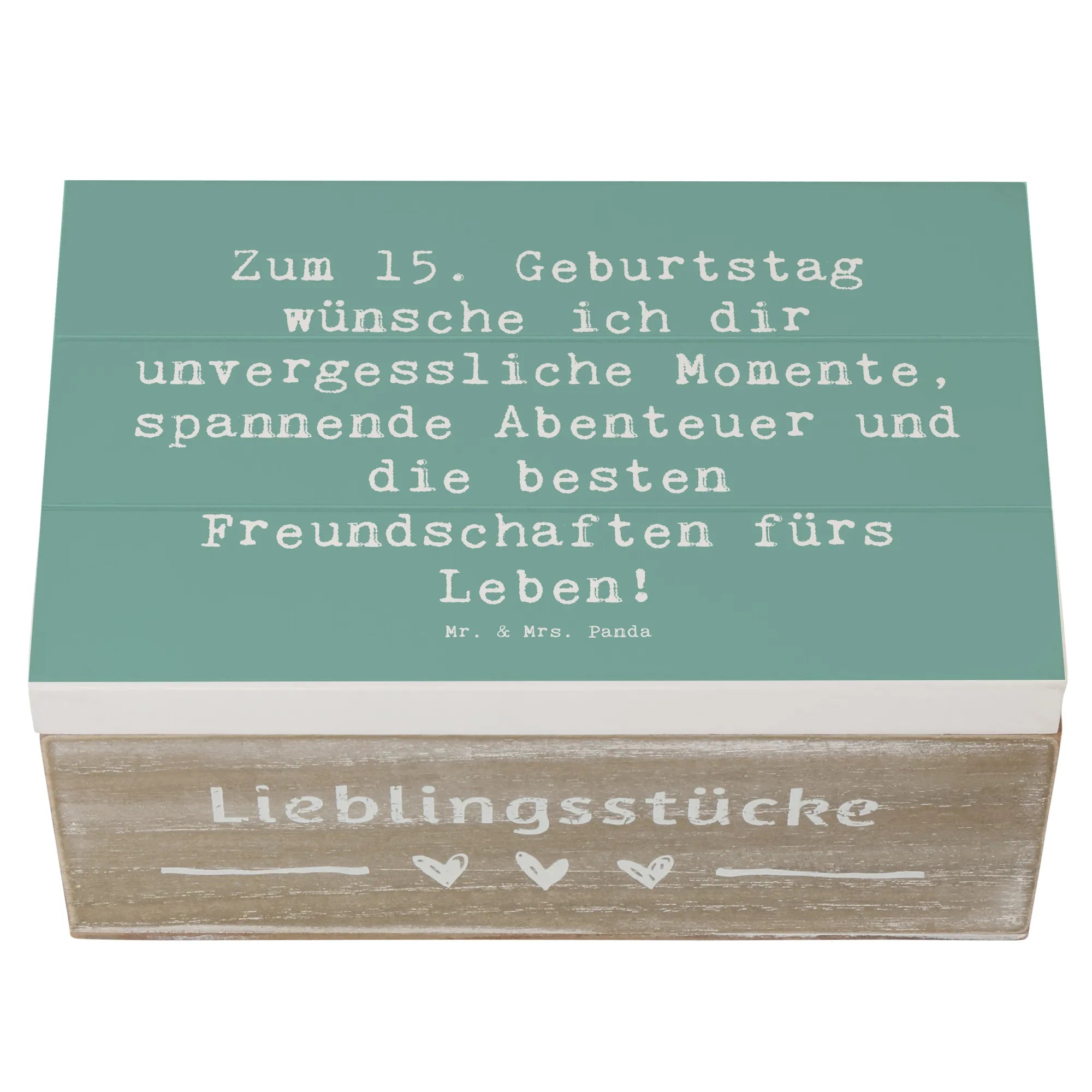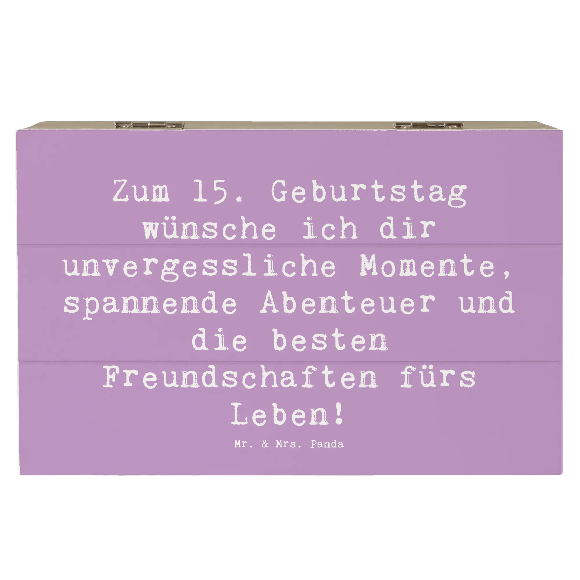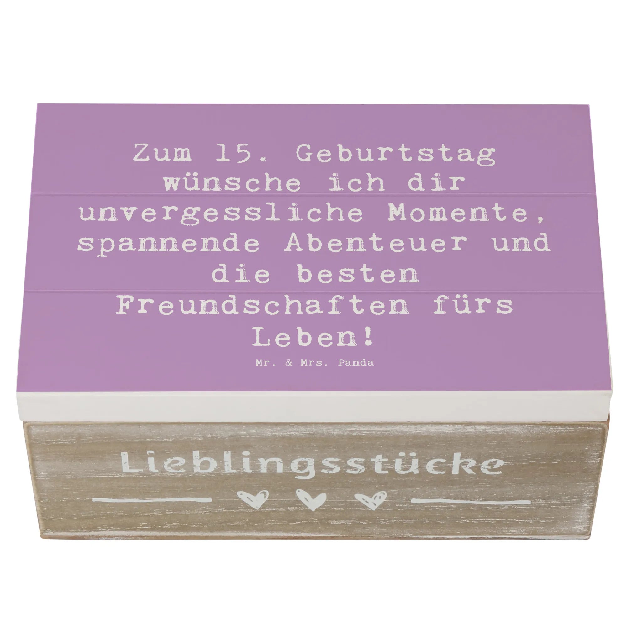 Bereit für ein ganz besonderes Geschenk? Unsere wunderschöne Holzkiste von Mr. & Mrs. Panda ist das ideale Präsent zum 15. Geburtstag! Diese exquisite Erinnerungskiste ist mit dem liebevollen Slogan "Zum 15. Geburtstag wünsche ich dir unvergessliche Momente, spannende Abenteuer und die besten Freundschaften fürs Leben!" versehen.