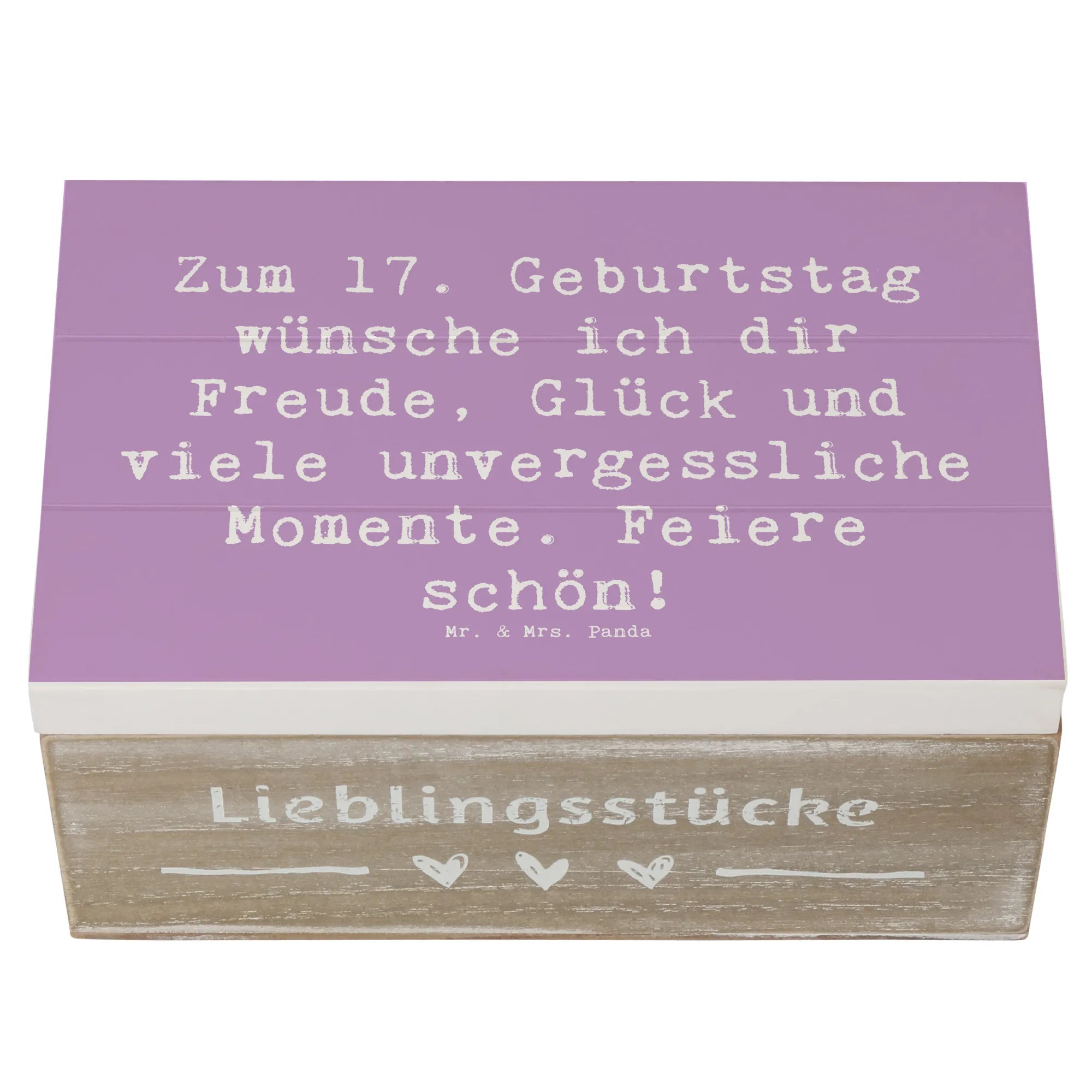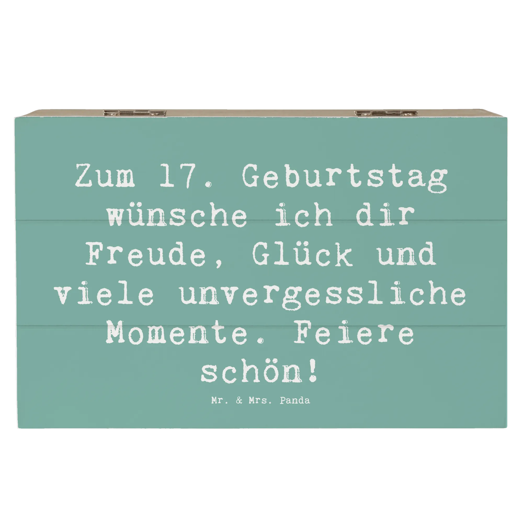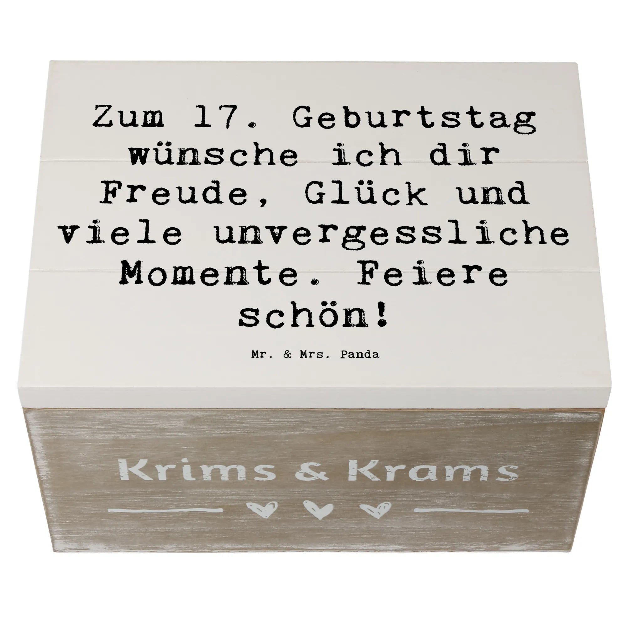 Die Holzkiste von Mr. & Mrs. Panda ist das perfekte Geschenk zum 17. Geburtstag! Mit ihrem liebevollen Design und dem motivierenden Spruch 'Zum 17. Geburtstag wünsche ich dir Freude, Glück und viele unvergessliche Momente. Feiere schön!' bringt sie gleich gute Stimmung und herzliche Glückwünsche mit sich.