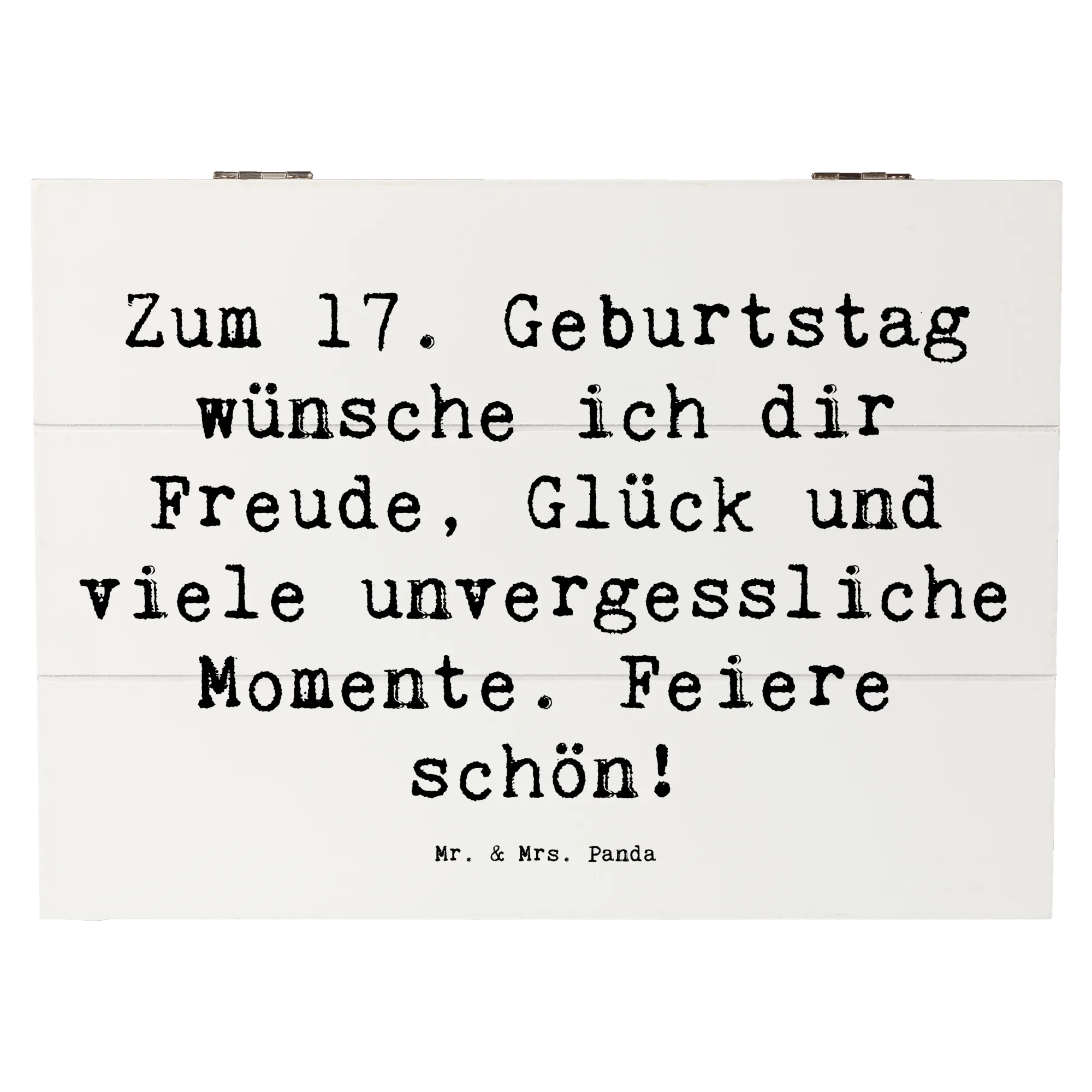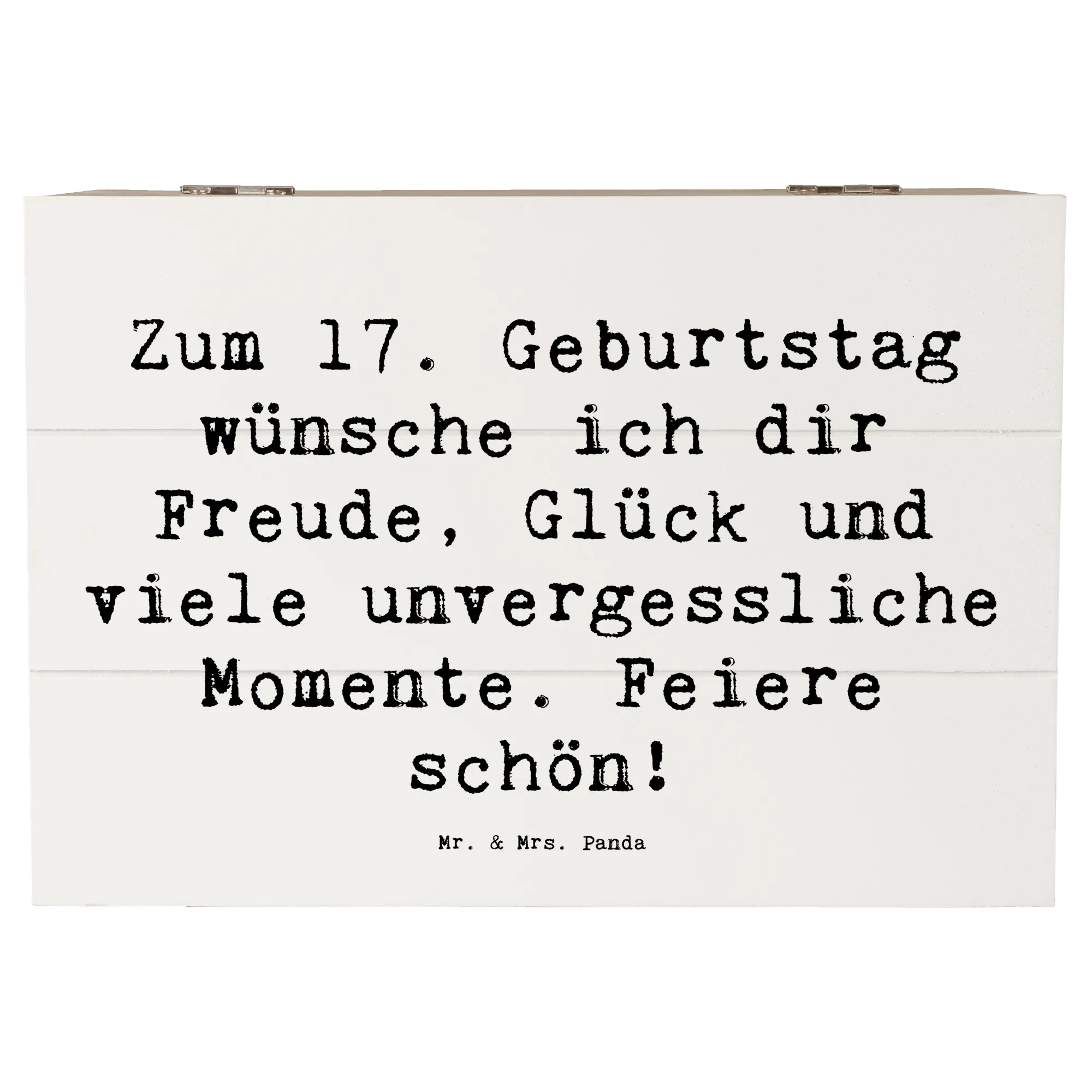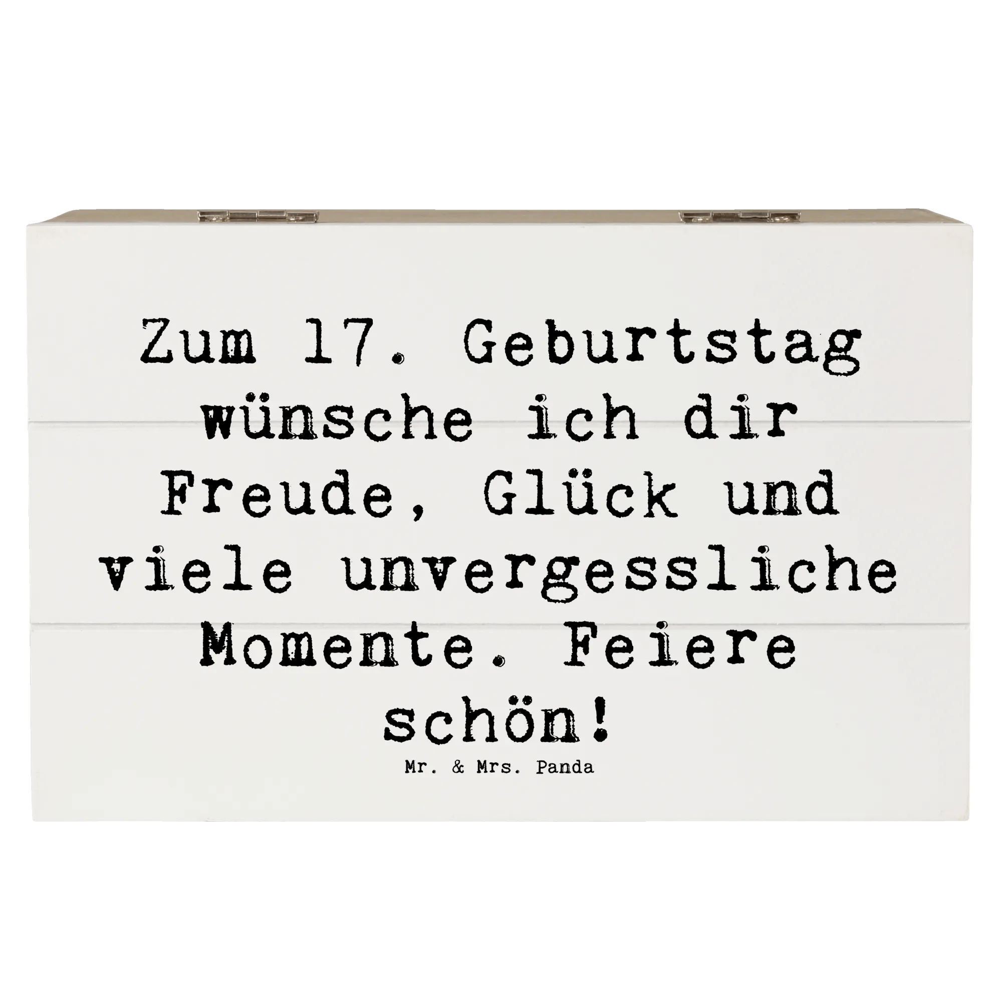Die Holzkiste von Mr. & Mrs. Panda ist das perfekte Geschenk zum 17. Geburtstag! Mit ihrem liebevollen Design und dem motivierenden Spruch 'Zum 17. Geburtstag wünsche ich dir Freude, Glück und viele unvergessliche Momente. Feiere schön!' bringt sie gleich gute Stimmung und herzliche Glückwünsche mit sich.