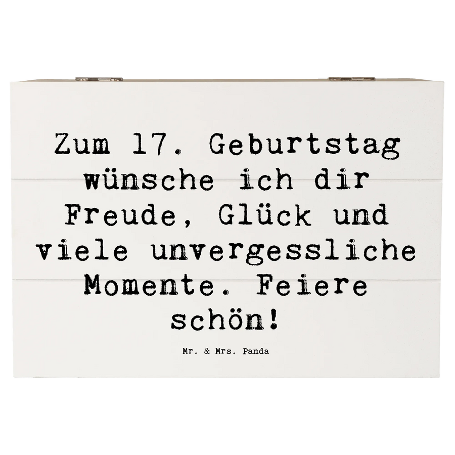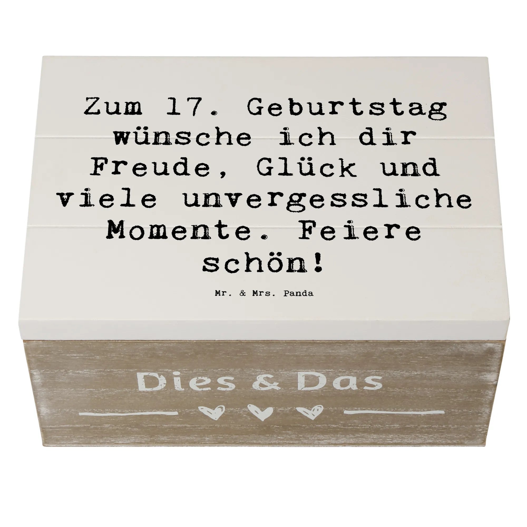 Die Holzkiste ist in mehreren Größen erhältlich und wird sicher schon bald zu einem unverzichtbaren Begleiter in Deinem Leben! Diese Erinnerungskiste von Mr. & Mrs. Panda ist mehr als nur ein Aufbewahrungsort - sie ist ein Stückchen Liebe und Freude, das jeden Geburtstag Besonderes macht. Verschenke unvergessliche Momente und mache den 17. Geburtstag mit dieser bezaubernden Holzkiste zu einem echten Highlight!