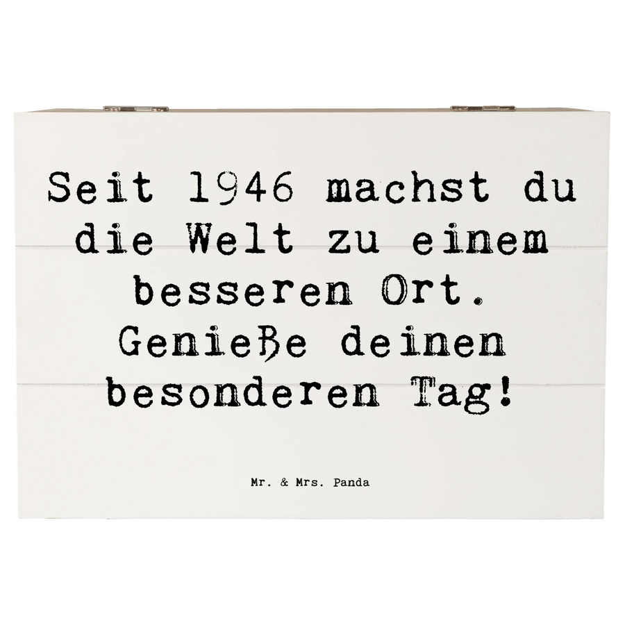 Entdecke die wundervolle Holzkiste von Mr. & Mrs. Panda, perfekt für Geburtstagskinder, die 1946 das Licht der Welt erblickt haben! Diese einzigartige Schatzkiste bringt nicht nur Freude, sondern auch eine persönliche Note in dein Zuhause. Egal, ob als Erinnerungskiste für kostbare Momentaufnahmen, als Aufbewahrungsort für festliche Schätze oder einfach nur als besondere Geschenkbox – mit dieser Holzkiste kannst du die schönsten Erinnerungen bewahren. Das liebevoll gestaltete Motiv mit dem Slogan 'Seit 1946 machst du die Welt zu einem besseren Ort. Genieße deinen besonderen Tag!' wird jeden Anblick versüßen und lässt das Herz höher schlagen.