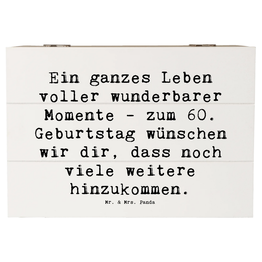Die wunderschöne Holzkiste von Mr. & Mrs. Panda ist das perfekte Geschenk zum 60. Geburtstag! Diese spezielle Erinnerungskiste aus robuster Premium Hartfaser bietet nicht nur einen stilvollen Aufbewahrungsort für all die kostbaren Schätze, die das Leben bereithält, sondern auch eine liebevolle Botschaft, die das Herz erwärmt. Der Slogan "Ein ganzes Leben voller wunderbarer Momente - zum 60. Geburtstag wünschen wir dir, dass noch viele weitere hinzukommen" unterstreicht die Einladung, die besonderen Erinnerungen und Erlebnisse so vieler Jahre zu feiern.