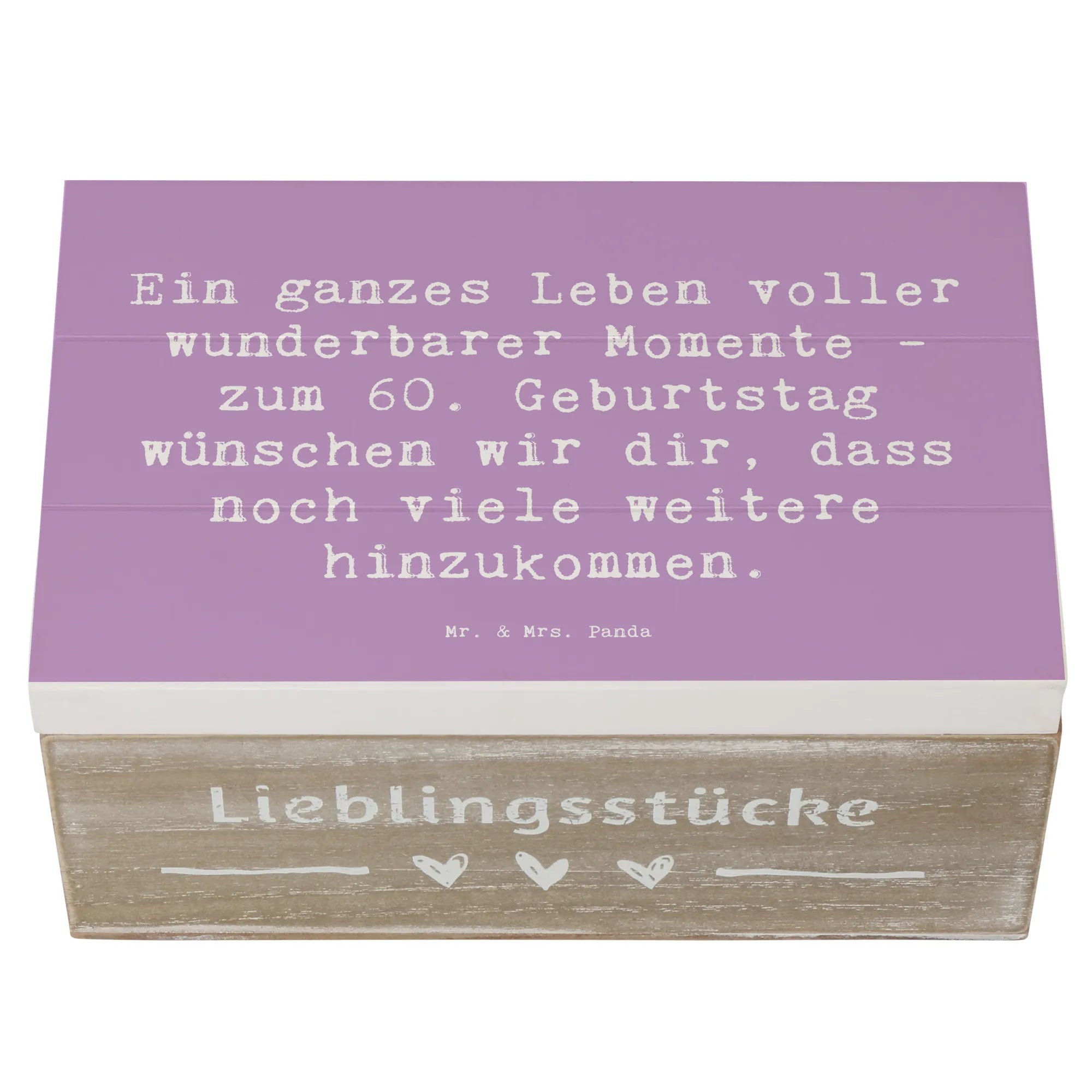 Entdecke die wundervolle Holzkiste von Mr. & Mrs. Panda, die das perfekte Geschenk zum 60. Geburtstag ist! Diese hübsche Schatzkiste steht ganz im Zeichen der unvergesslichen Momente, die dieses besondere Jubiläum mit sich bringt. Sie ist nicht nur ein Aufbewahrungsort für kostbare Erinnerungen, sondern auch eine liebevolle Dekoration für jedes Zuhause. Die Kiste ist aus robuster Premium Hartfaser gefertigt und bietet ausreichend Platz, um all die schönen Erinnerungen, Fotos und kleinen Schätze aus einem spannenden Leben zu lagern.