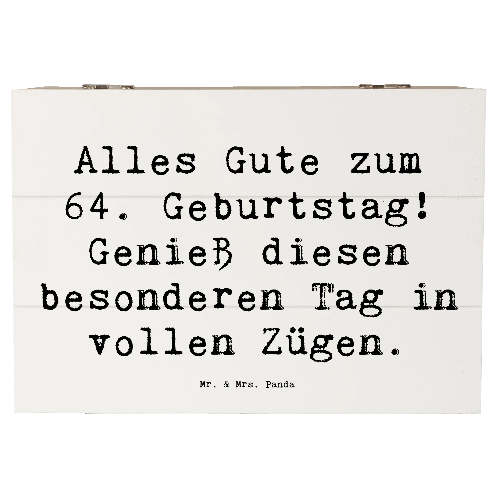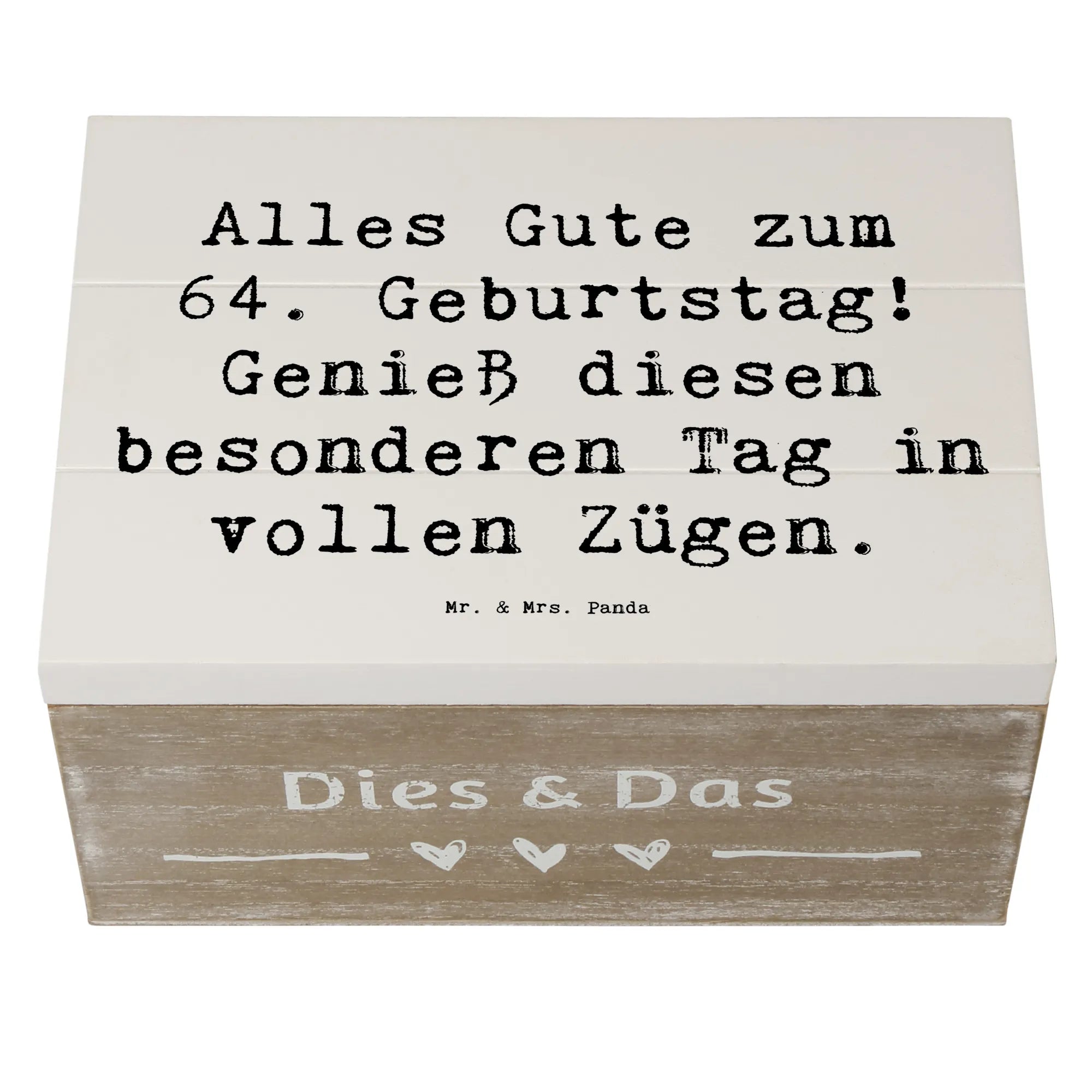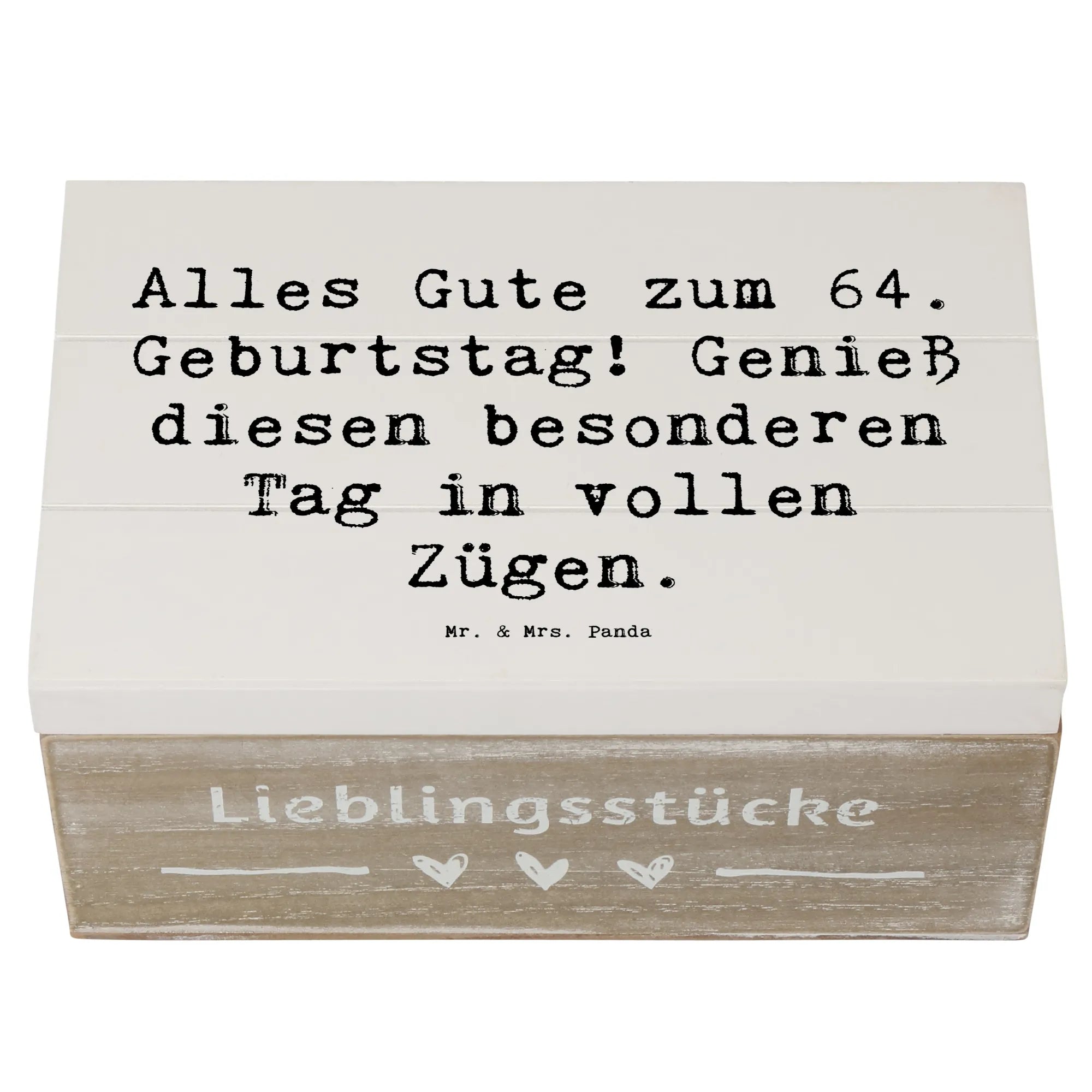 Die wunderschöne Holzkiste von Mr. & Mrs. Panda ist das perfekte Geschenk für jeden, der seinen 64. Geburtstag gebührend feiern möchte! Mit dem liebevollen Spruch 'Alles Gute zum 64. Geburtstag! Genieß diesen besonderen Tag in vollen Zügen.' wird diese Kiste zum herzlichen Begleiter an einem besonderen Tag.