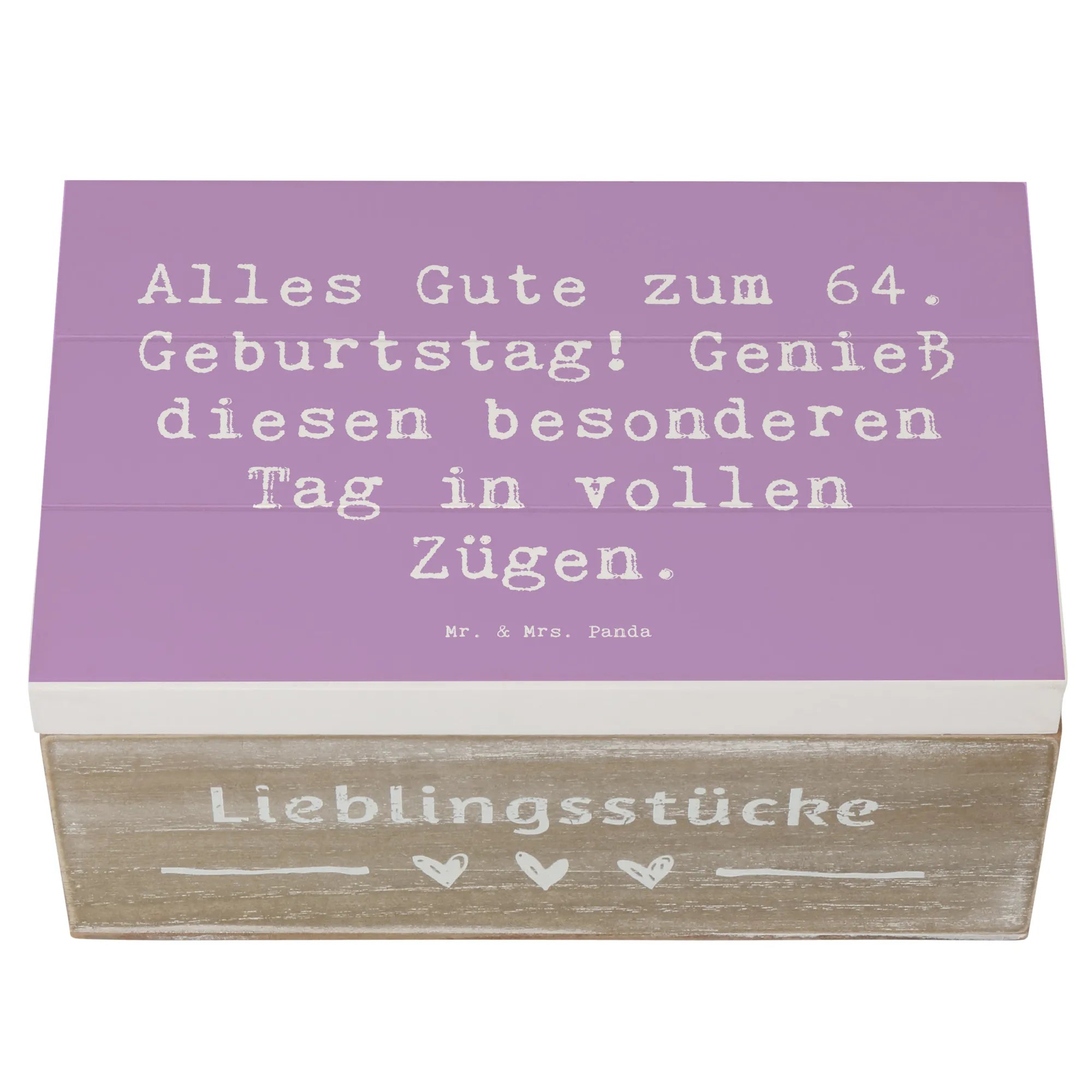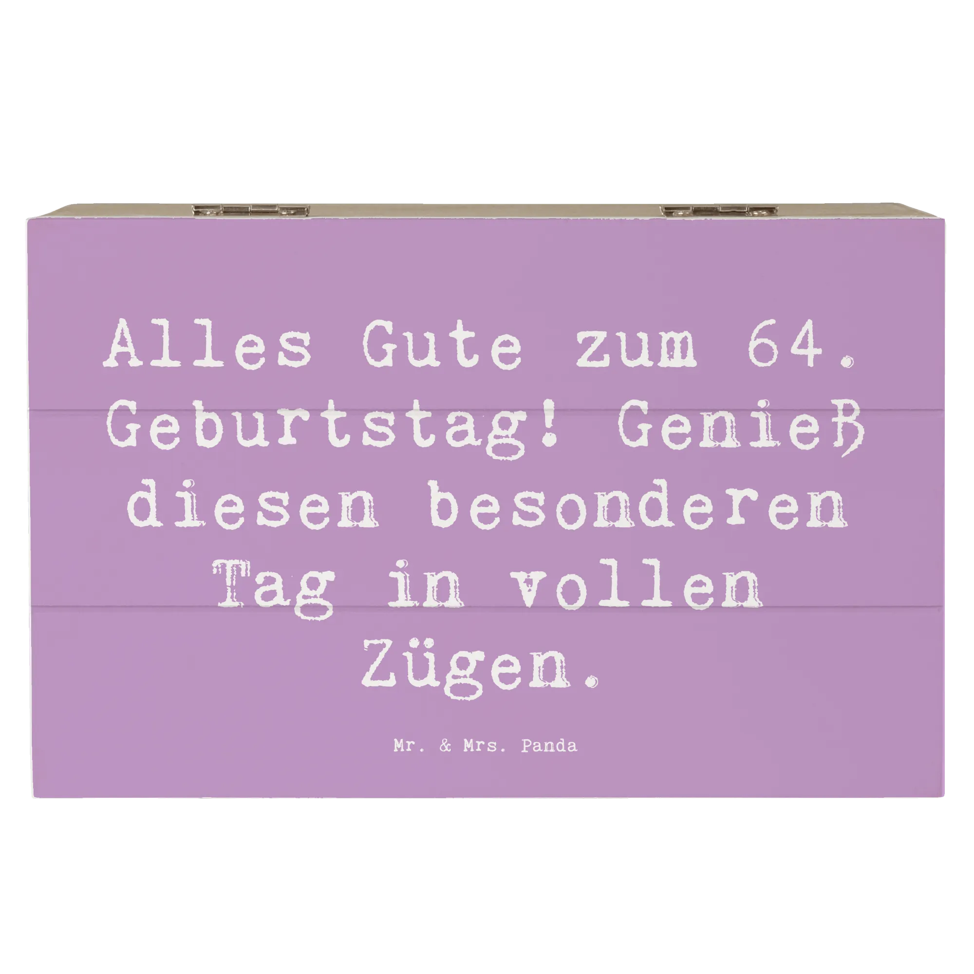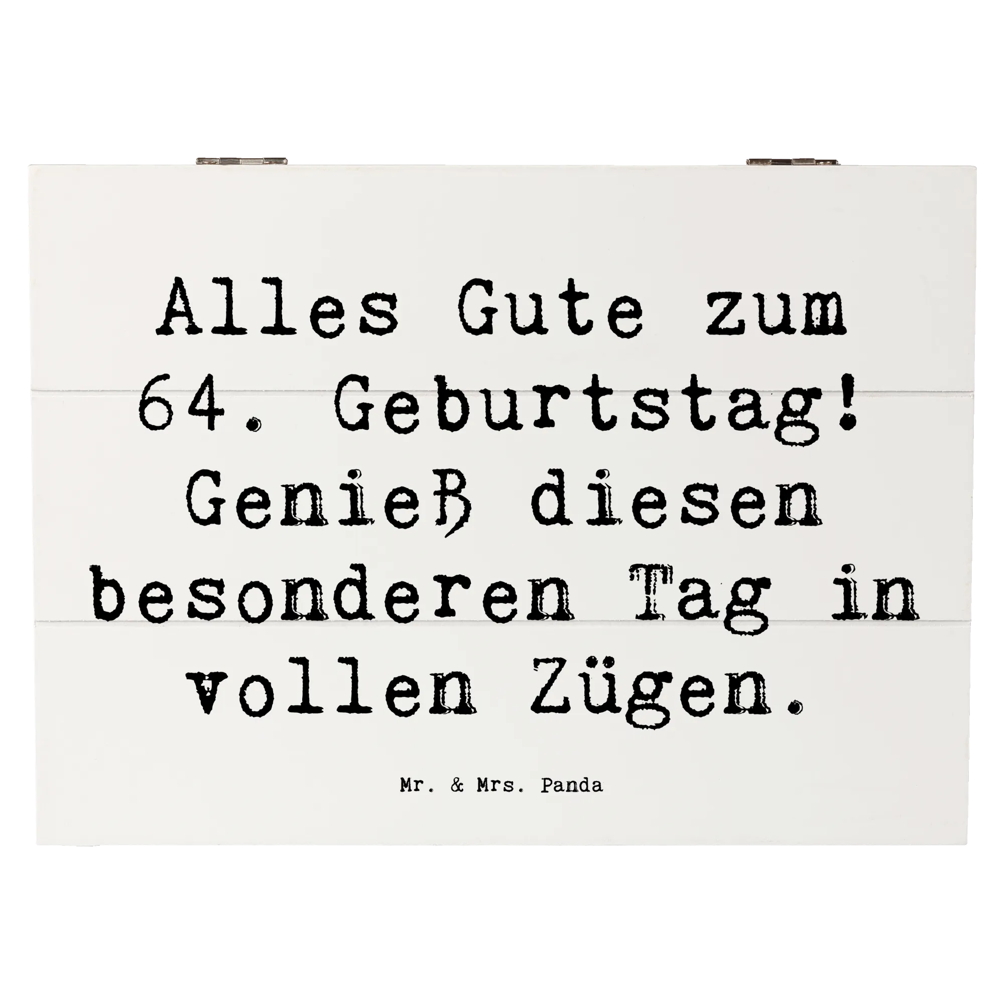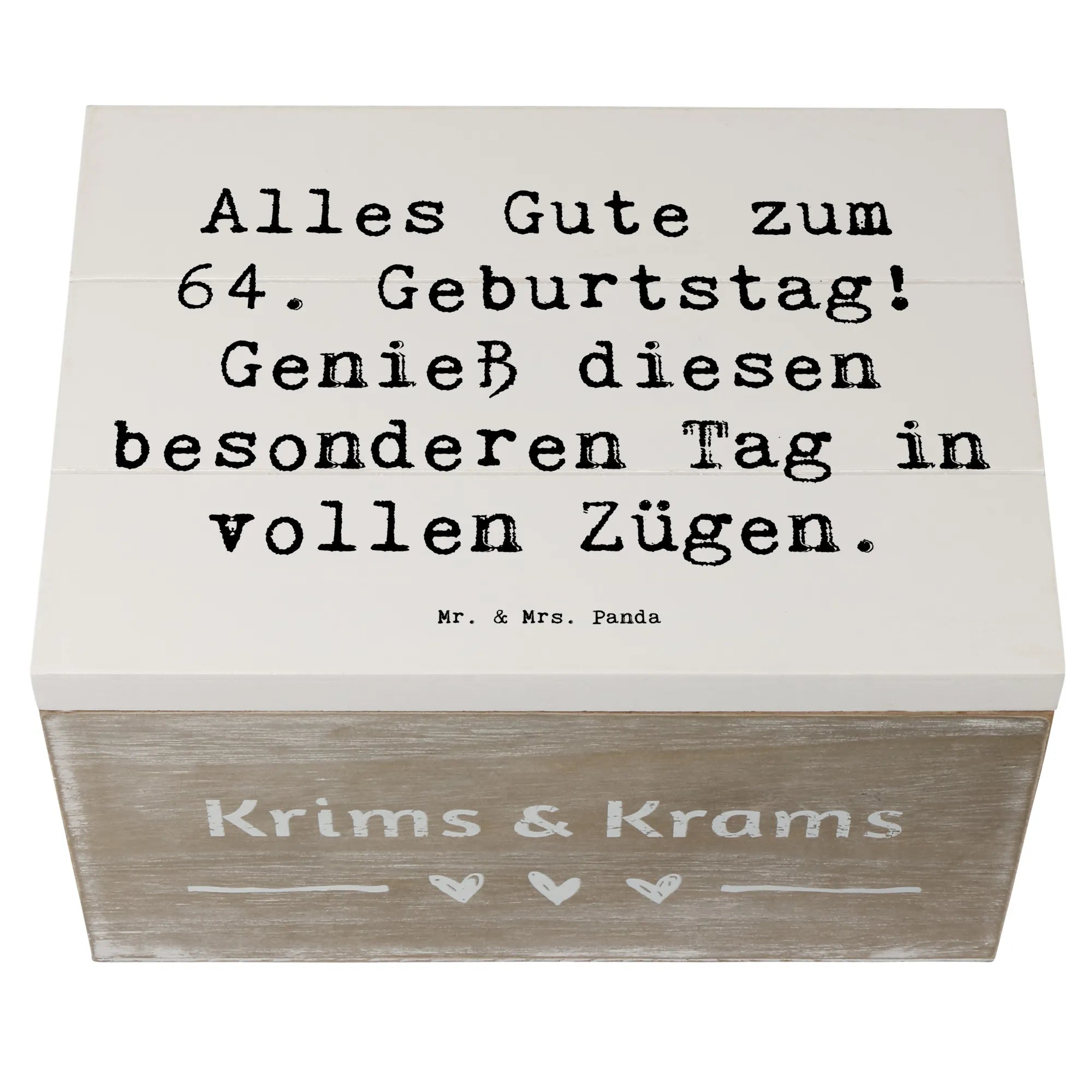 Die wunderschöne Holzkiste von Mr. & Mrs. Panda ist das perfekte Geschenk für jeden, der seinen 64. Geburtstag gebührend feiern möchte! Mit dem liebevollen Spruch 'Alles Gute zum 64. Geburtstag! Genieß diesen besonderen Tag in vollen Zügen.' wird diese Kiste zum herzlichen Begleiter an einem besonderen Tag.