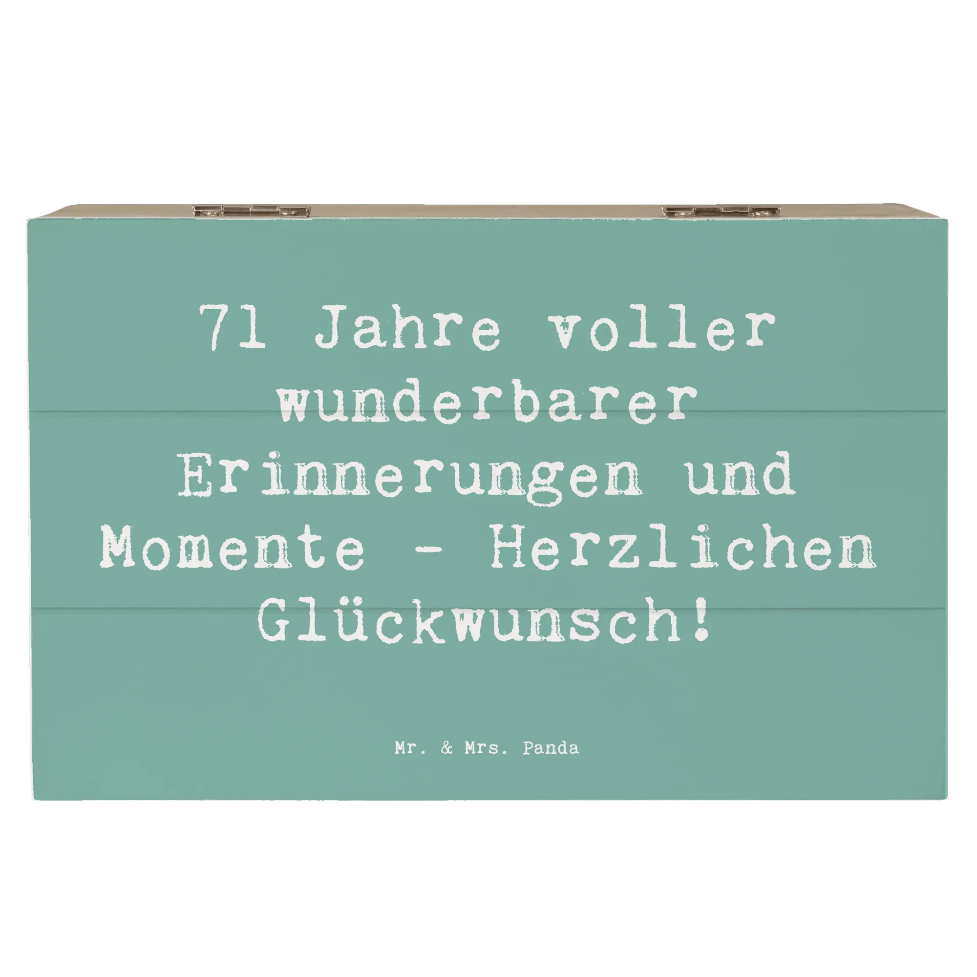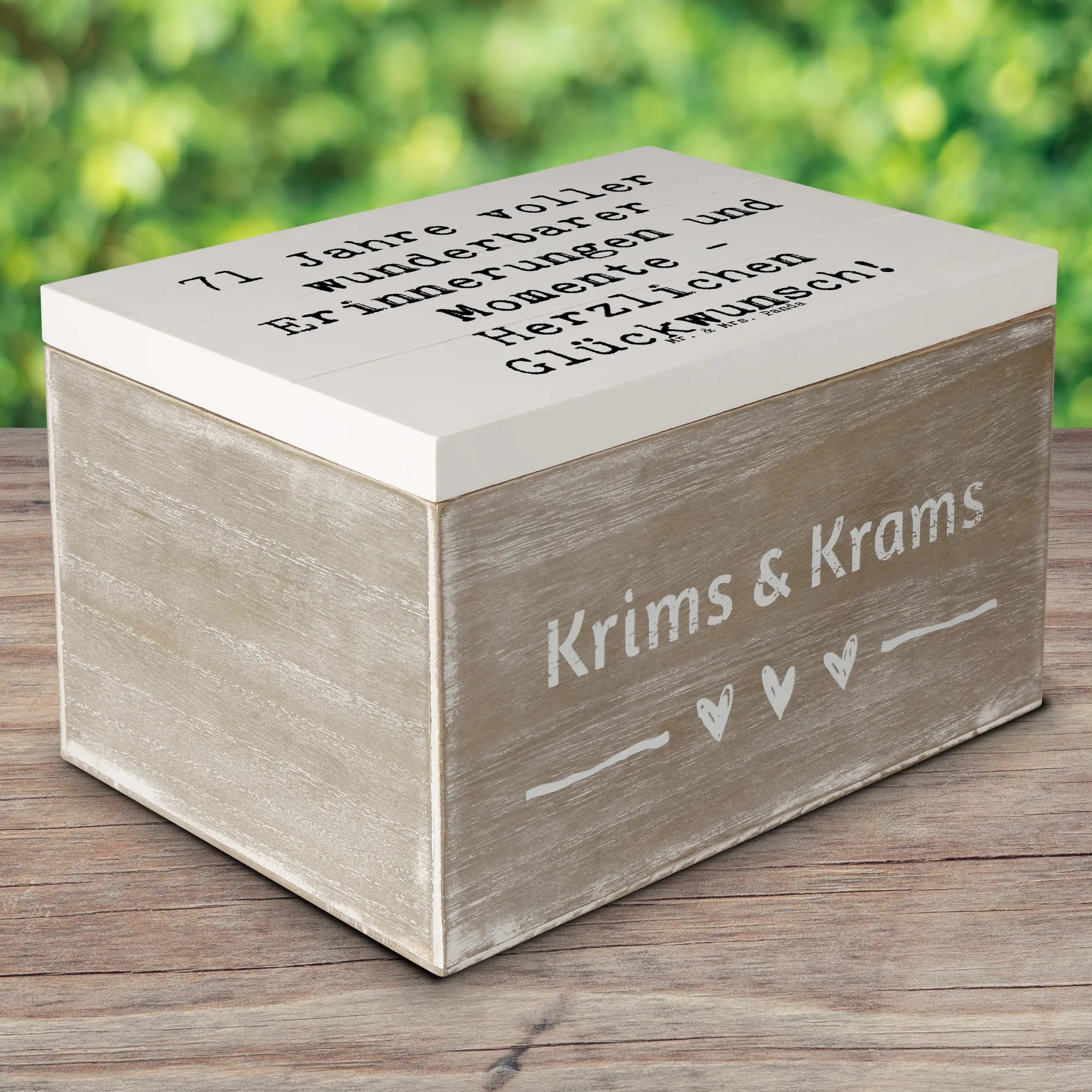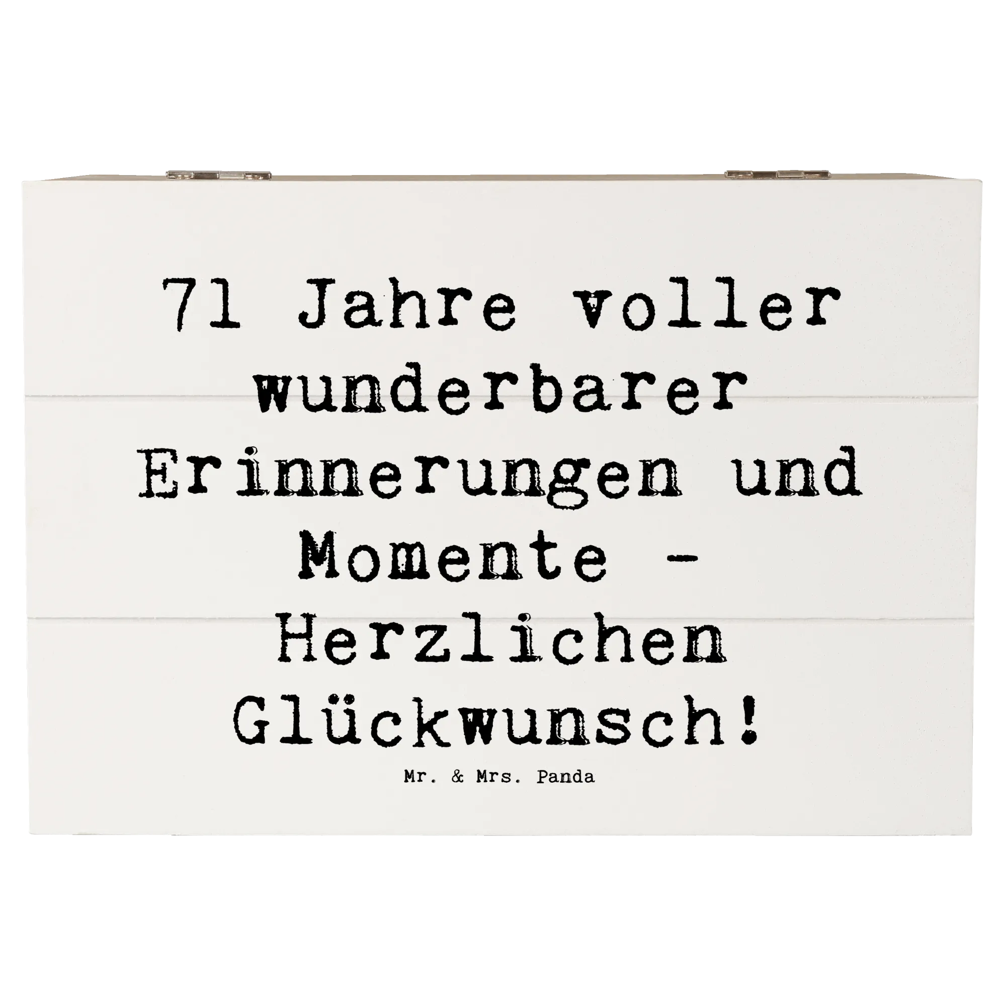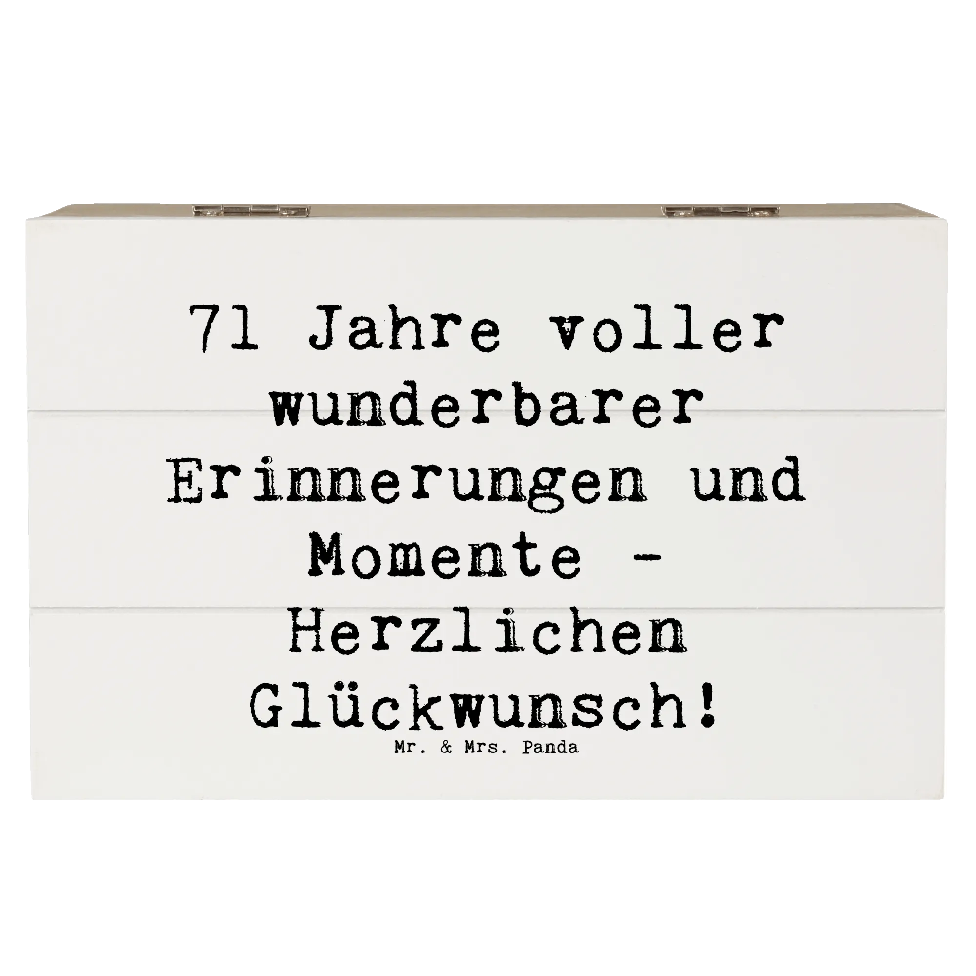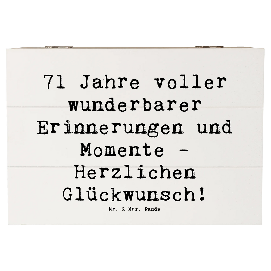 Die wunderschöne Holzkiste von Mr. & Mrs. Panda ist das perfekte Geschenk zum 71. Geburtstag! Mit dem liebevollen Spruch "71 Jahre voller wunderbarer Erinnerungen und Momente - Herzlichen Glückwunsch!" auf der Kiste, ist sie ideal, um allerlei Schätze und Erinnerungen an einen ganz besonderen Tag zu bewahren.