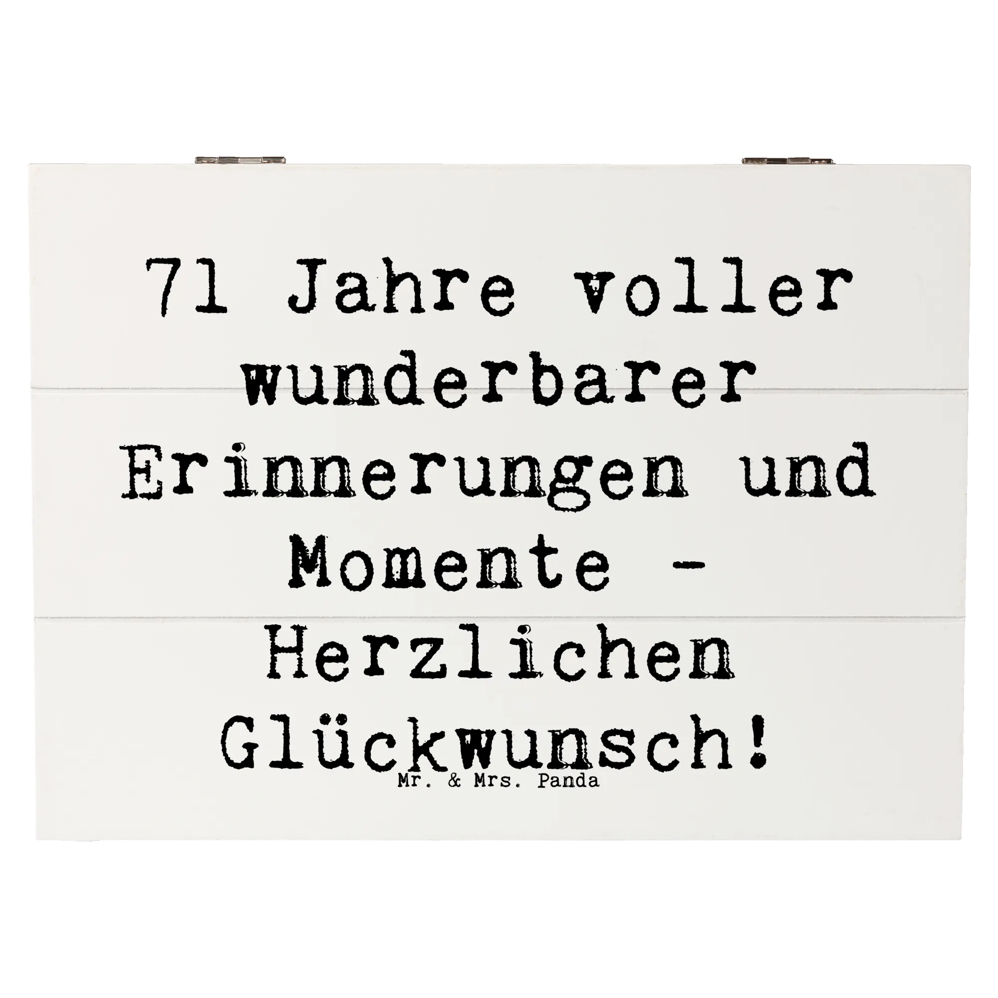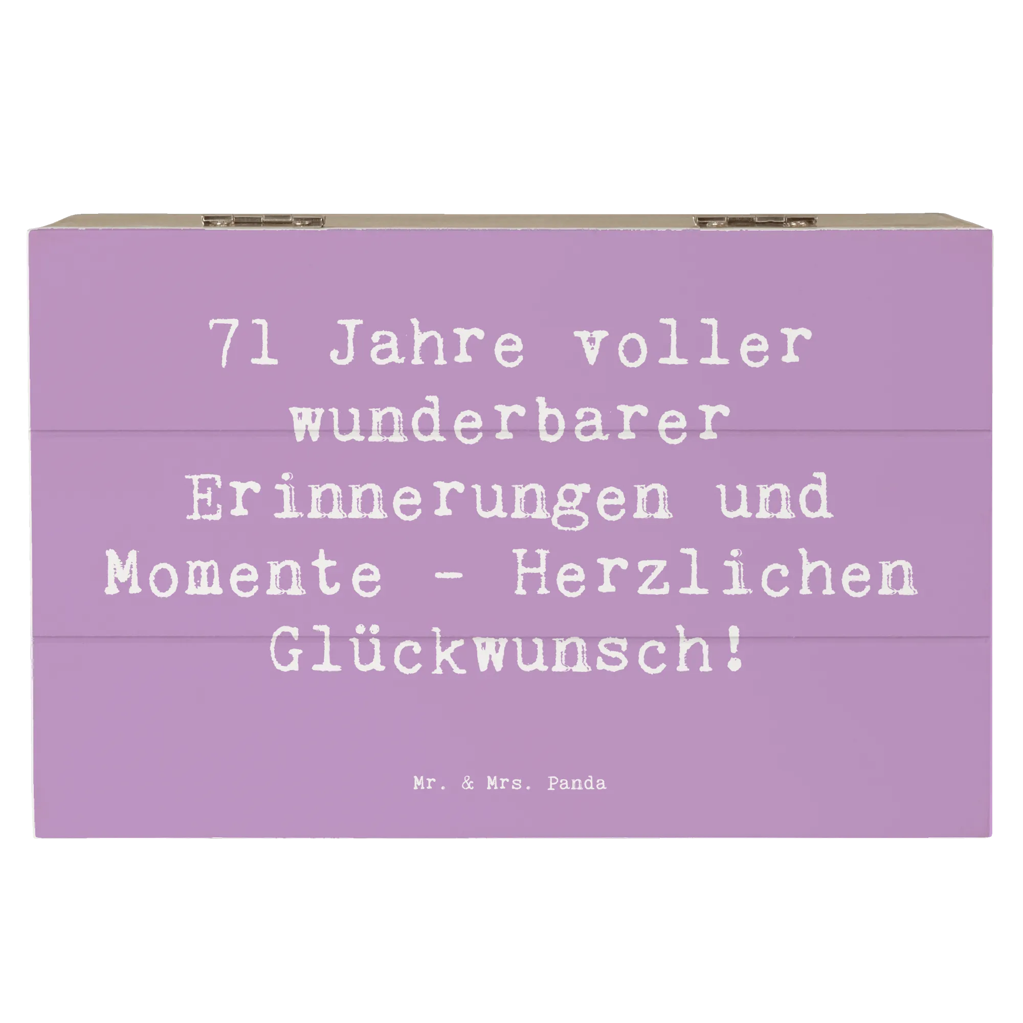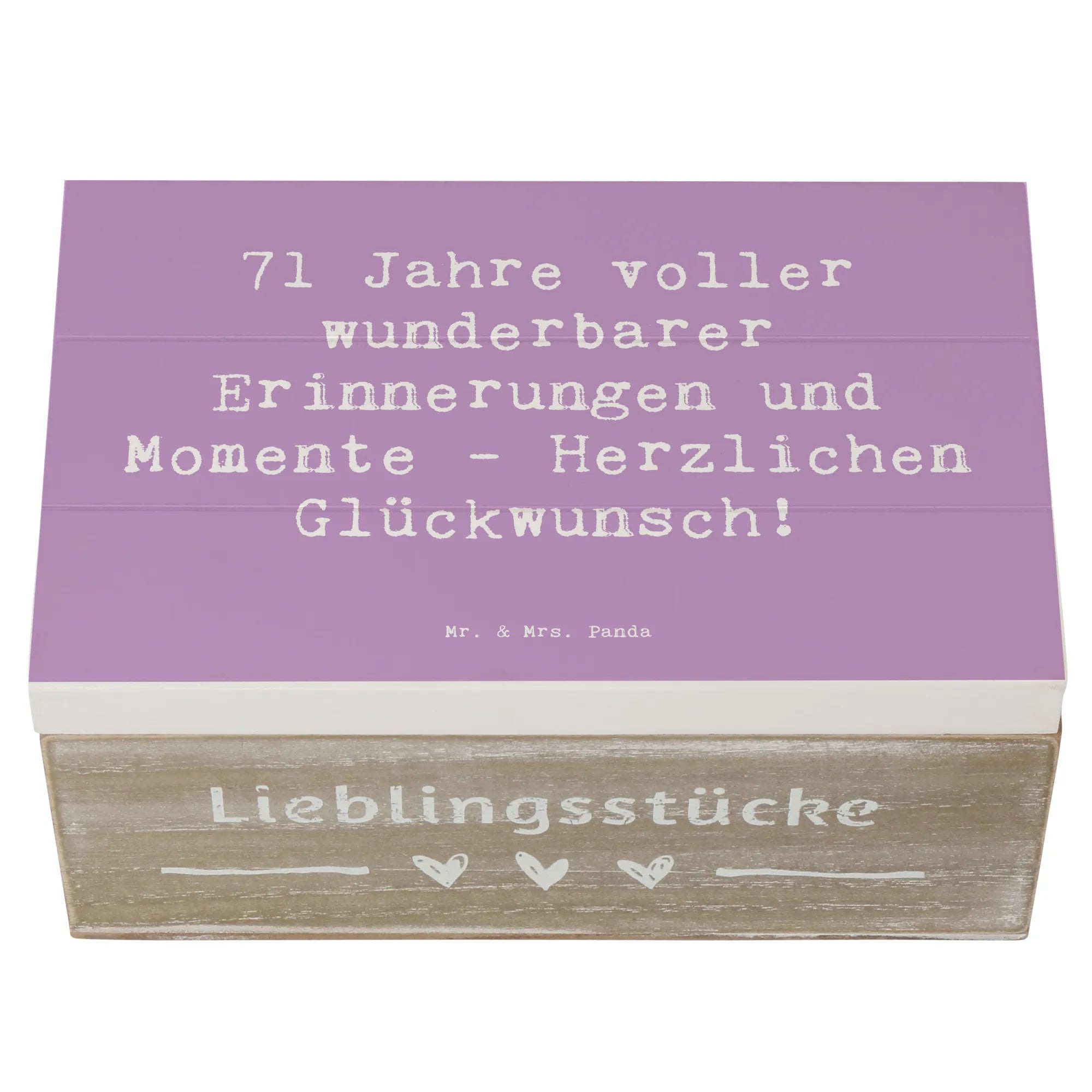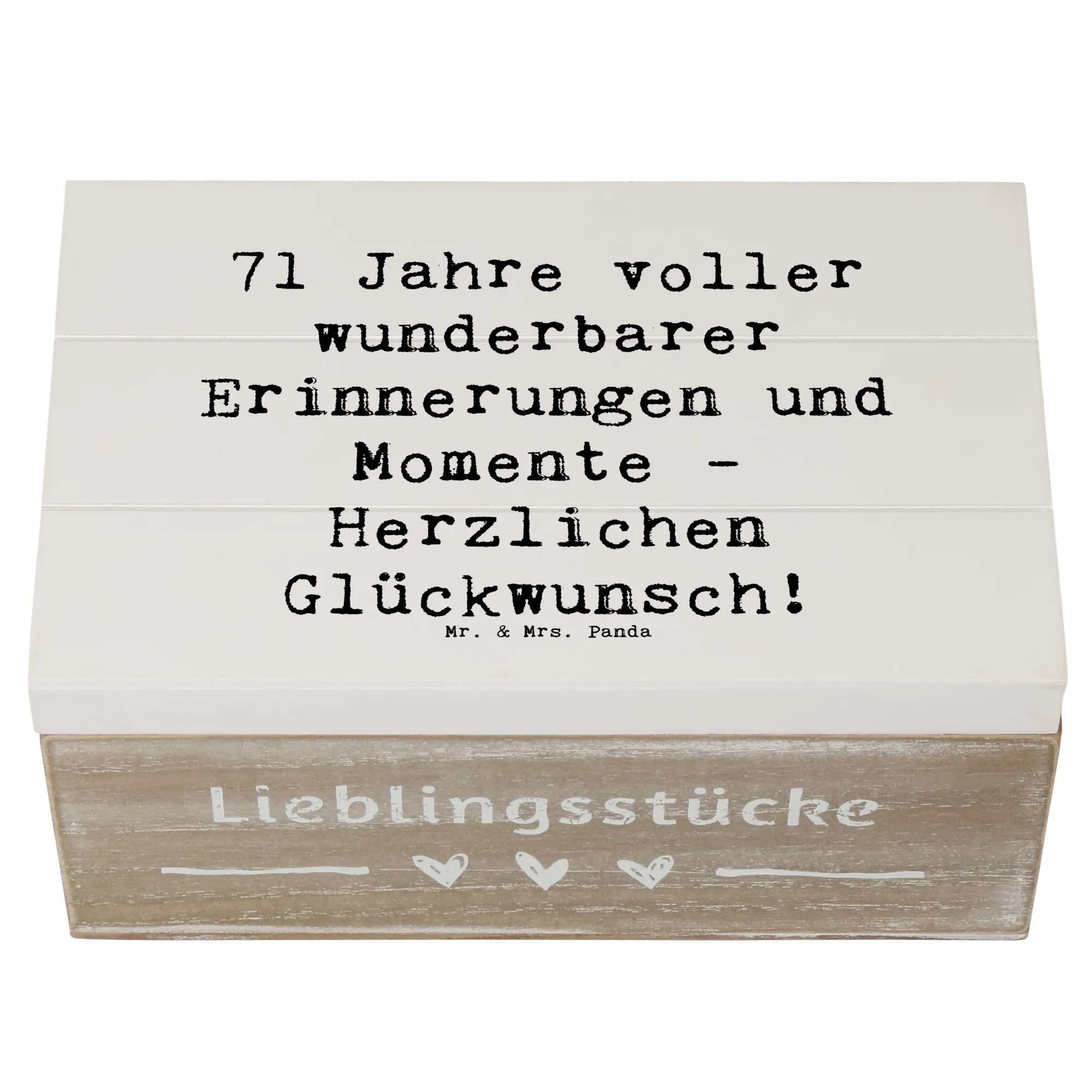 Die wunderschöne Holzkiste von Mr. & Mrs. Panda ist das perfekte Geschenk zum 71. Geburtstag! Mit dem liebevollen Spruch "71 Jahre voller wunderbarer Erinnerungen und Momente - Herzlichen Glückwunsch!" auf der Kiste, ist sie ideal, um allerlei Schätze und Erinnerungen an einen ganz besonderen Tag zu bewahren.