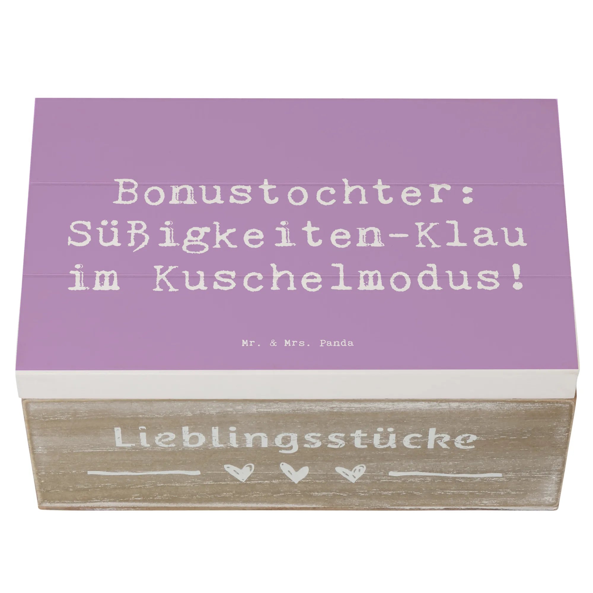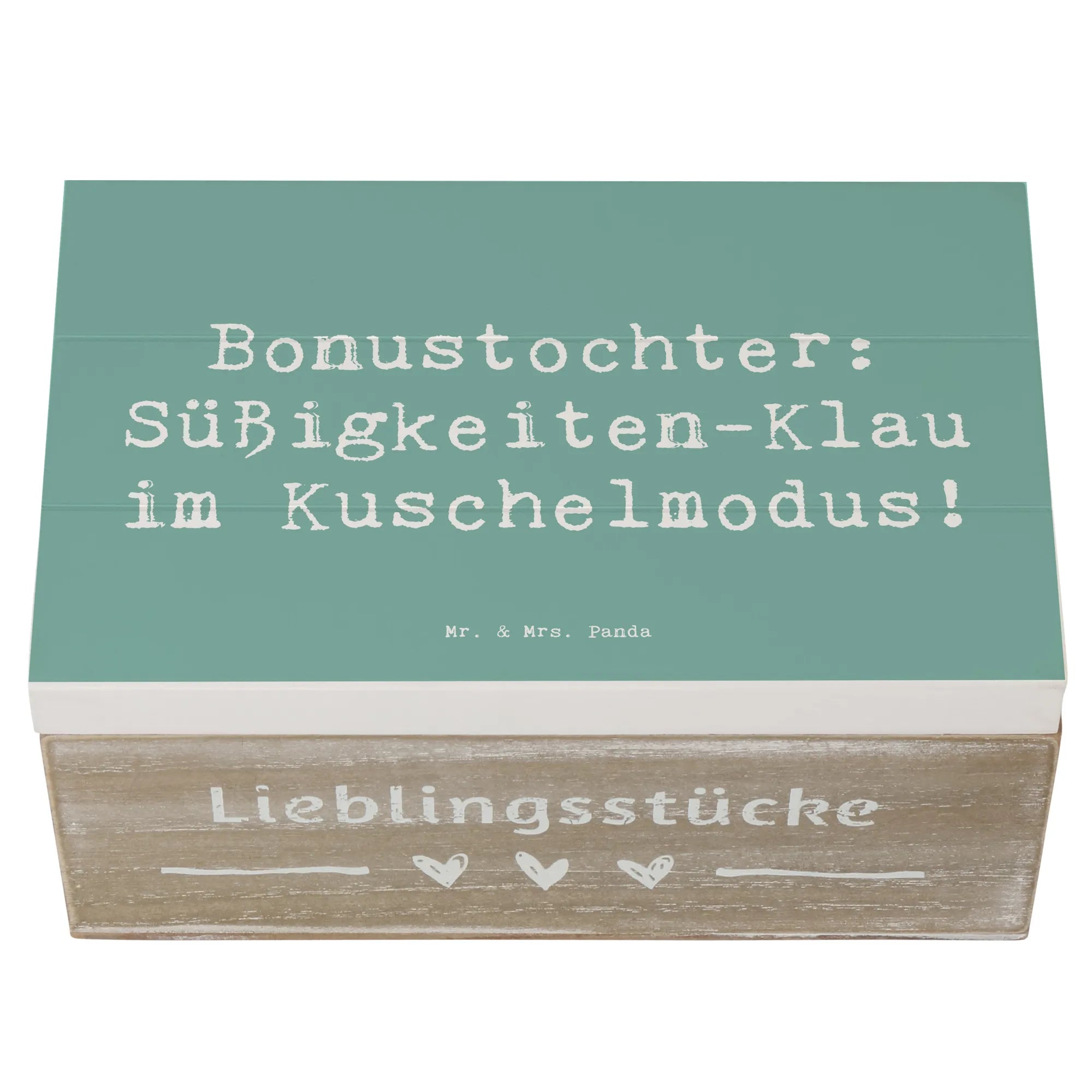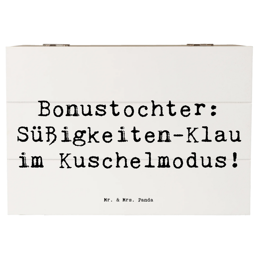 Entdecke die zauberhafte Holzkiste von Mr. & Mrs. Panda, die perfekt für Deine Bonustochter ist! Diese wunderschöne Schatzkiste ist mehr als nur ein Aufbewahrungsort für kleine Schätze. Sie ist ein Ausdruck der besonderen Beziehung, die Du zu Deiner Stieftochter hast. Mit dem charmanten Spruch "Bonustochter: Süßigkeiten-Klau im Kuschelmodus!" zauberst Du ein Lächeln auf ihr Gesicht und zeigst ihr, wie wichtig sie für Dich ist.