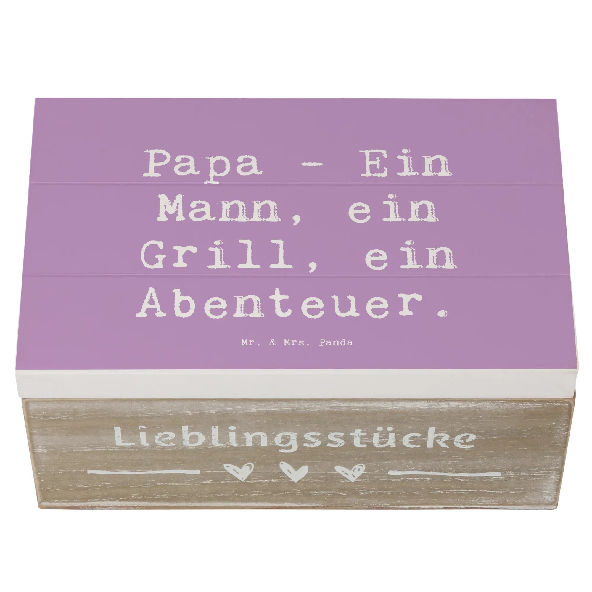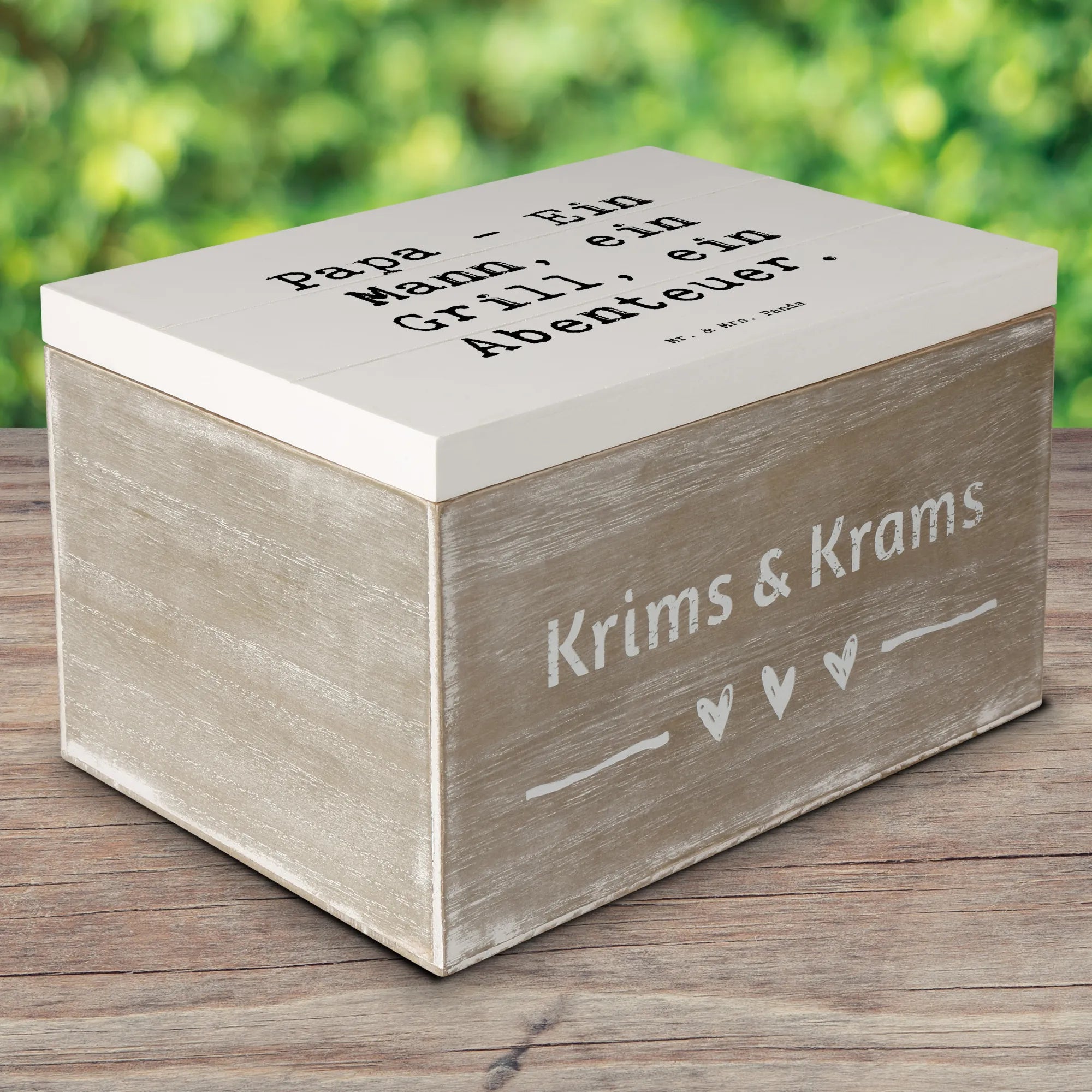 Eine wunderschöne Holzkiste von Mr. & Mrs. Panda mit dem liebevollen Motiv 'Papa - Ein Mann, ein Grill, ein Abenteuer' ist das perfekte Geschenk für jeden Vater. Diese schlichte, aber stilvolle Kiste ist nicht nur ein idealer Aufbewahrungsort für alle kostbaren Erinnerungen, sondern auch ein wunderbares Dekorationsstück, das das Herz eines jeden Papas höher schlagen lässt.
