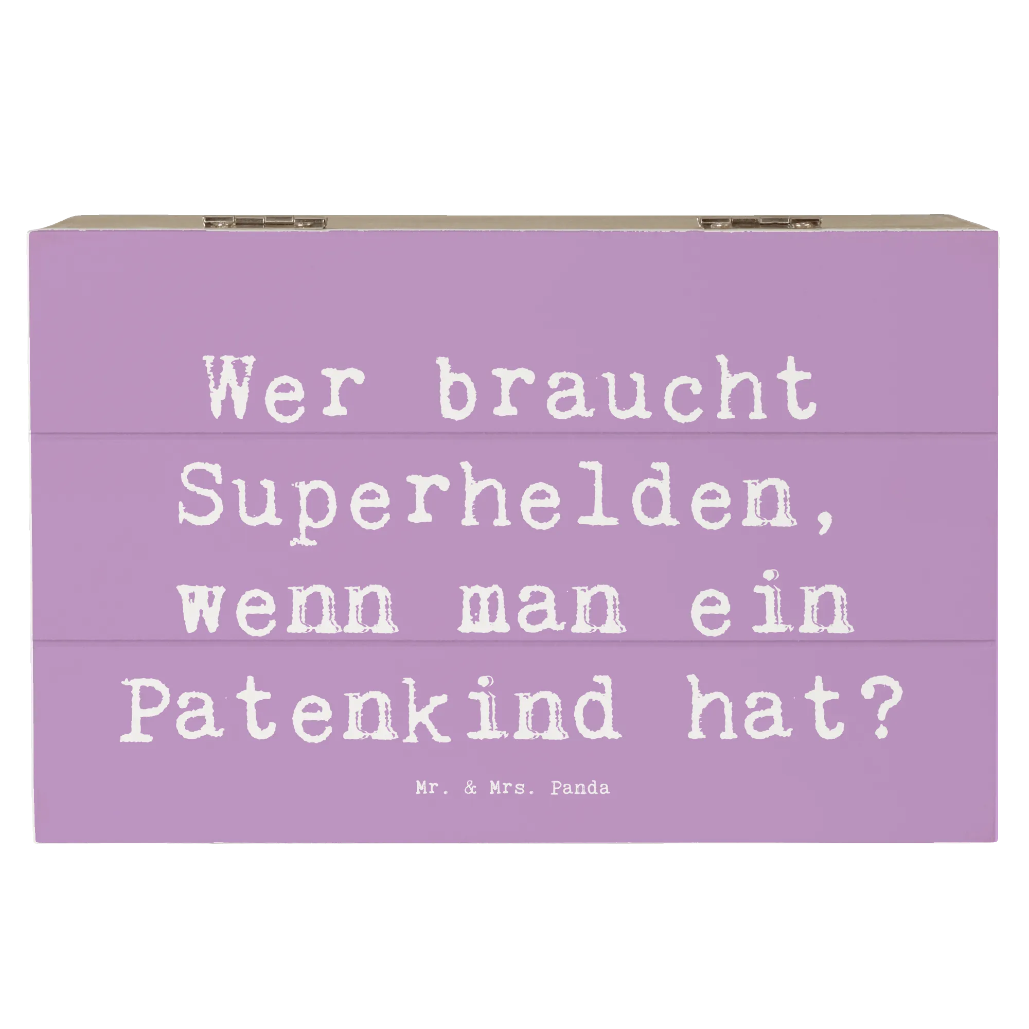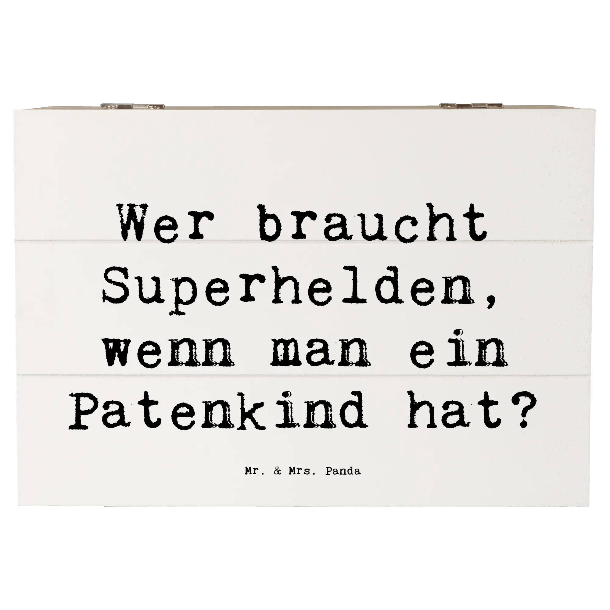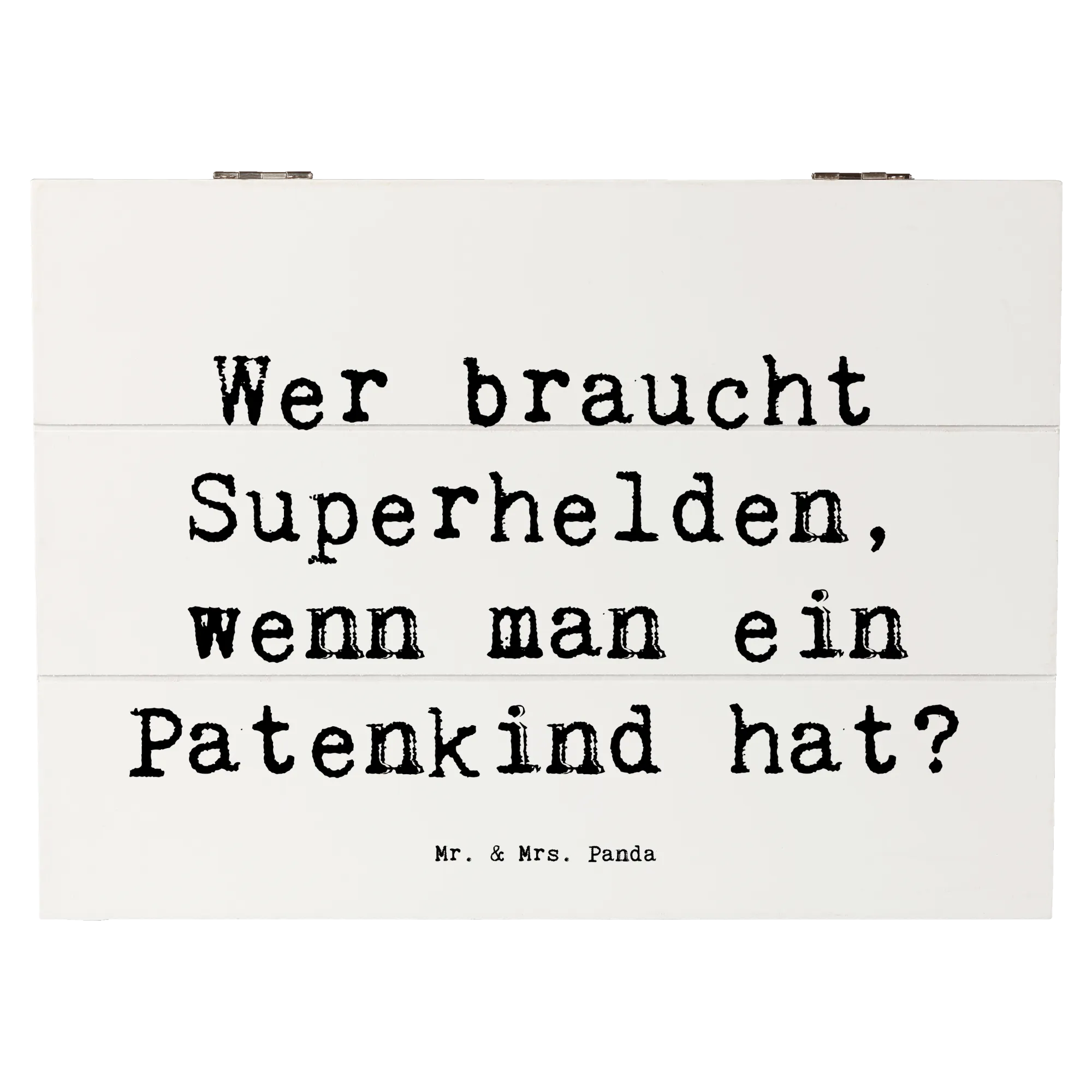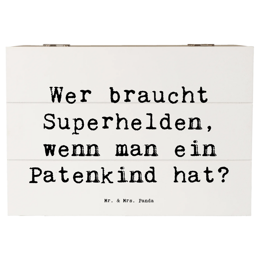 Die Botschaft 'Wer braucht Superhelden, wenn man ein Patenkind hat?' bringt die außergewöhnliche Beziehung zwischen einem Paten und seinem Patenkind perfekt auf den Punkt und macht die Kiste zu einem liebevollen Geschenk.