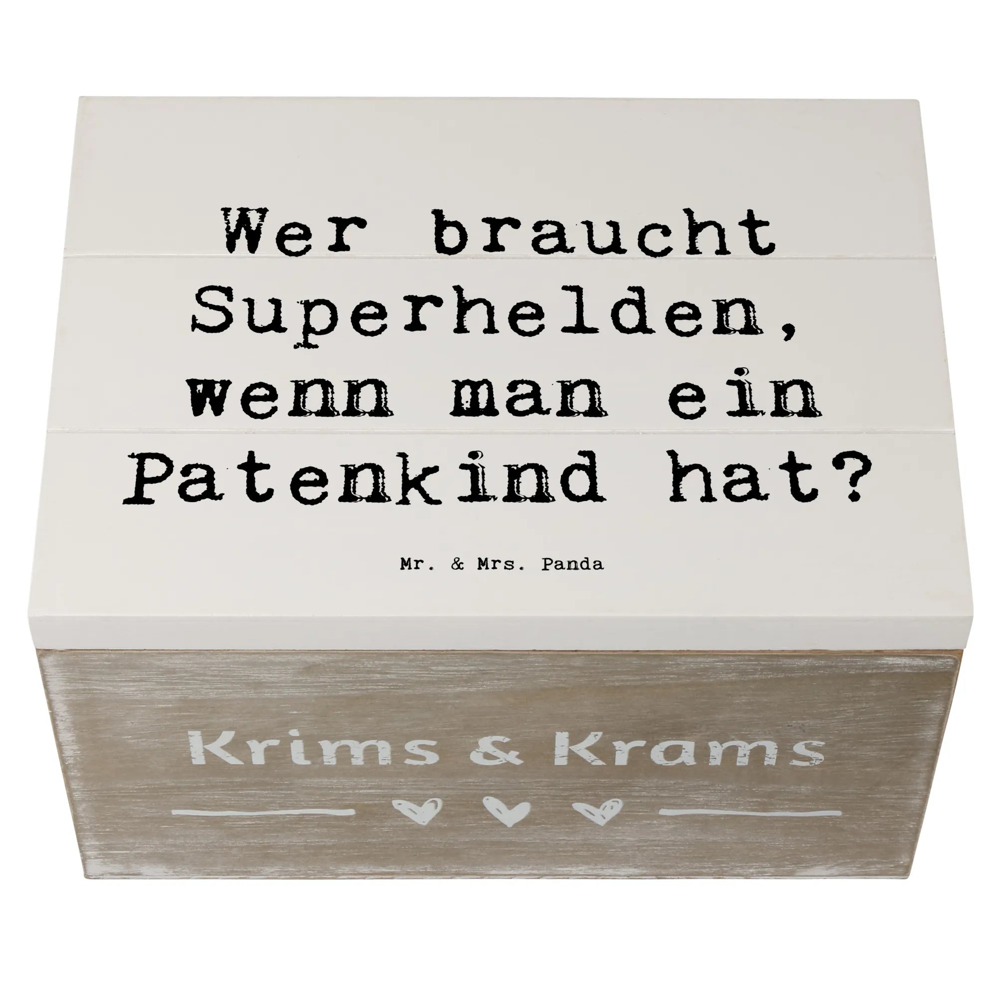 Die wunderschöne Holzkiste von Mr. & Mrs. Panda ist das perfekte Geschenk für dein Patenkind! Diese liebevoll gestaltete Erinnerungskiste bringt Freude und hebt die besondere Bindung zwischen Paten und ihren Patenkindern hervor. Mit dem liebevollen Spruch "Wer braucht Superhelden, wenn man ein Patenkind hat?" zeigt sie auf ganz besondere Weise, wie wichtig dein Patenkind für dich ist.