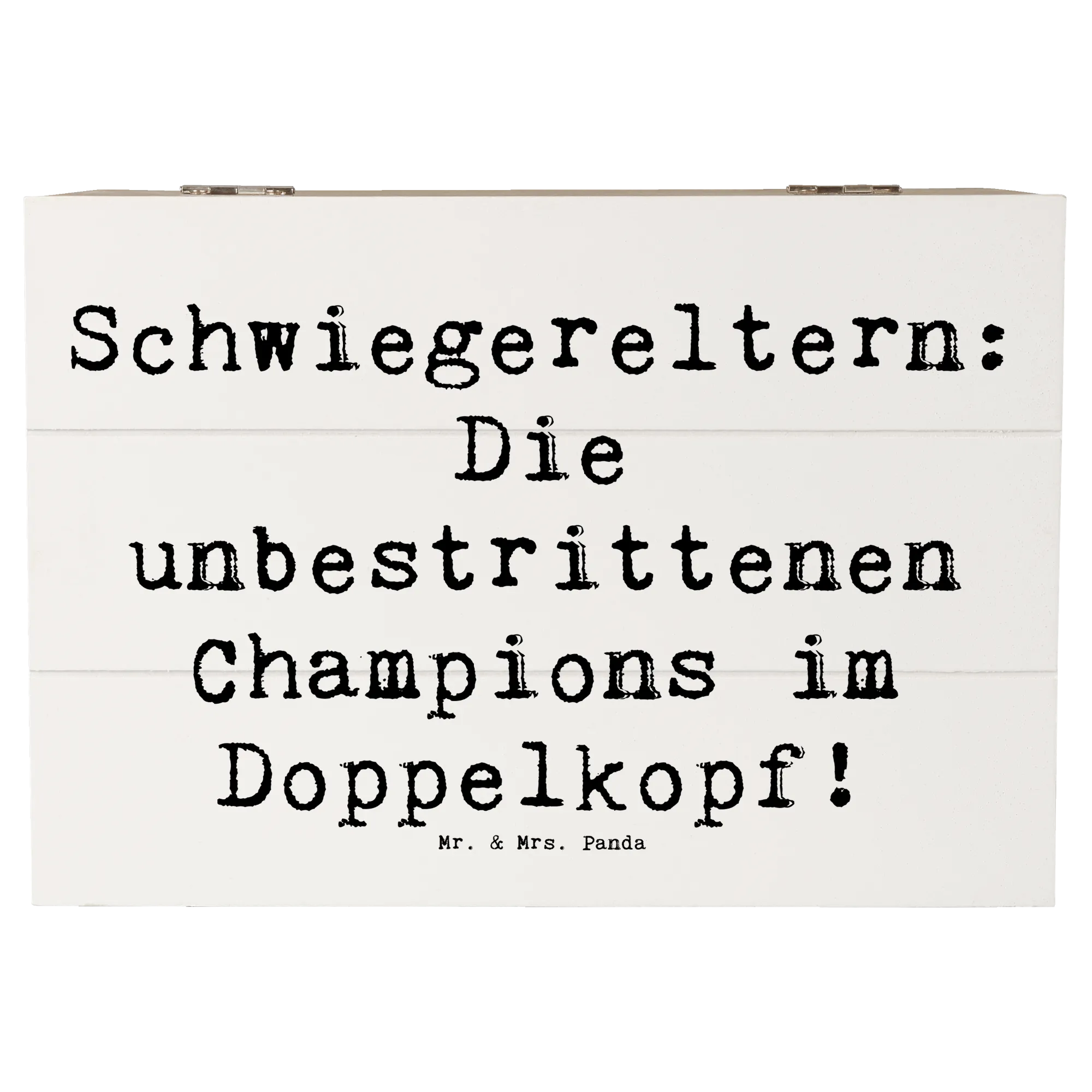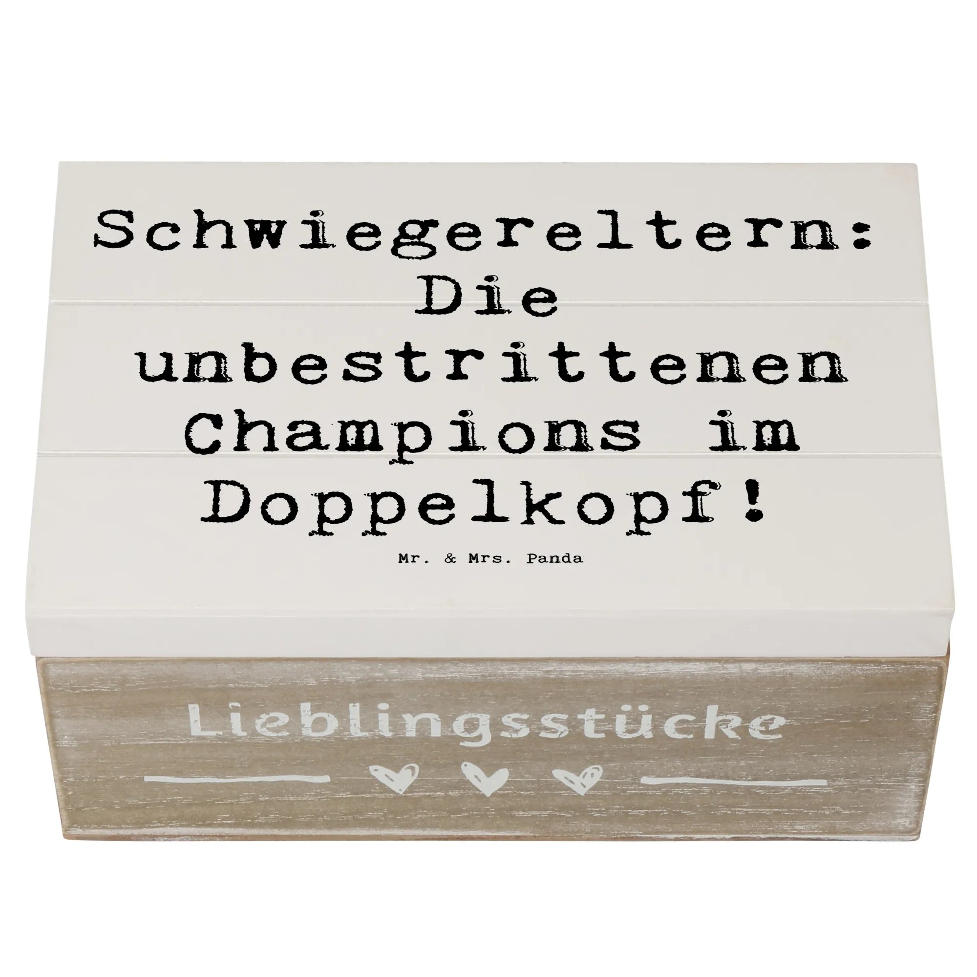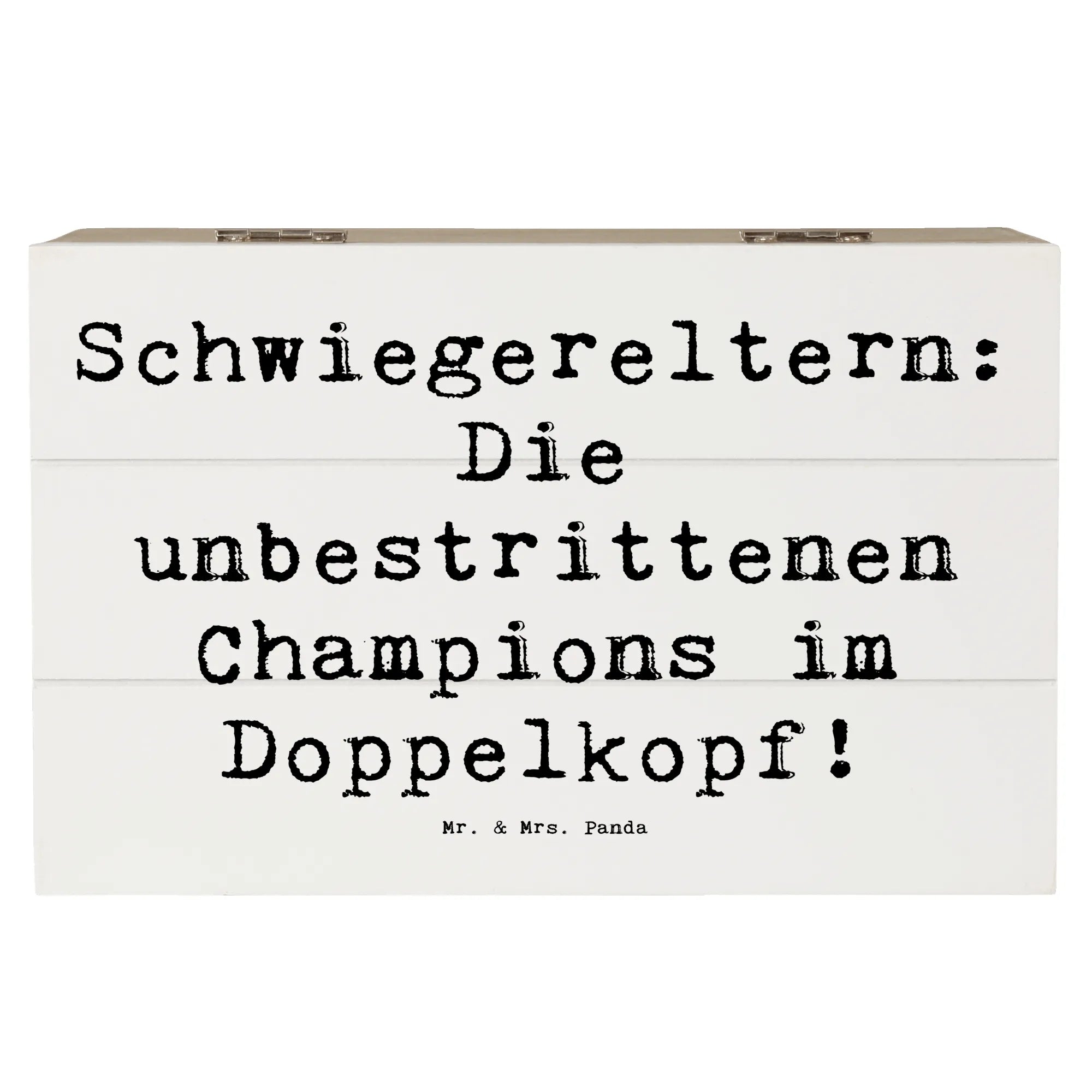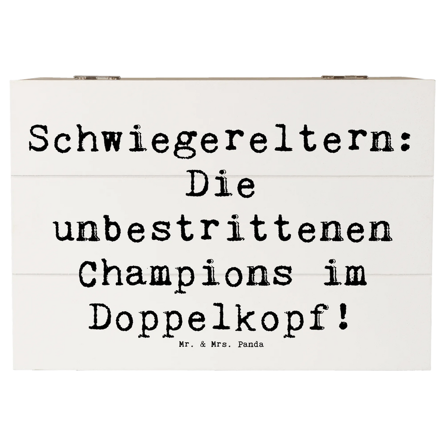 Diese wunderschöne Holzkiste von Mr. & Mrs. Panda ist das ideale Geschenk für Deine Schwiegereltern. Mit dem liebevollen Spruch "Schwiegereltern: Die unbestrittenen Champions im Doppelkopf!" wird diese Kiste zu einem absoluten Schmuckstück in jedem Zuhause.