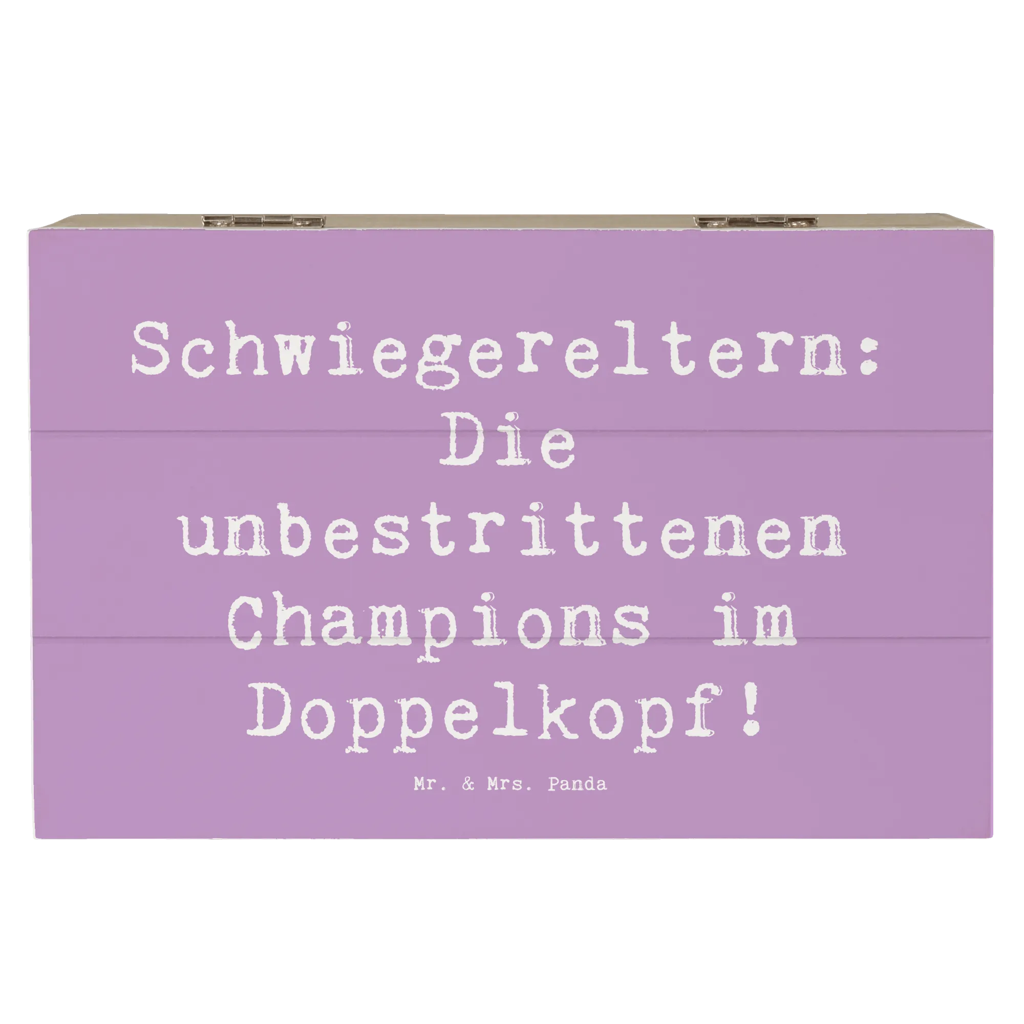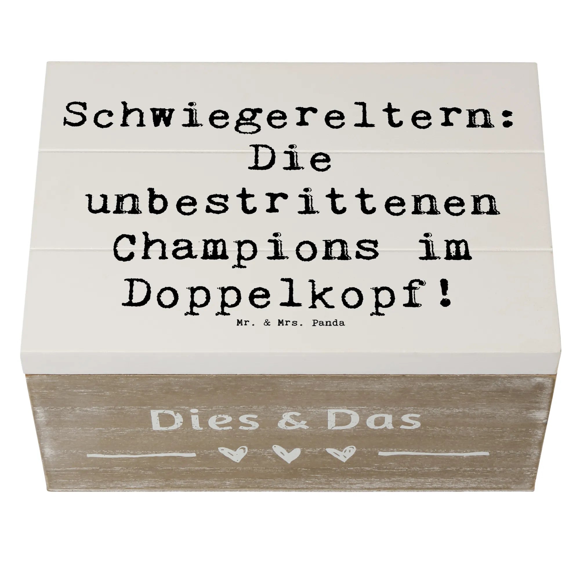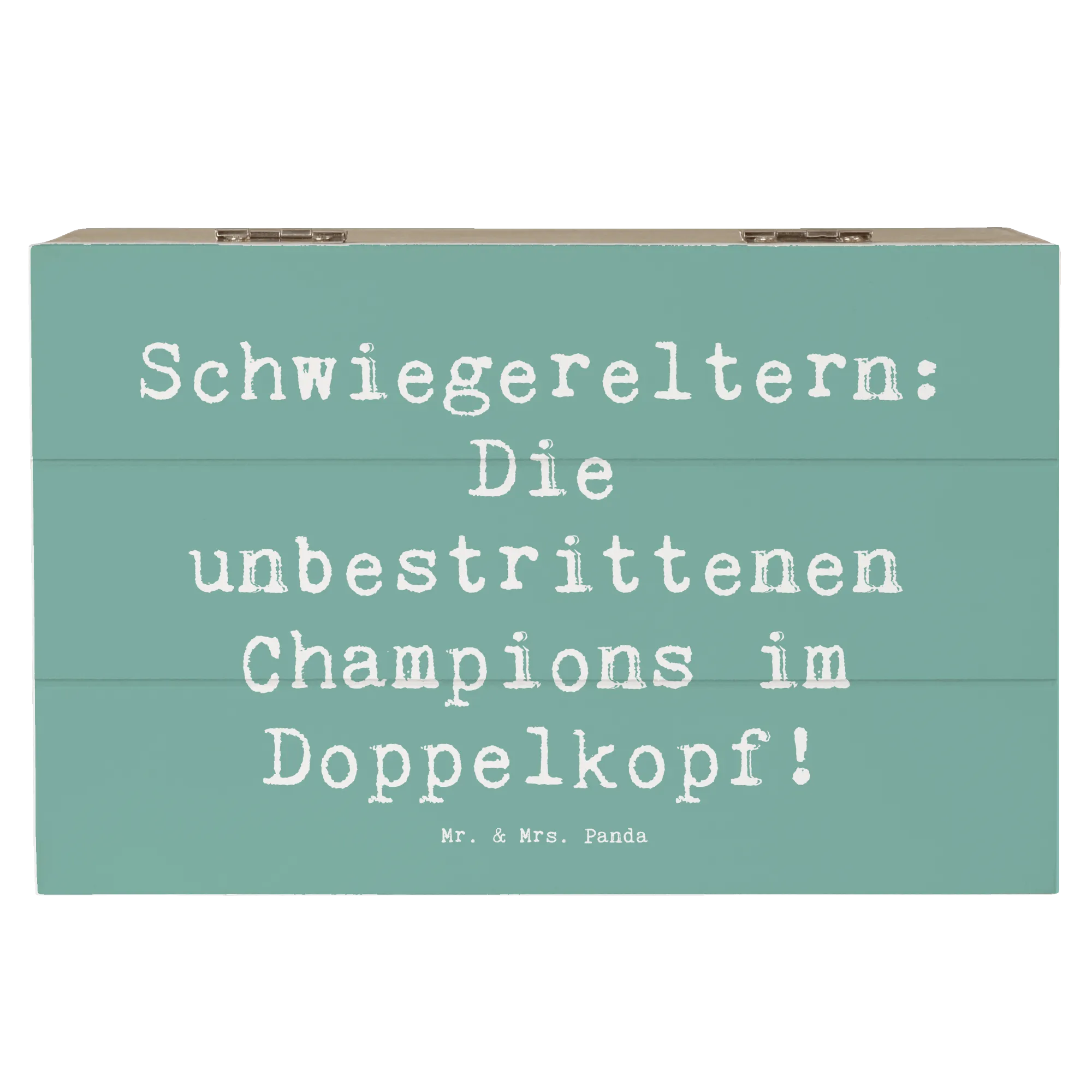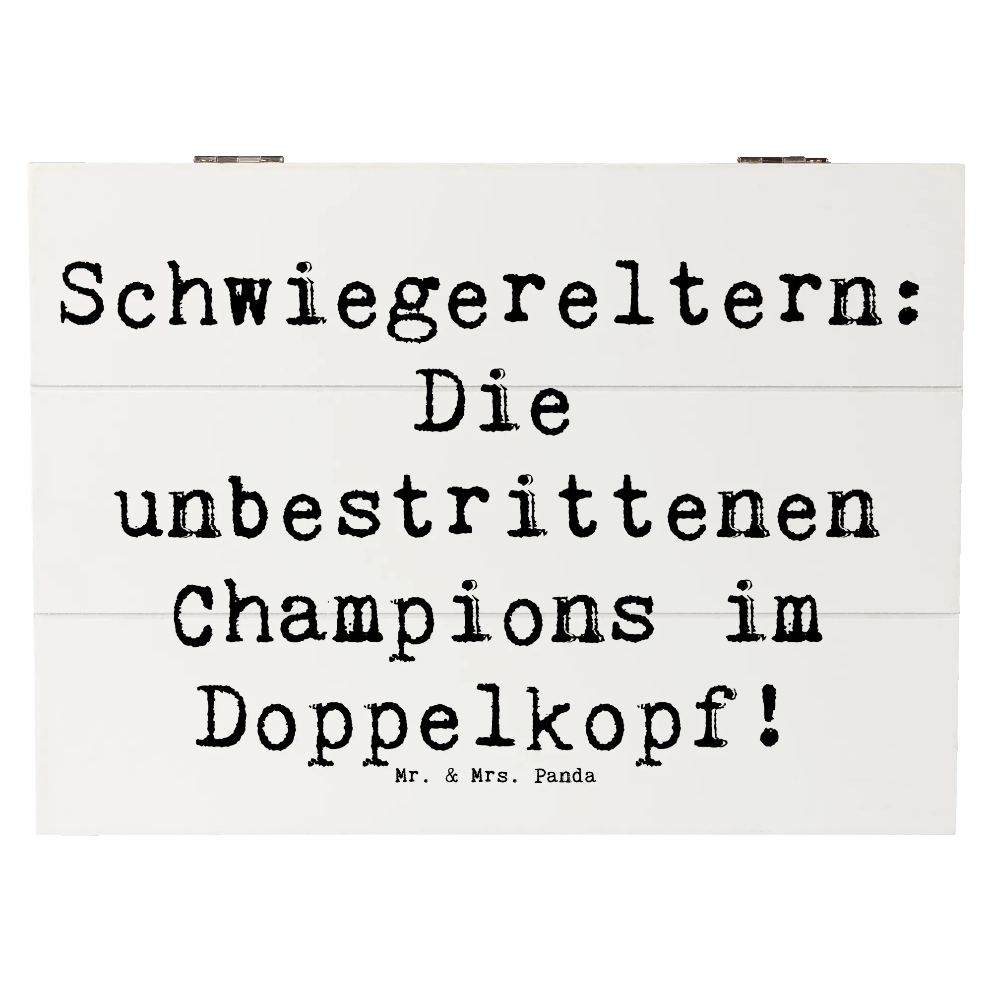 Diese wunderschöne Holzkiste von Mr. & Mrs. Panda ist das ideale Geschenk für Deine Schwiegereltern. Mit dem liebevollen Spruch "Schwiegereltern: Die unbestrittenen Champions im Doppelkopf!" wird diese Kiste zu einem absoluten Schmuckstück in jedem Zuhause.