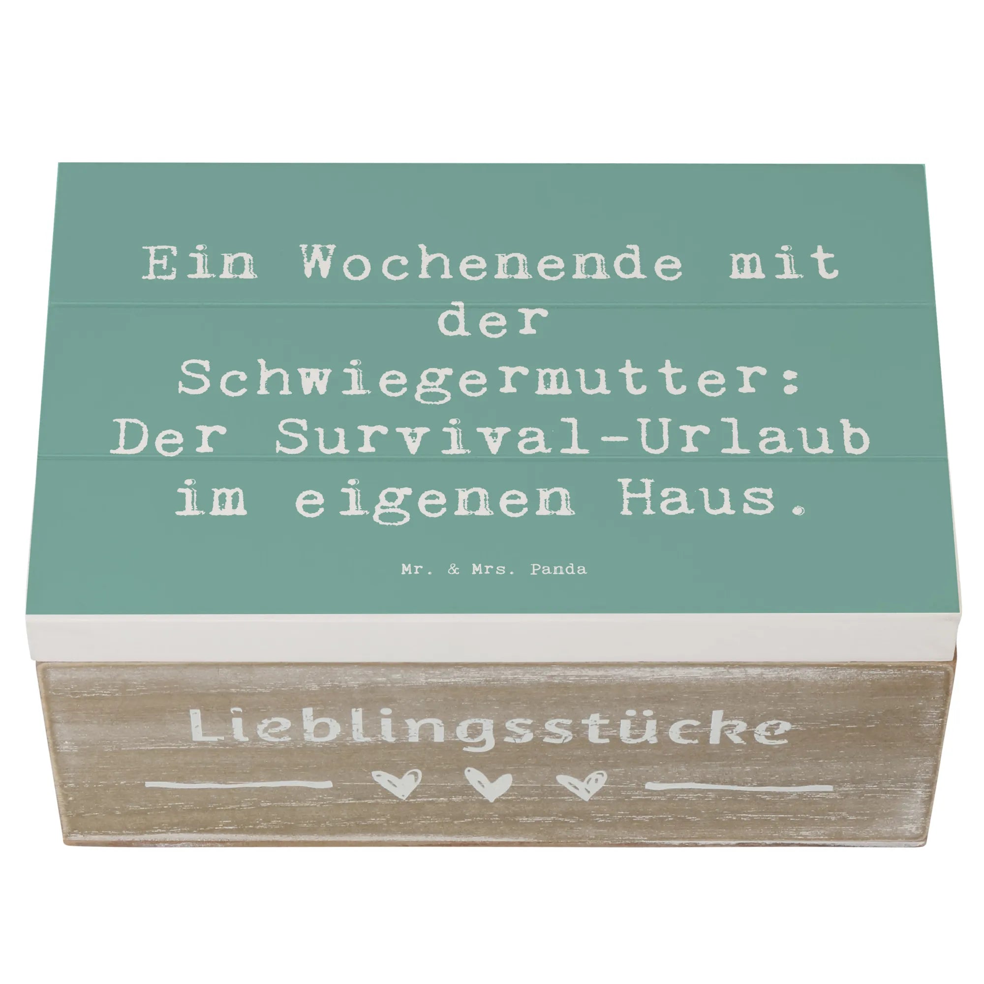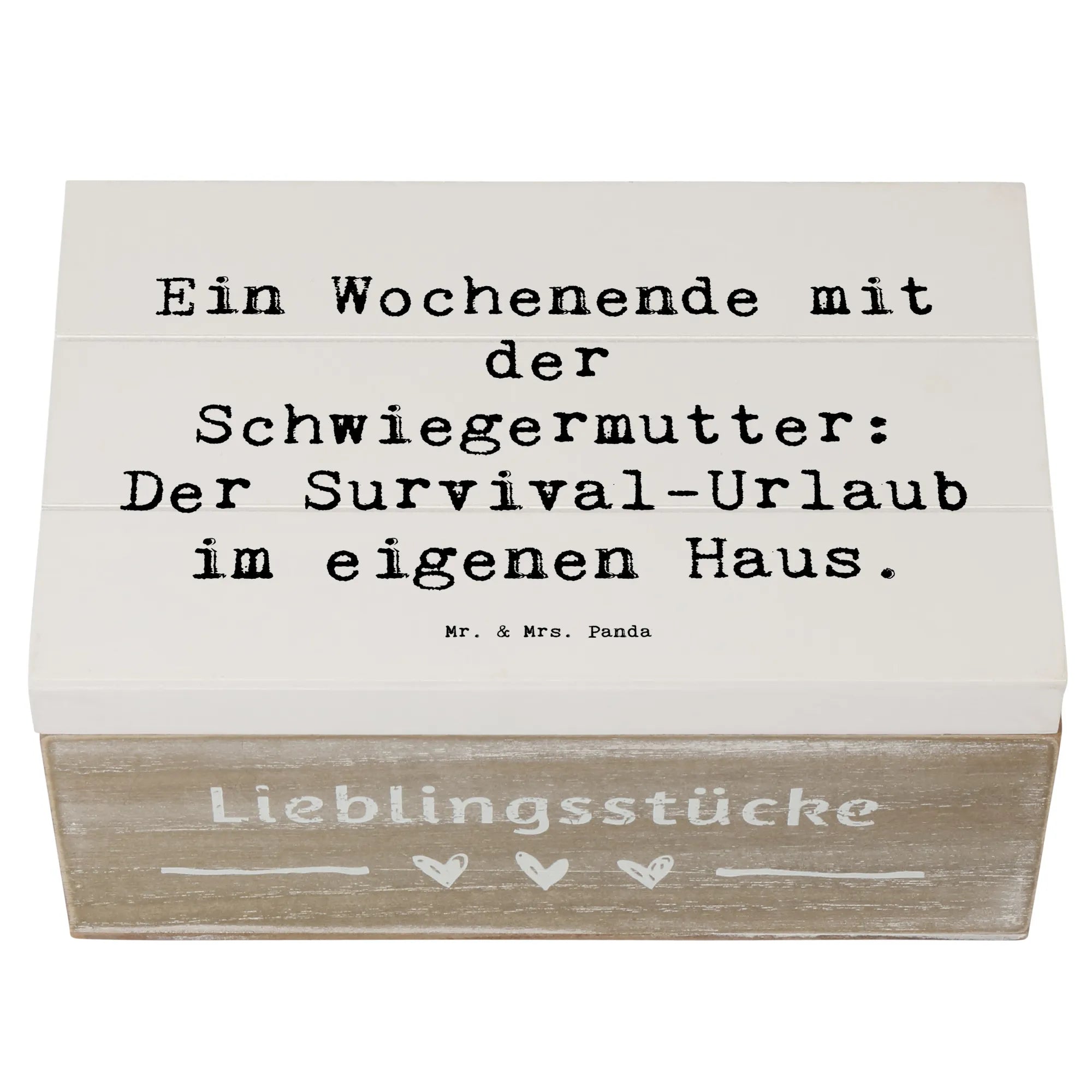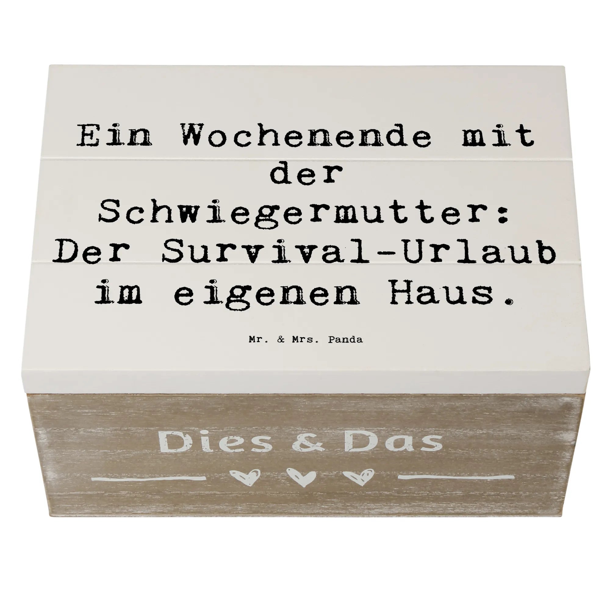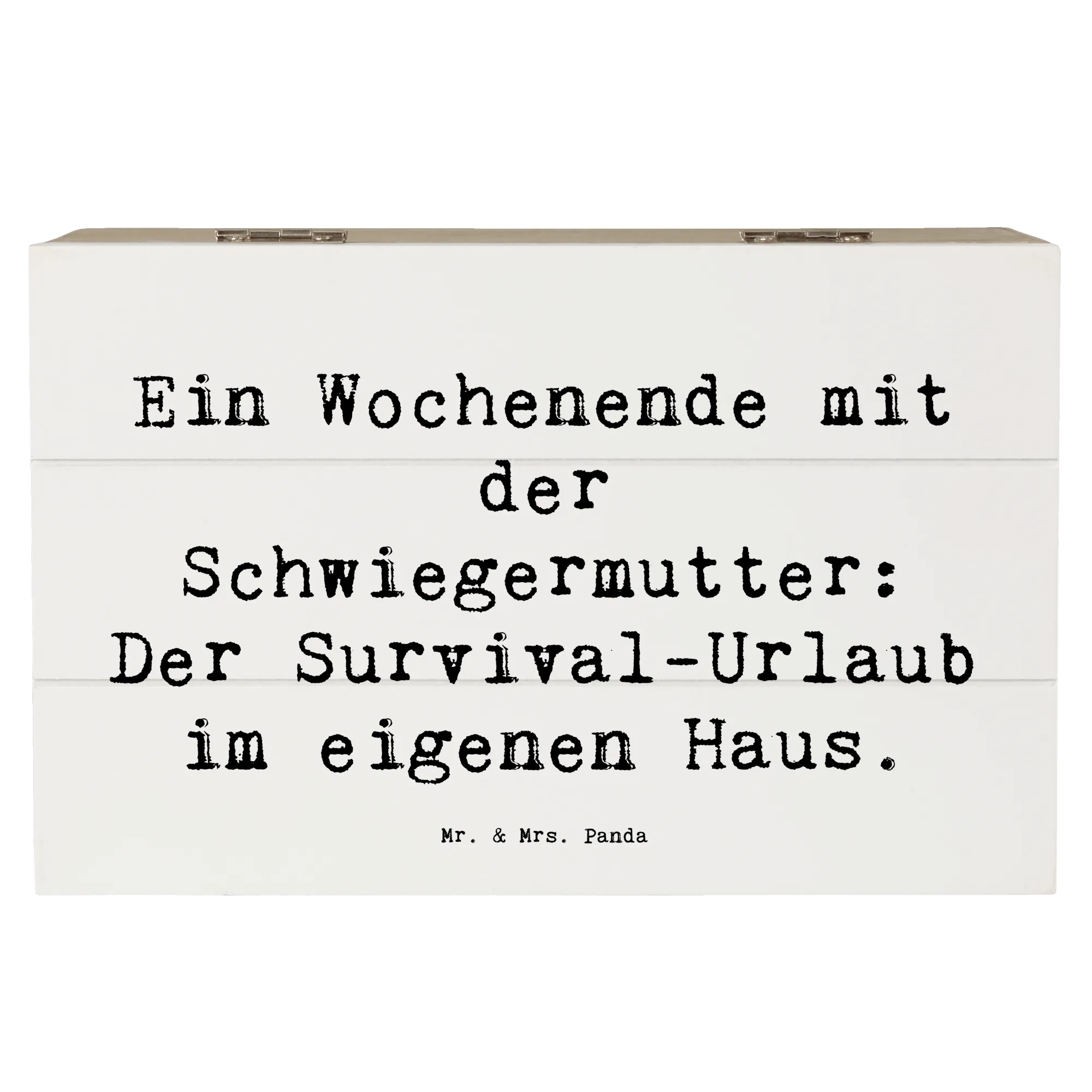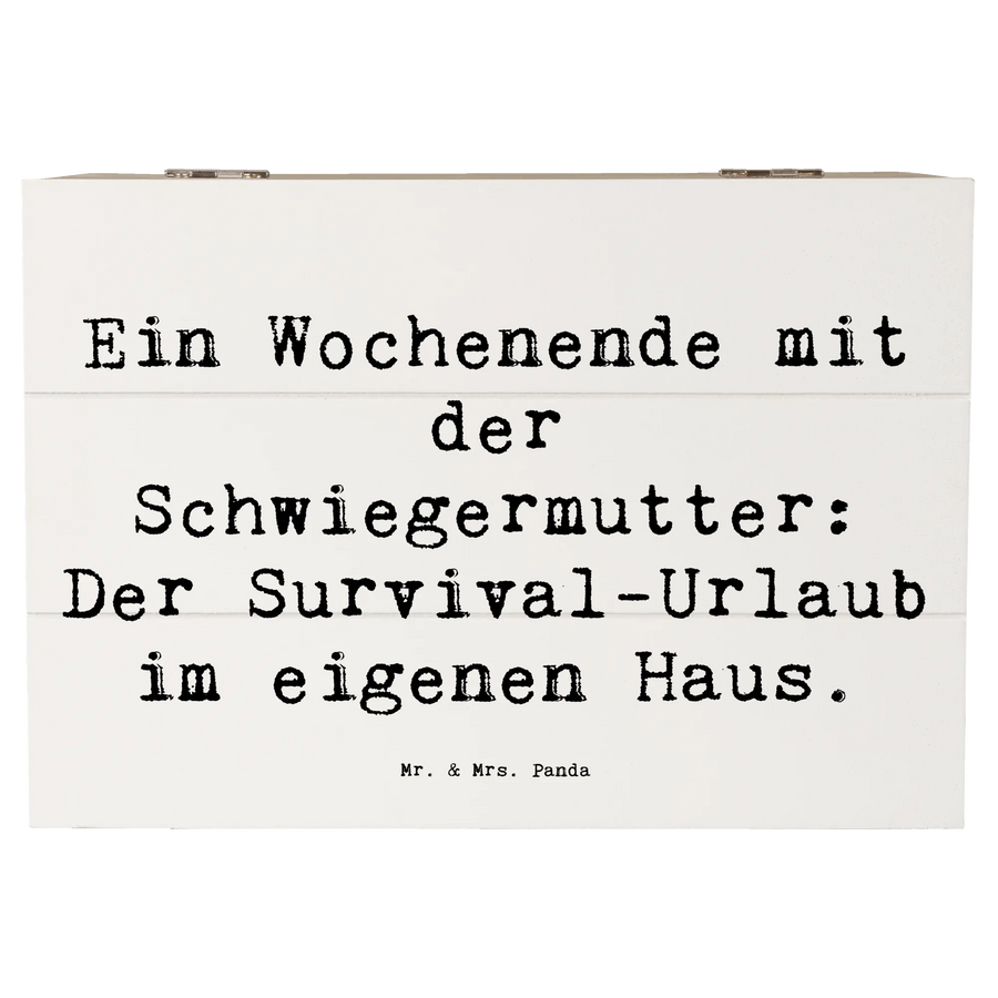 Die charmante Holzkiste von Mr. & Mrs. Panda ist das perfekte Geschenk für Deine Schwiegermutter! Sie wurde liebevoll mit dem Spruch "Ein Wochenende mit der Schwiegermutter: Der Survival-Urlaub im eigenen Haus." versehen und gehört zur exklusiven Kollektion Familie & Verwandte. Diese wunderschöne Erinnerungskiste ist nicht nur besonders stabil, sondern bietet auch einen idealen Aufbewahrungsort für all die wertvollen Schätze, die man im Laufe der Jahre gesammelt hat. Ob Fotos, kleine Geschenkideen oder andere Erinnerungsstücke – hier ist alles gut geschützt und immer griffbereit.