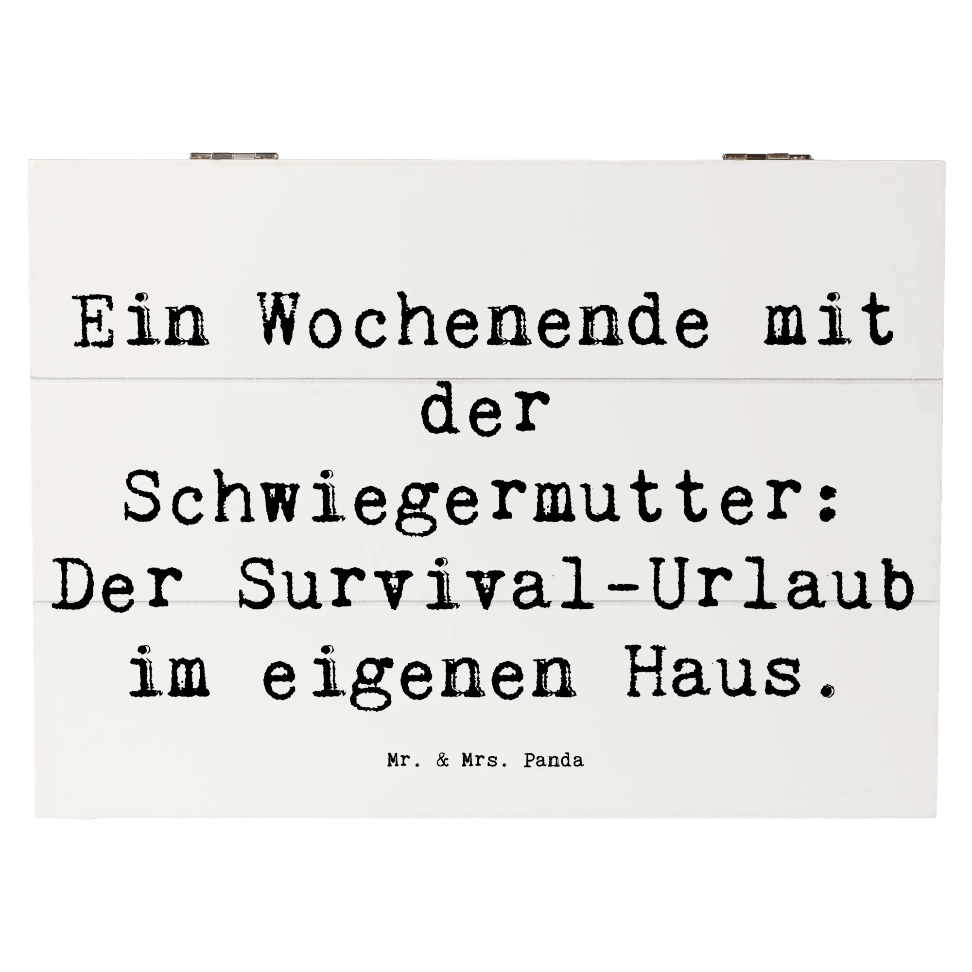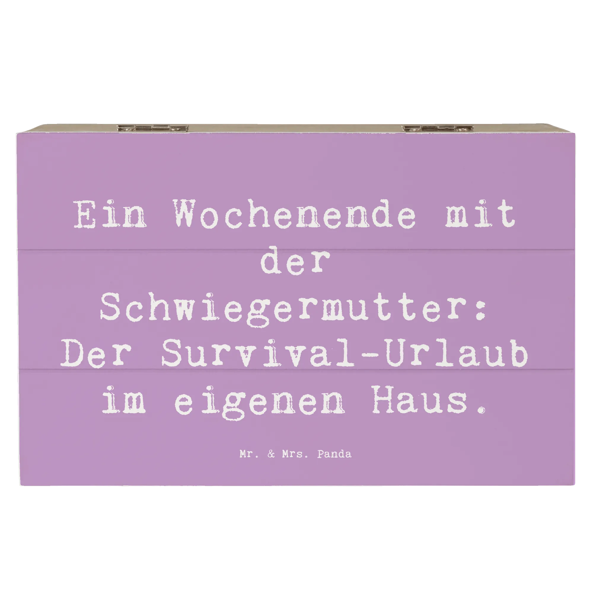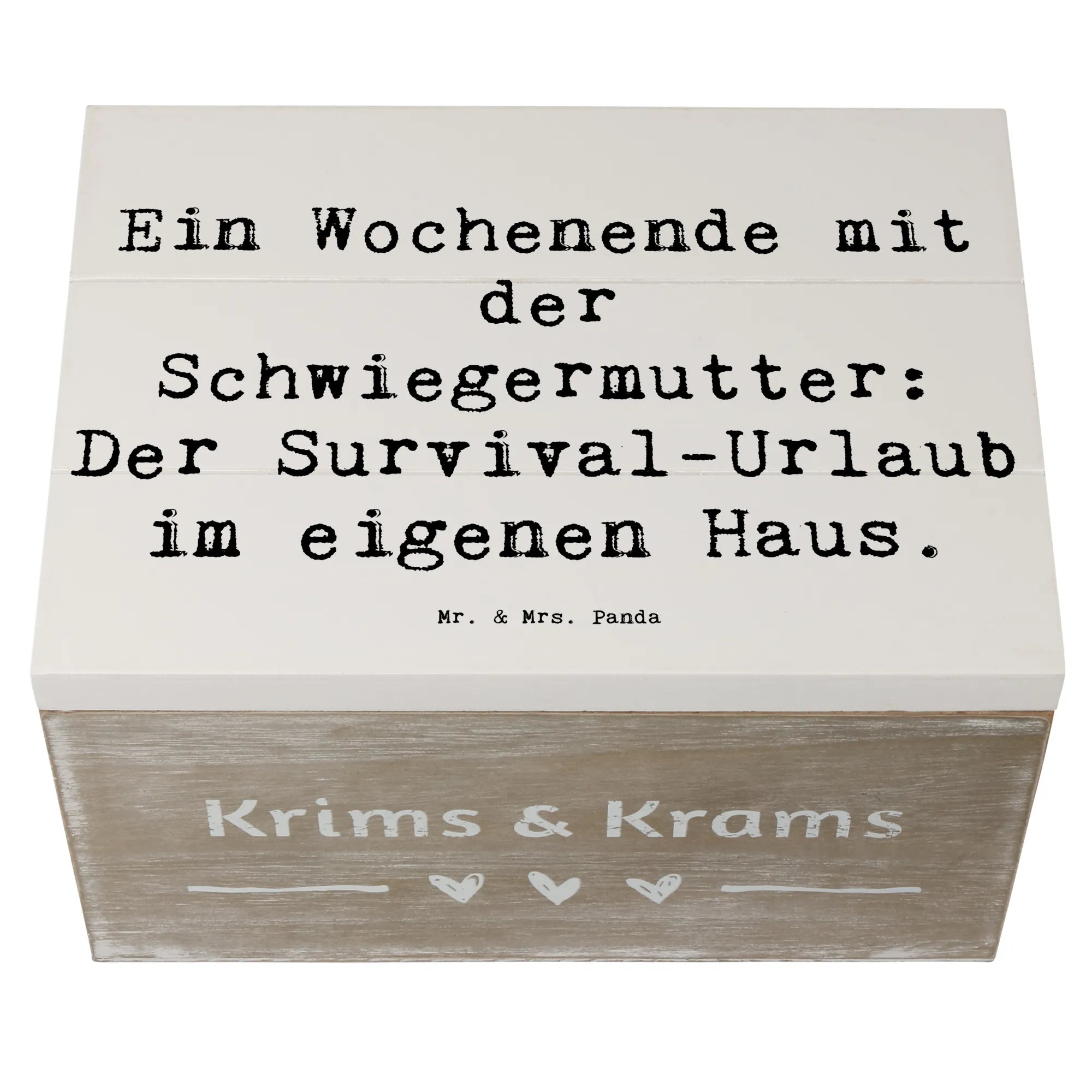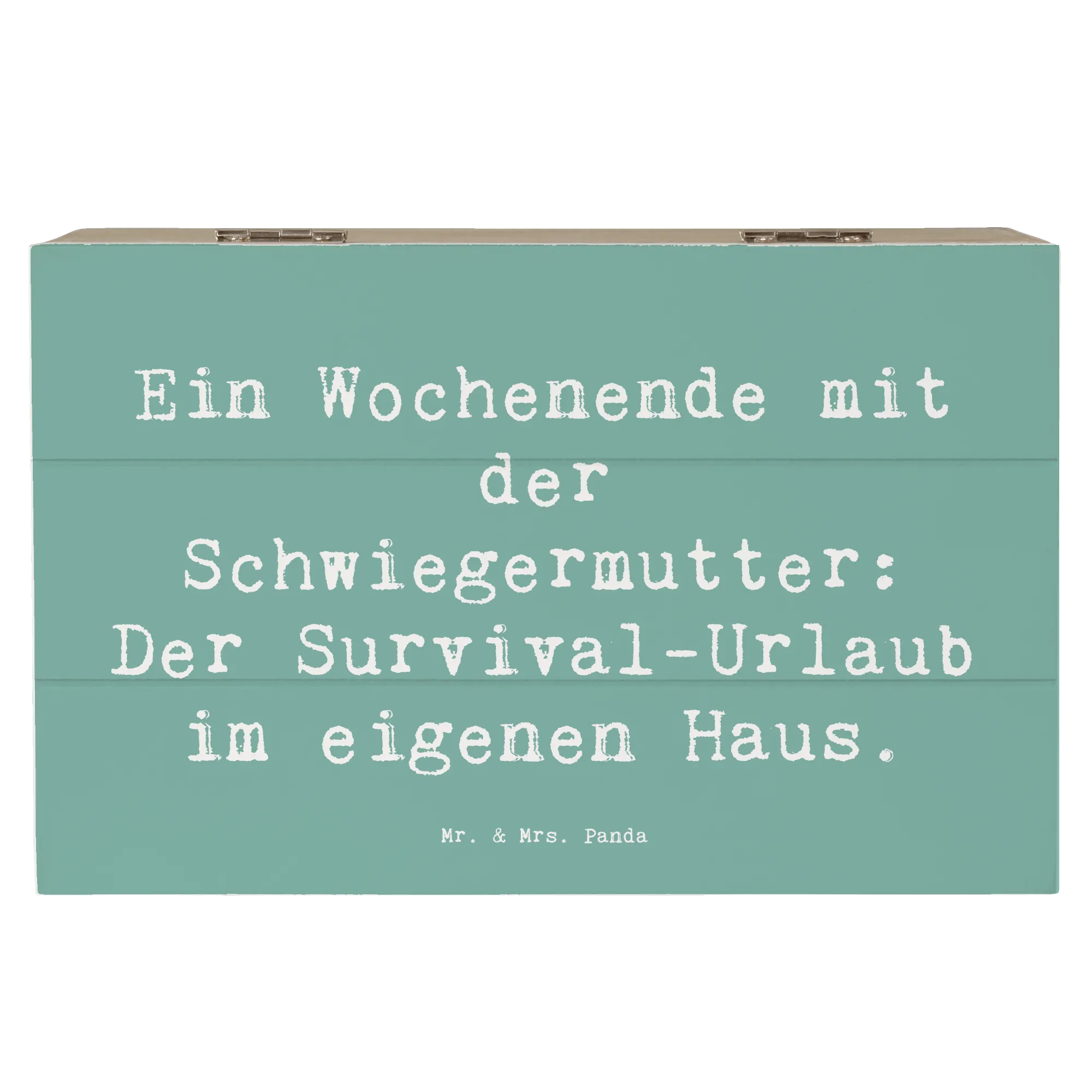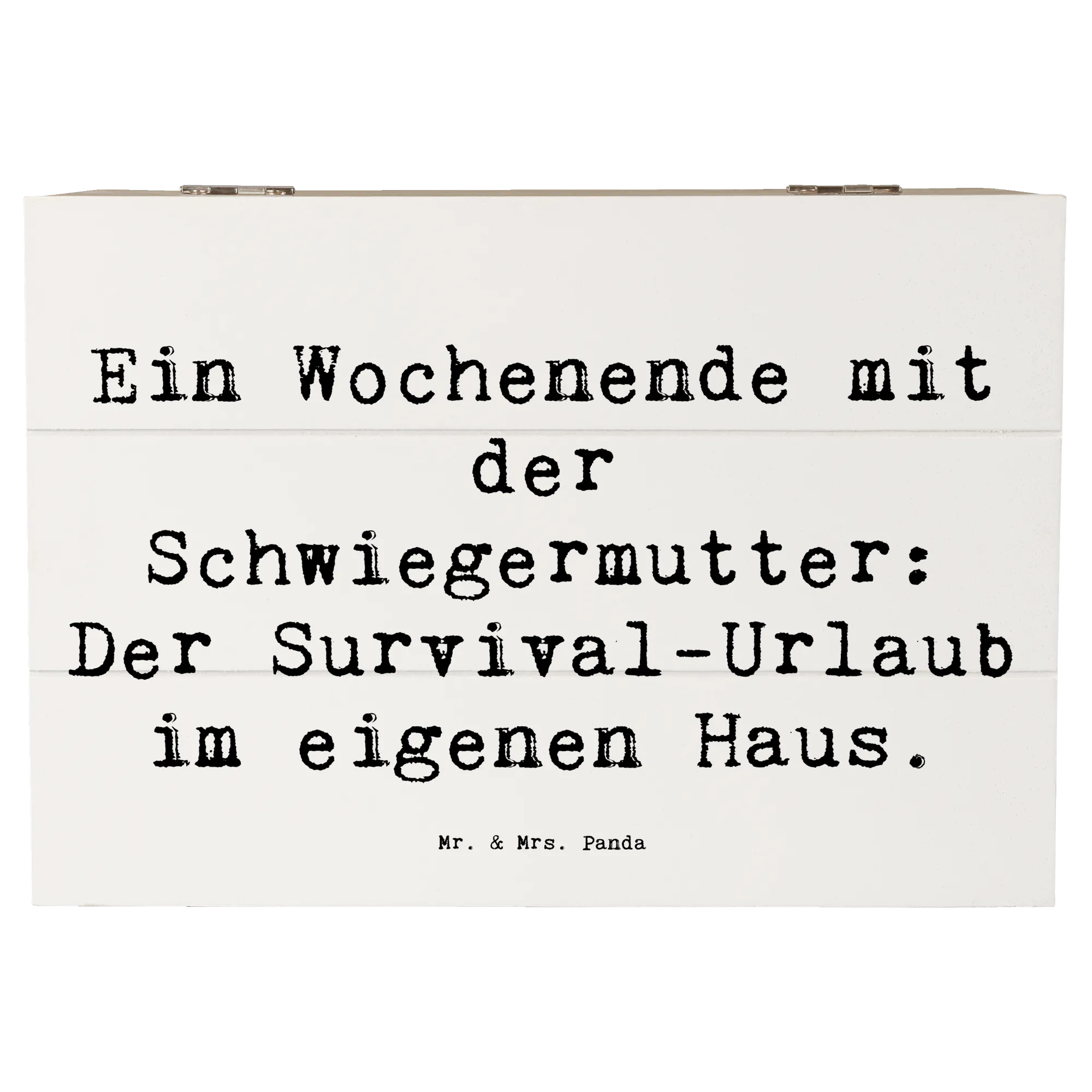 Die charmante Holzkiste von Mr. & Mrs. Panda ist das perfekte Geschenk für Deine Schwiegermutter! Sie wurde liebevoll mit dem Spruch "Ein Wochenende mit der Schwiegermutter: Der Survival-Urlaub im eigenen Haus." versehen und gehört zur exklusiven Kollektion Familie & Verwandte. Diese wunderschöne Erinnerungskiste ist nicht nur besonders stabil, sondern bietet auch einen idealen Aufbewahrungsort für all die wertvollen Schätze, die man im Laufe der Jahre gesammelt hat. Ob Fotos, kleine Geschenkideen oder andere Erinnerungsstücke – hier ist alles gut geschützt und immer griffbereit.