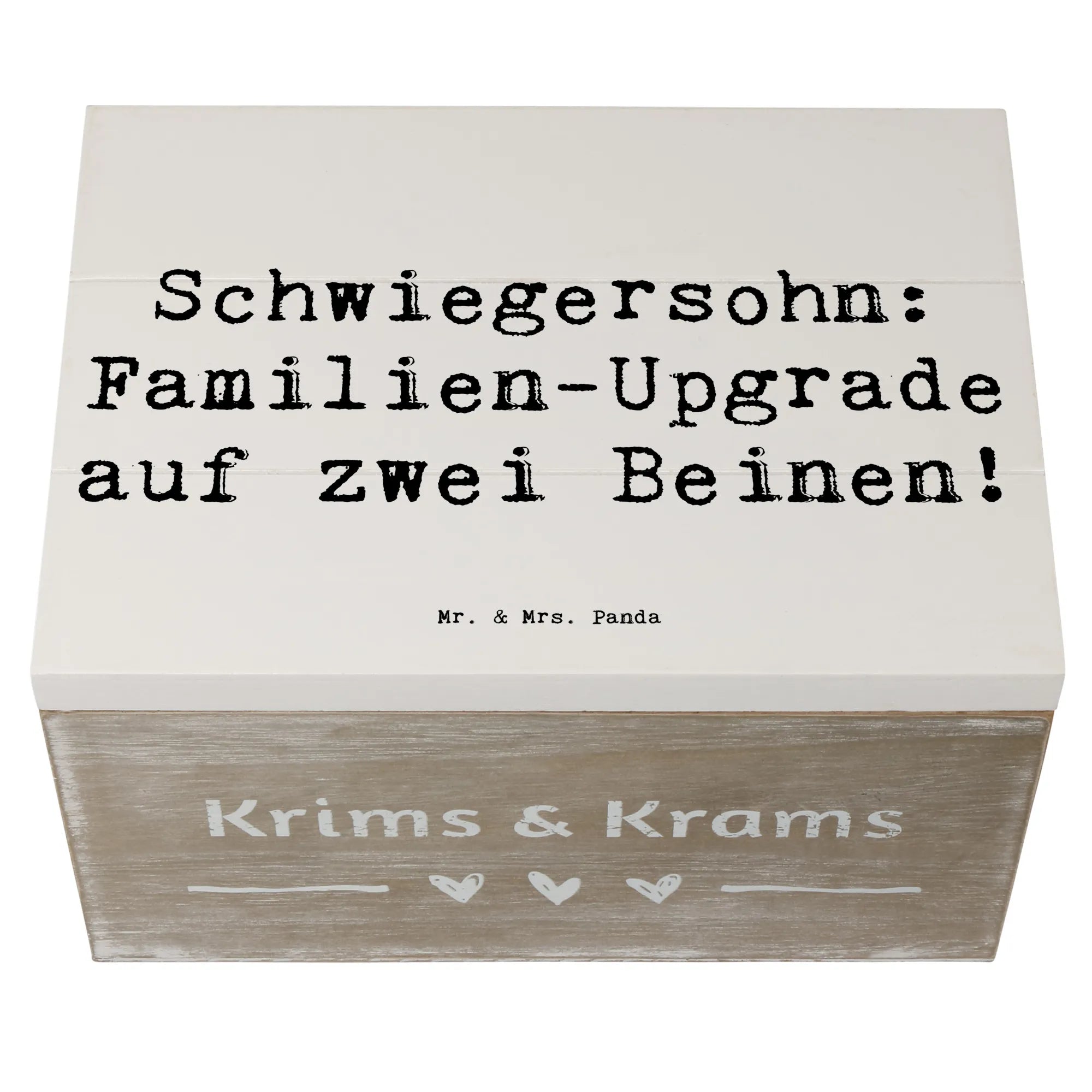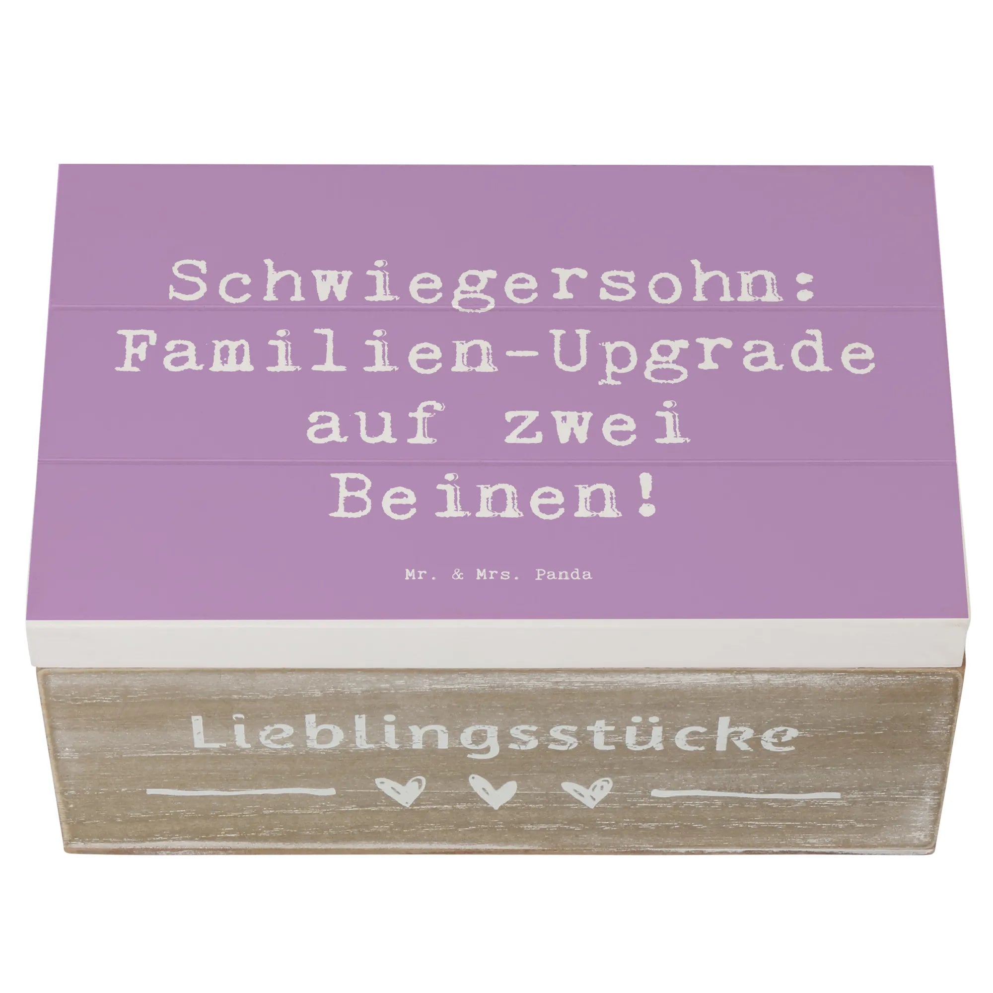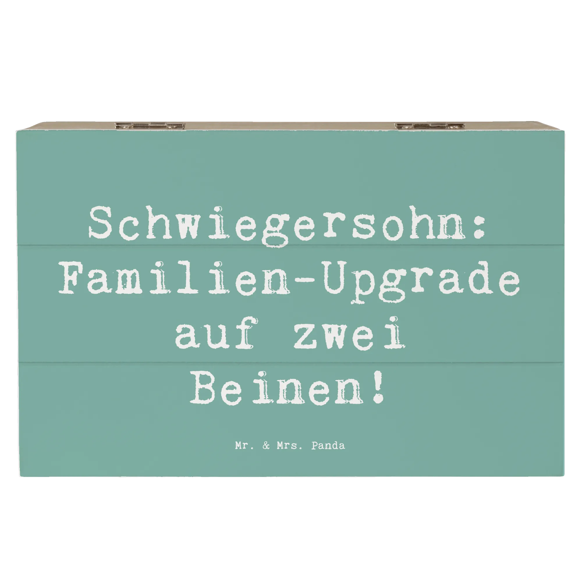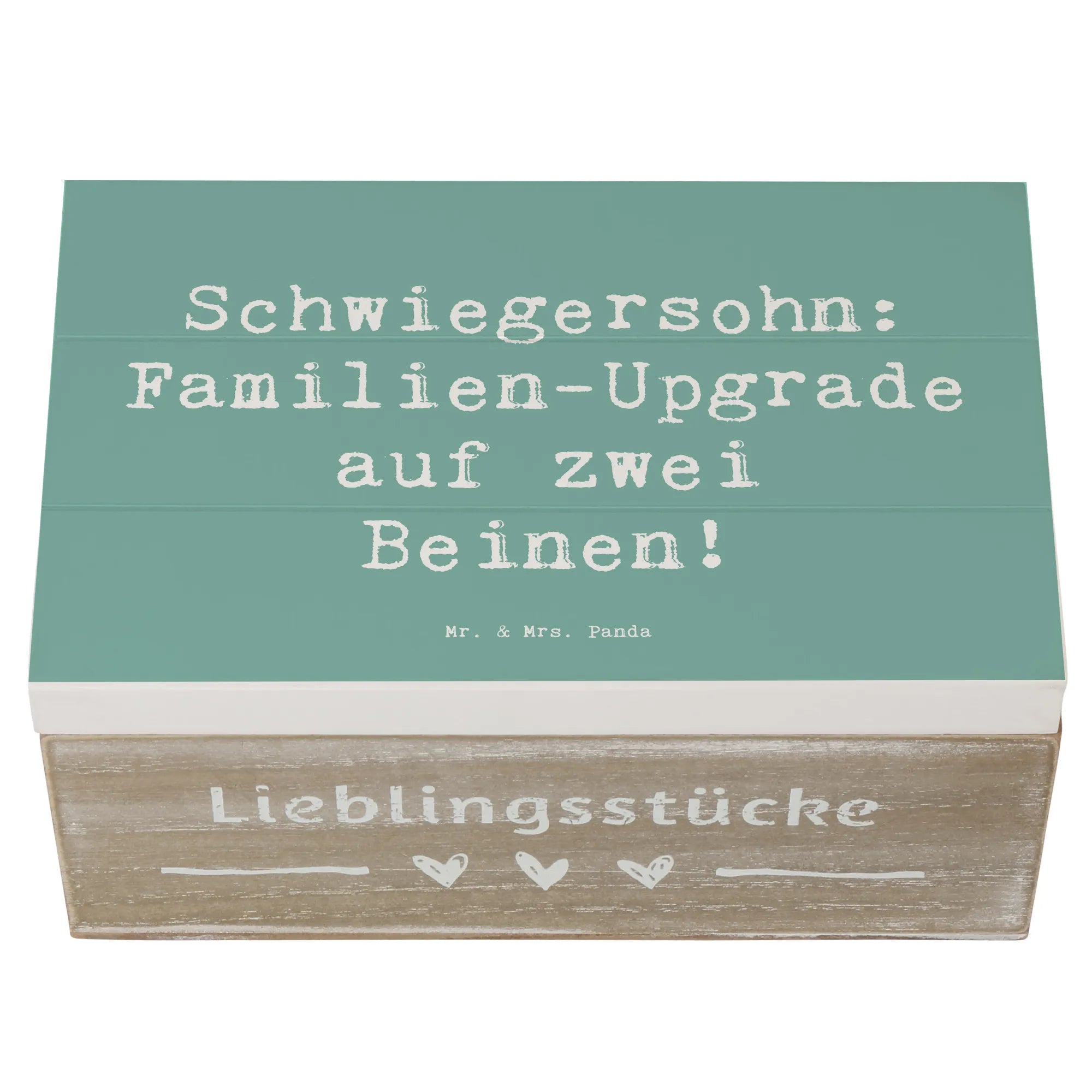 Mit dem liebevoll gestalteten Spruch "Schwiegersohn: Familien-Upgrade auf zwei Beinen!" wird diese Kiste zum perfekten Symbol für die wunderbare Verbindung, die ihr in der Familie habt. Diese Kiste ist mehr als nur ein Aufbewahrungsort; sie ist ein Platz für all die besonderen Momente und Erinnerungen, die ihr zusammen geschaffen habt.
