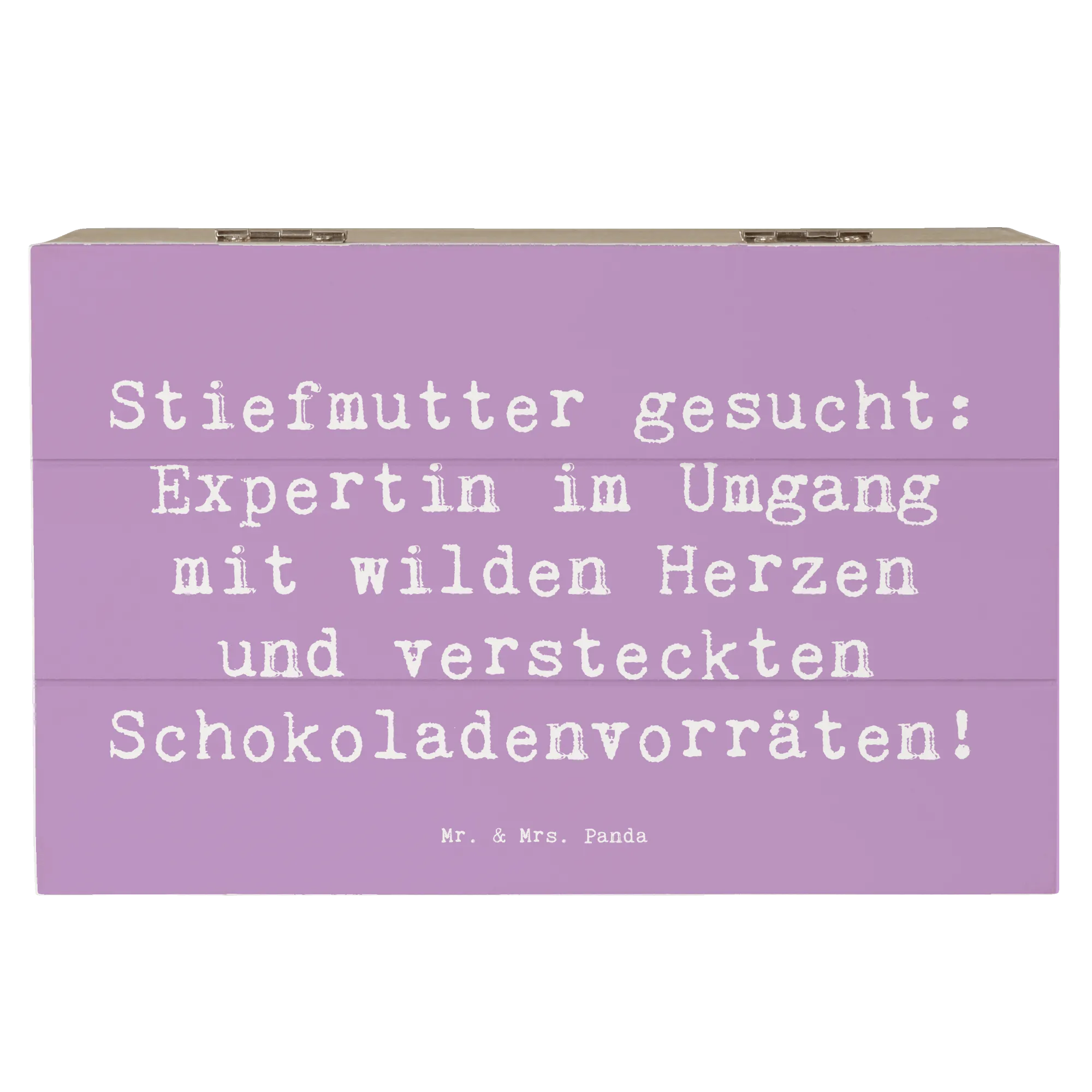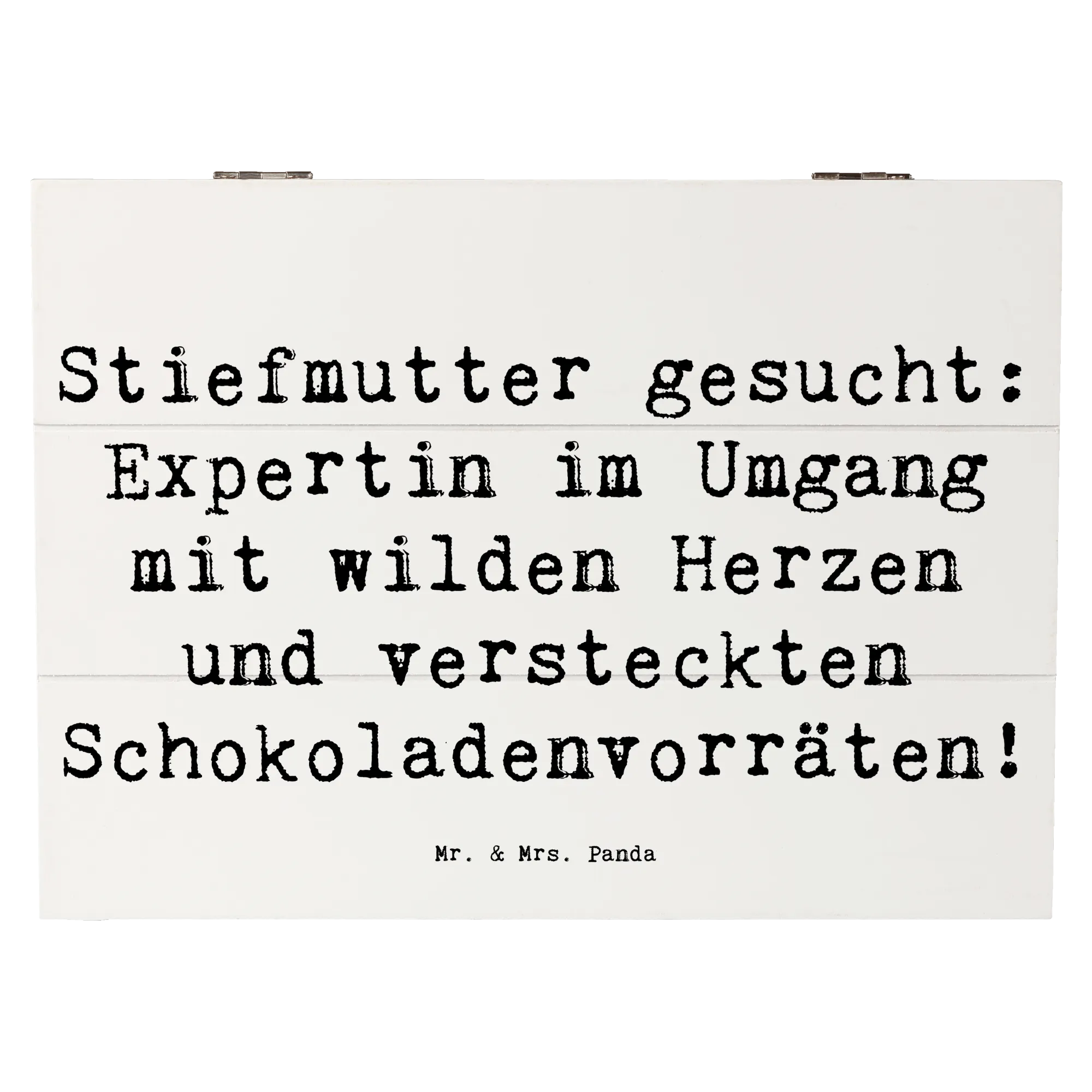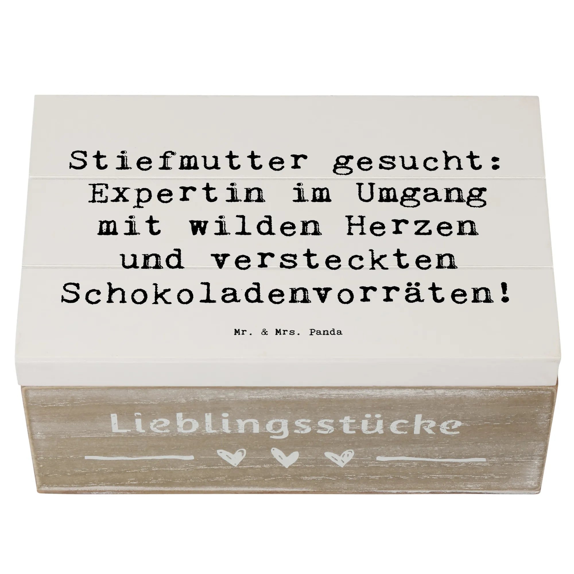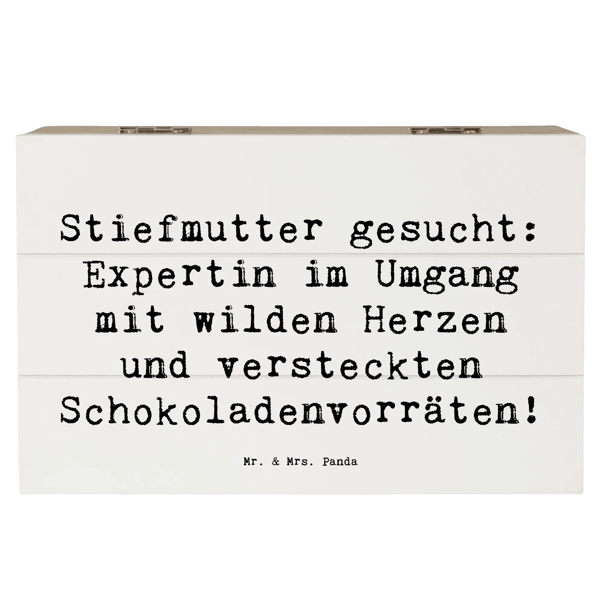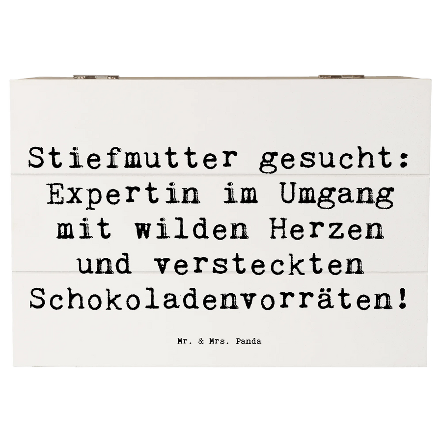 Entdecke die wunderschöne Holzkiste von Mr. & Mrs. Panda mit dem liebevollen Motiv "Stiefmutter gesucht: Expertin im Umgang mit wilden Herzen und versteckten Schokoladenvorräten!" Diese besondere Kiste ist nicht nur ein schöner Blickfang, sondern bietet auch den perfekten Aufbewahrungsort für all Deine kostbaren Erinnerungen.