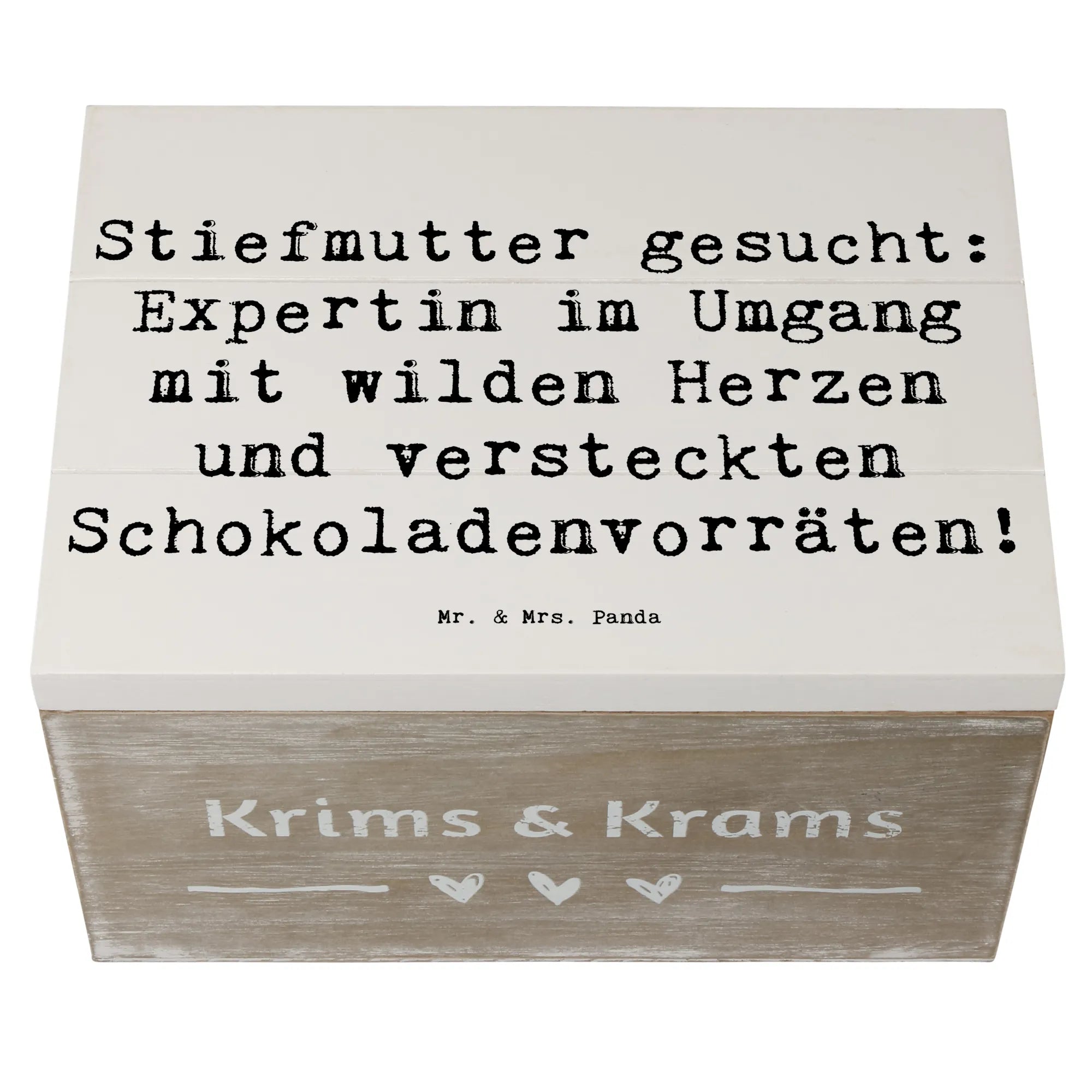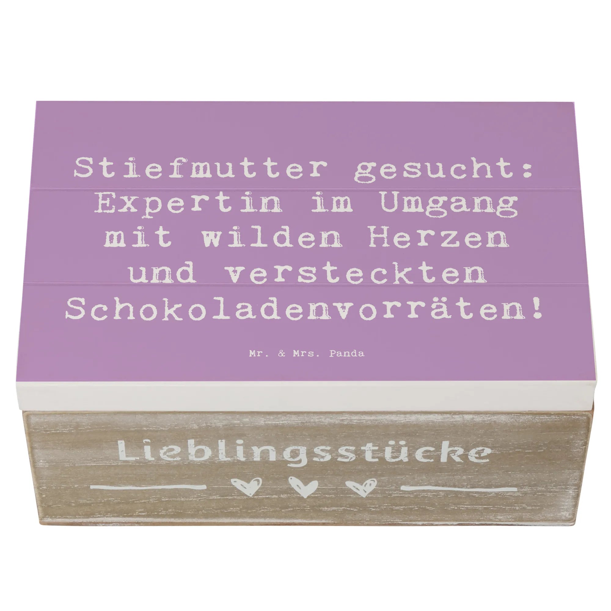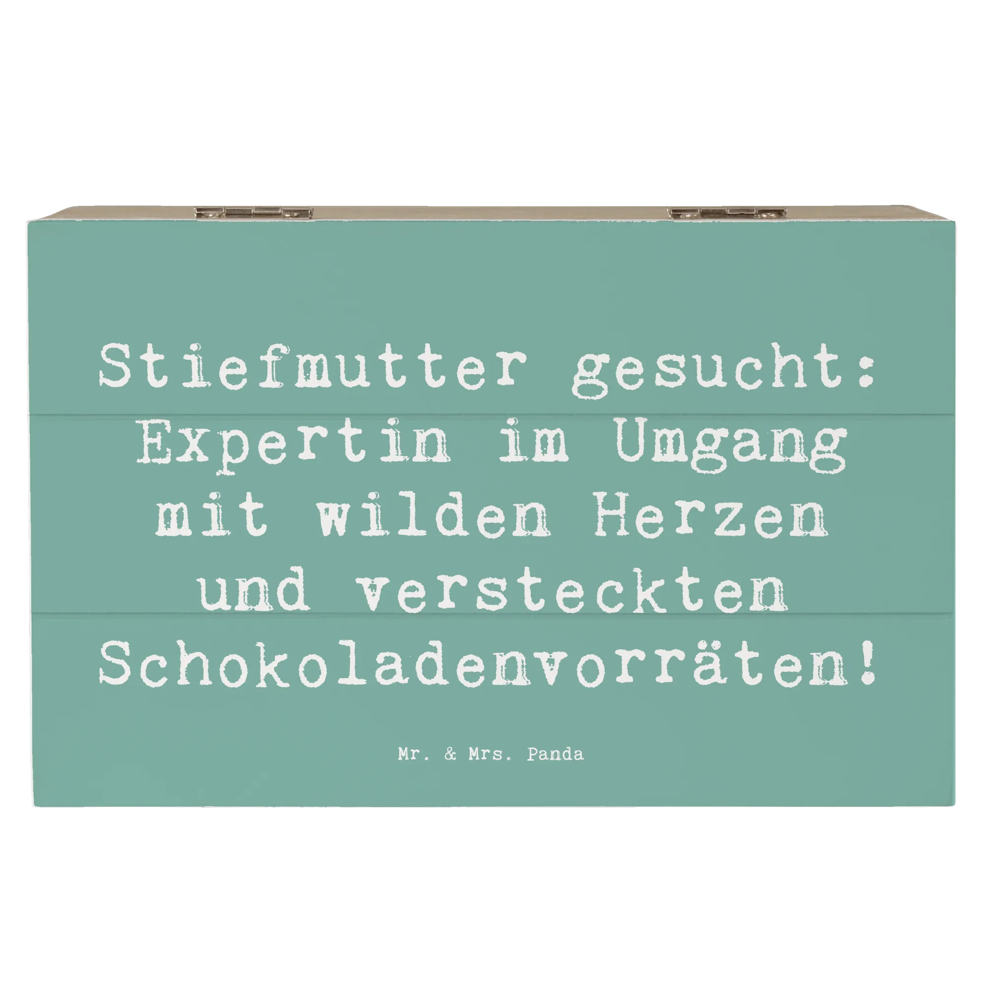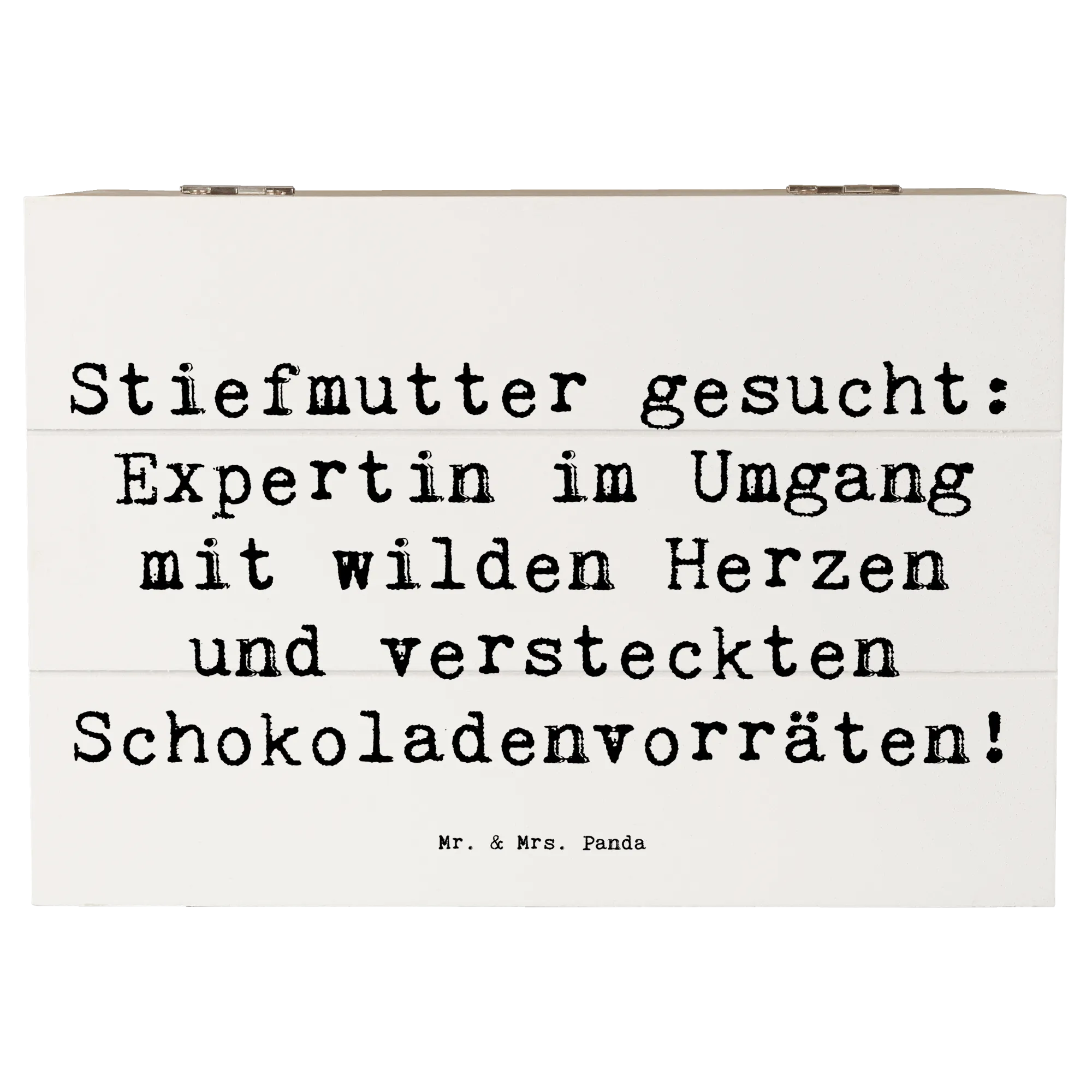 Entdecke die wunderschöne Holzkiste von Mr. & Mrs. Panda mit dem liebevollen Motiv "Stiefmutter gesucht: Expertin im Umgang mit wilden Herzen und versteckten Schokoladenvorräten!" Diese besondere Kiste ist nicht nur ein schöner Blickfang, sondern bietet auch den perfekten Aufbewahrungsort für all Deine kostbaren Erinnerungen.