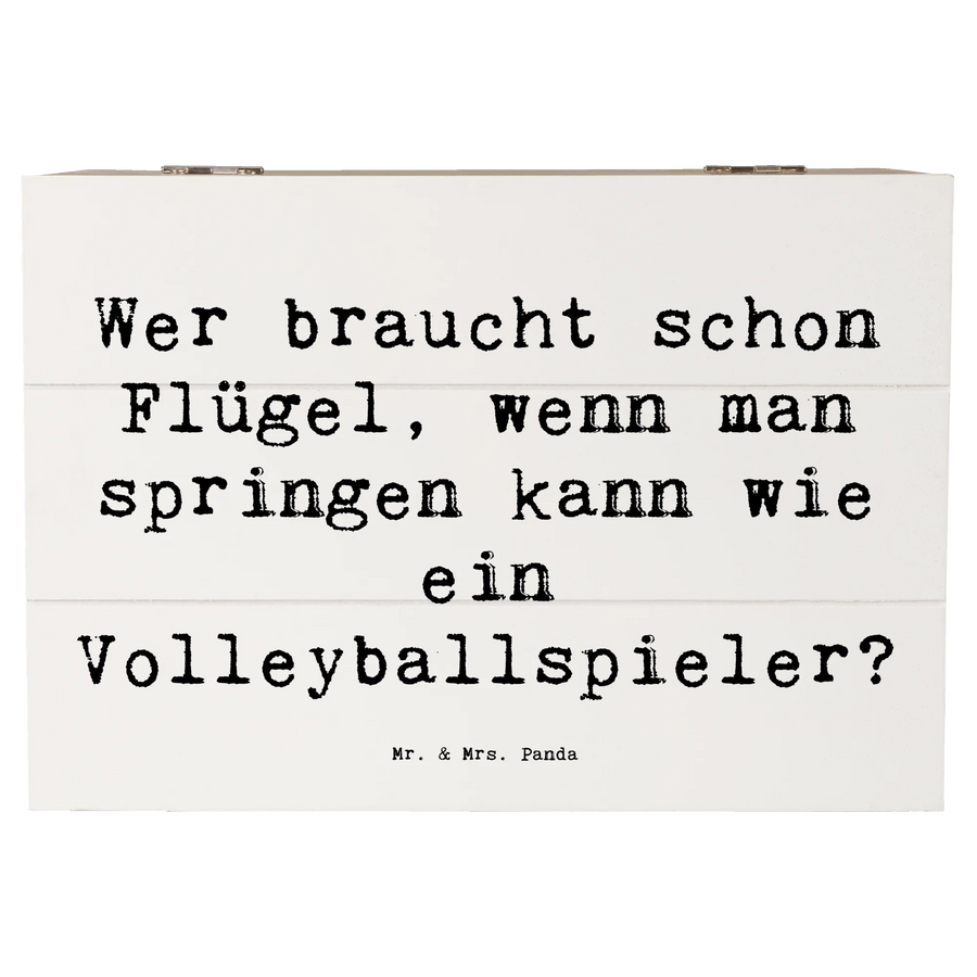 Eine wunderschöne Holzkiste von Mr. & Mrs. Panda – perfekt für alle Volleyball-Fans und Sportler. Diese Holzbox trägt den frechen Spruch „Wer braucht schon Flügel, wenn man springen kann wie ein Volleyballspieler?“ und gehört zur liebevoll gestalteten Sportarten-Kollektion von Mr. & Mrs. Panda. Das Motiv ist von Mrs. Panda aquarellhandgezeichnet und sorgt für eine persönliche, fröhliche Note.