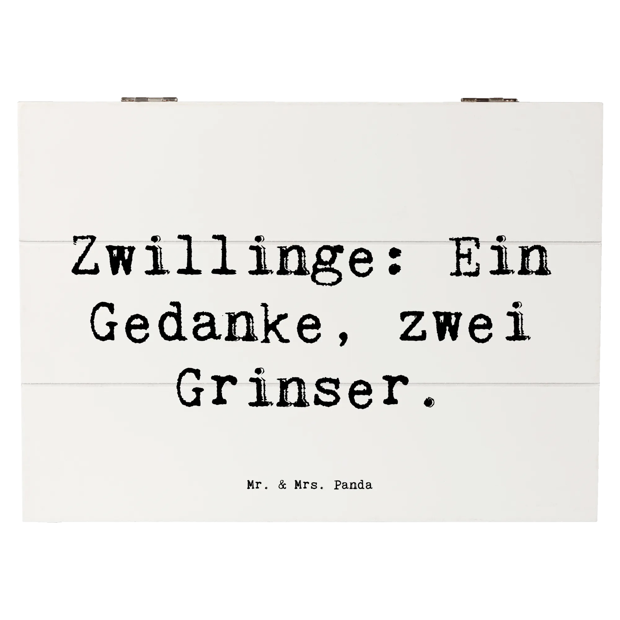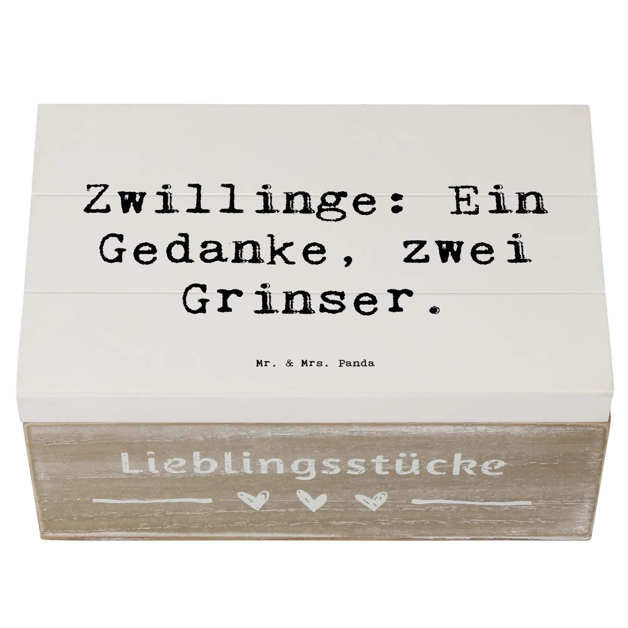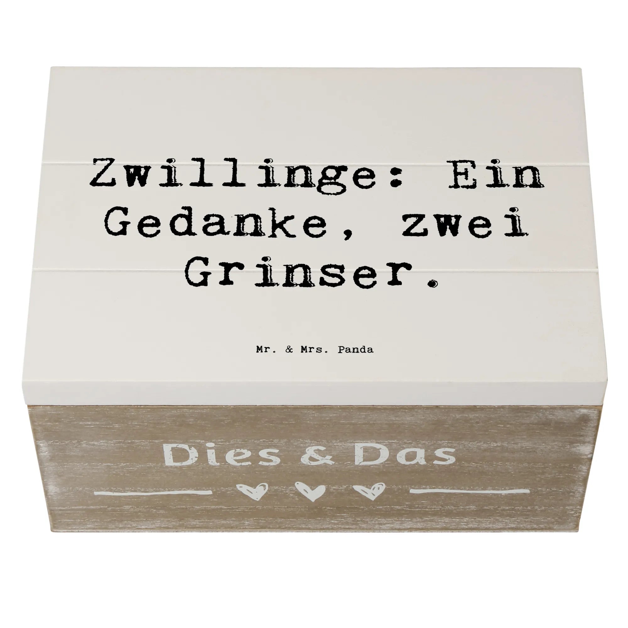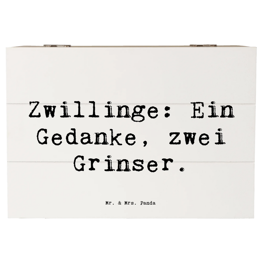 Die wunderschöne Holzkiste von Mr. & Mrs. Panda ist das perfekte Geschenk für Zwillingsgeschwister, die ihre besonderen Erinnerungen teilen möchten. Mit dem liebevollen Motiv "Zwillinge: Ein Gedanke, zwei Grinser." unterstreicht diese Kiste die innige Beziehung zwischen Geschwistern, die meist nicht nur ein Geburtsdatum teilen, sondern auch unzählige gemeinsame Abenteuer erleben.