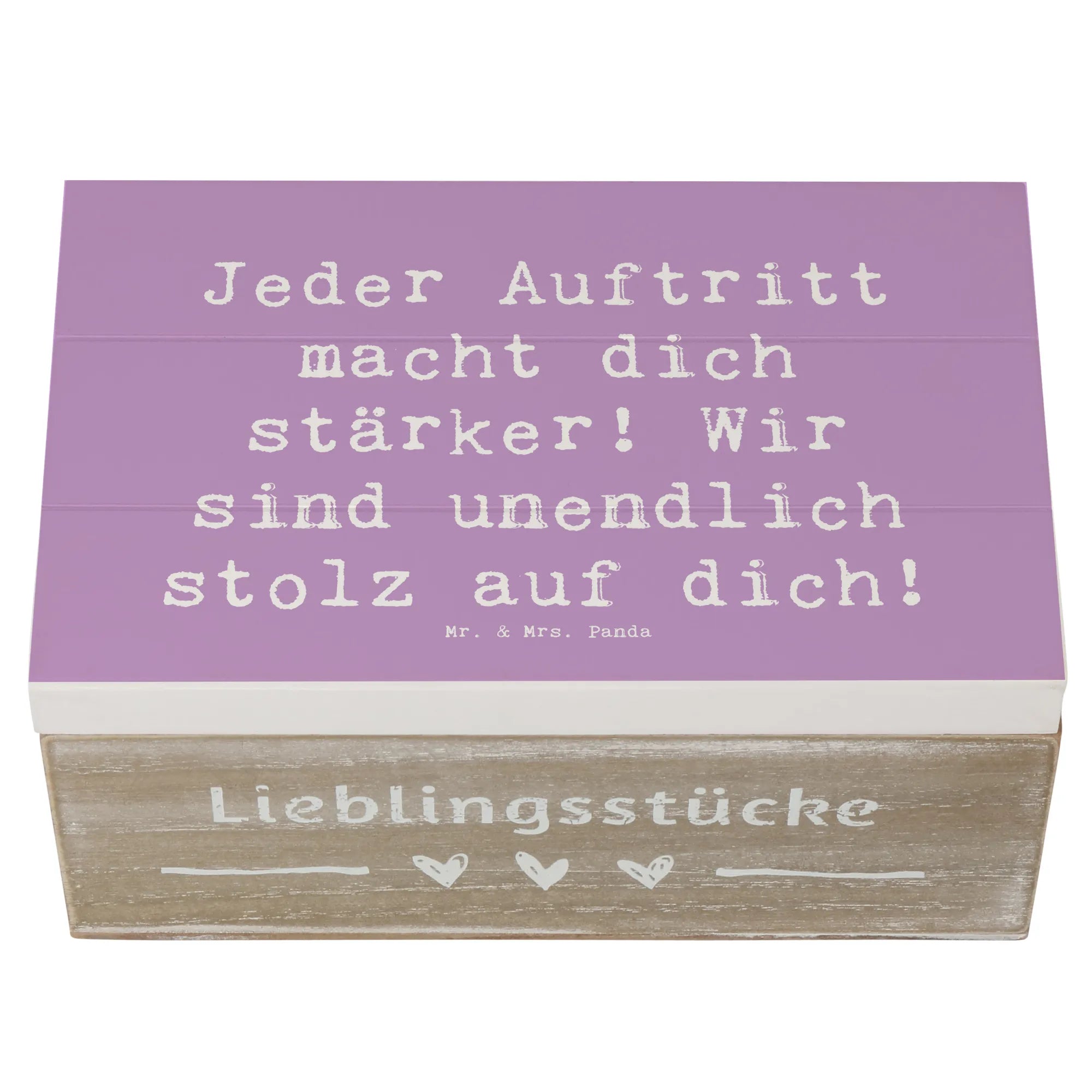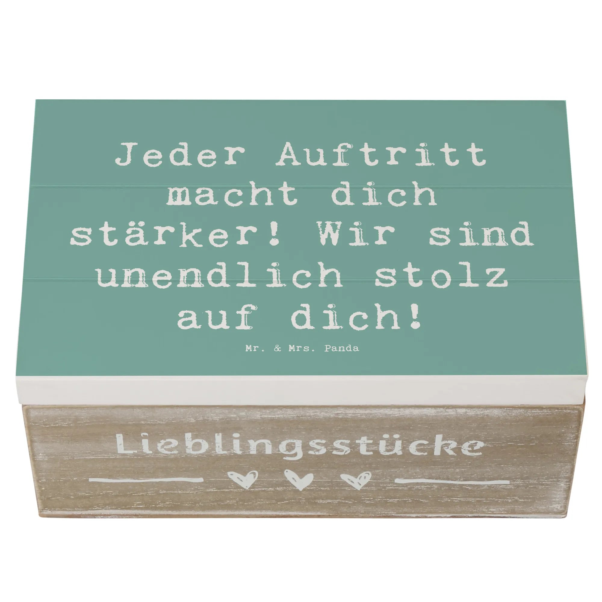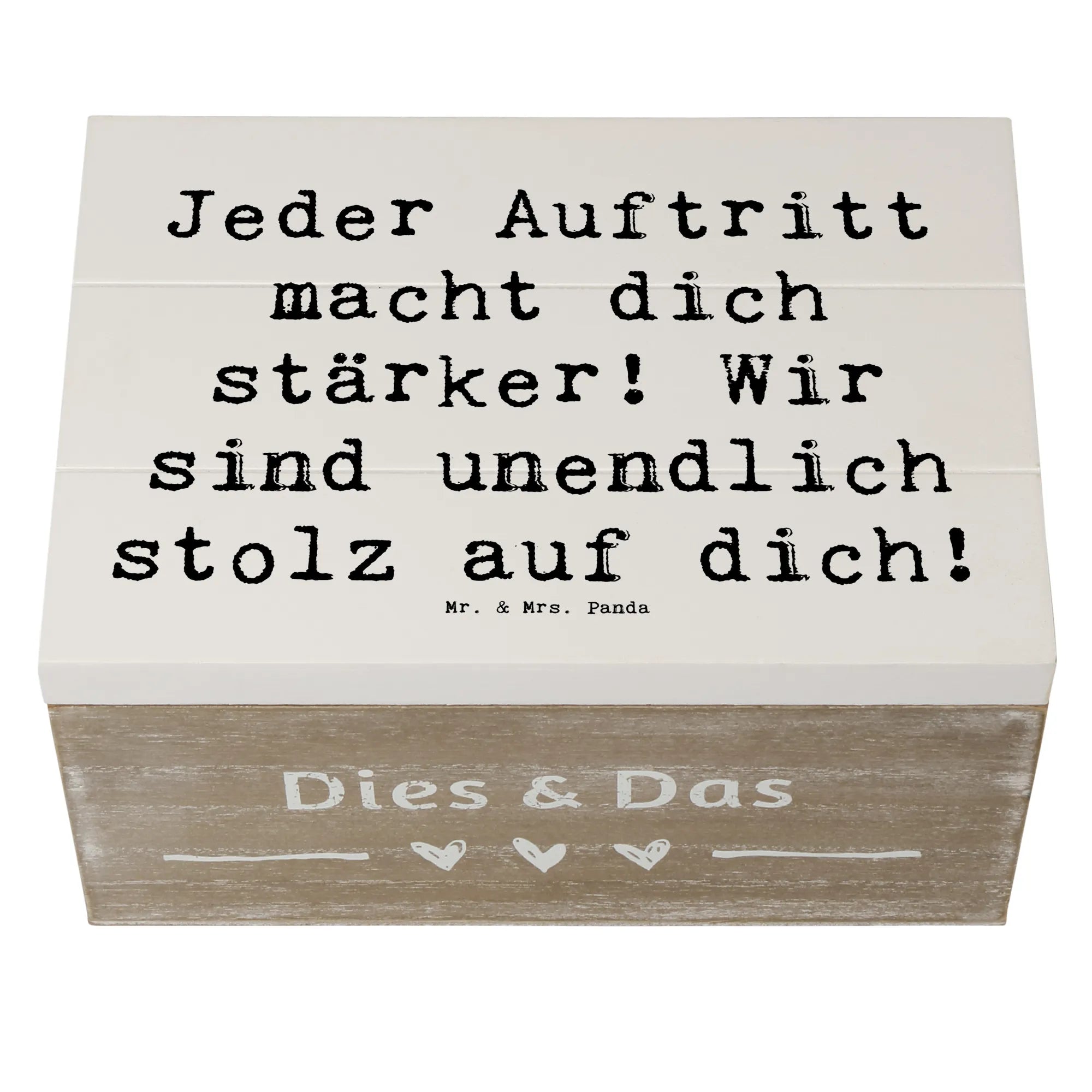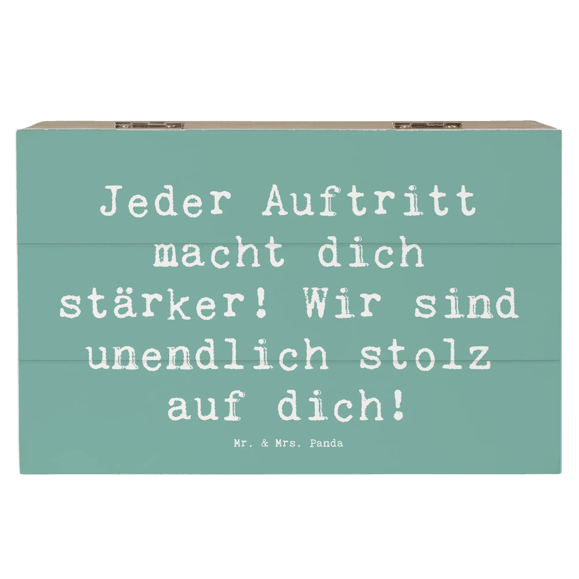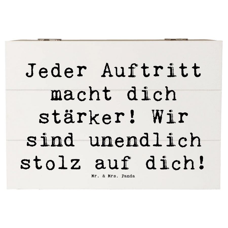 Mit dem aufgedruckten Spruch "Jeder Auftritt macht dich stärker! Wir sind unendlich stolz auf dich!" bekommst du eine Botschaft, die den Empfänger ermutigt und stärkt. Diese Holzkiste ist nicht nur ein schöner Blickfang, sondern auch eine nachhaltige und wiederverwendbare Geschenkbox, die mit Liebe gefüllt werden kann.