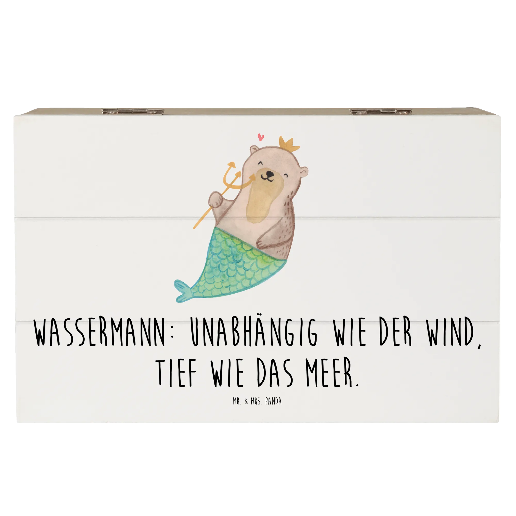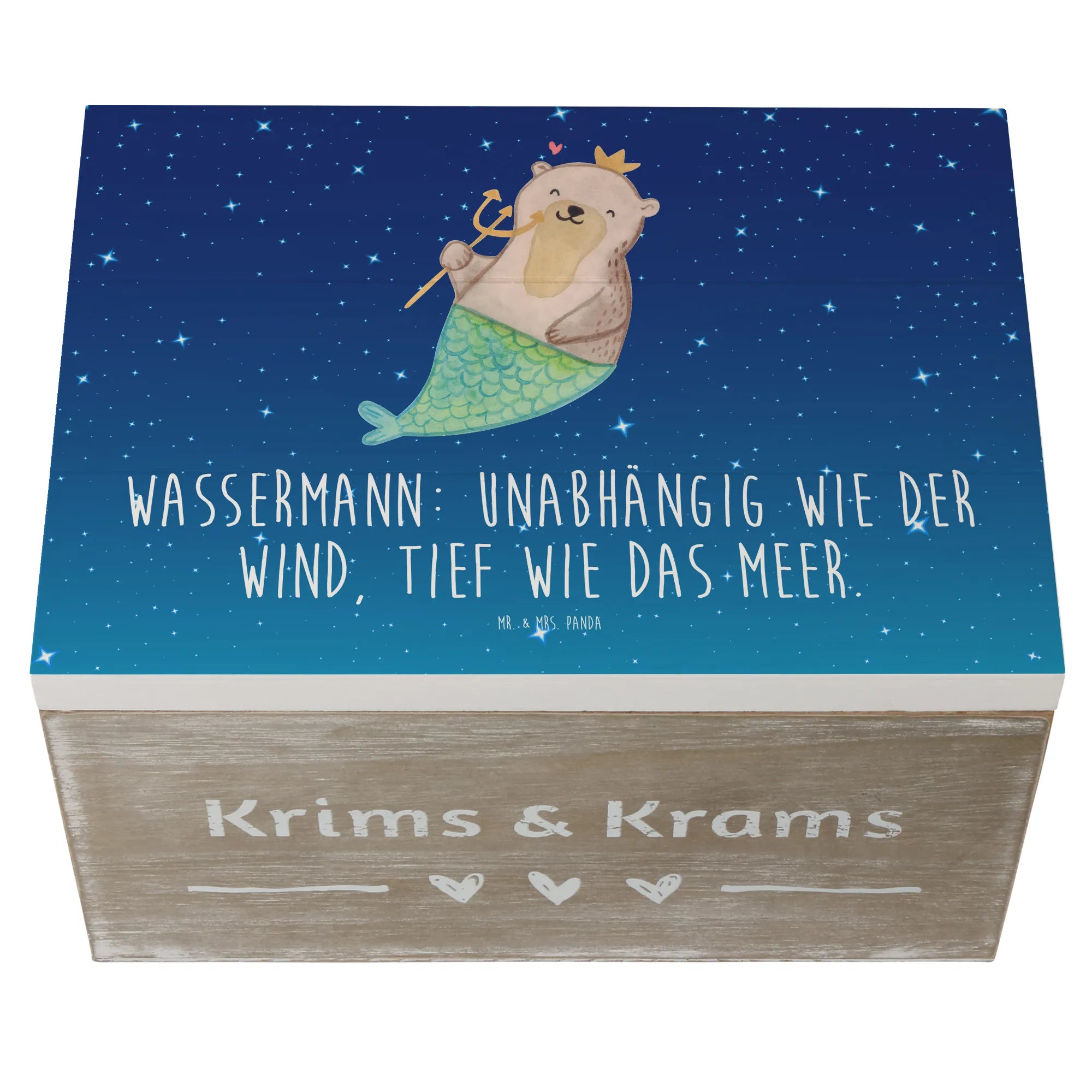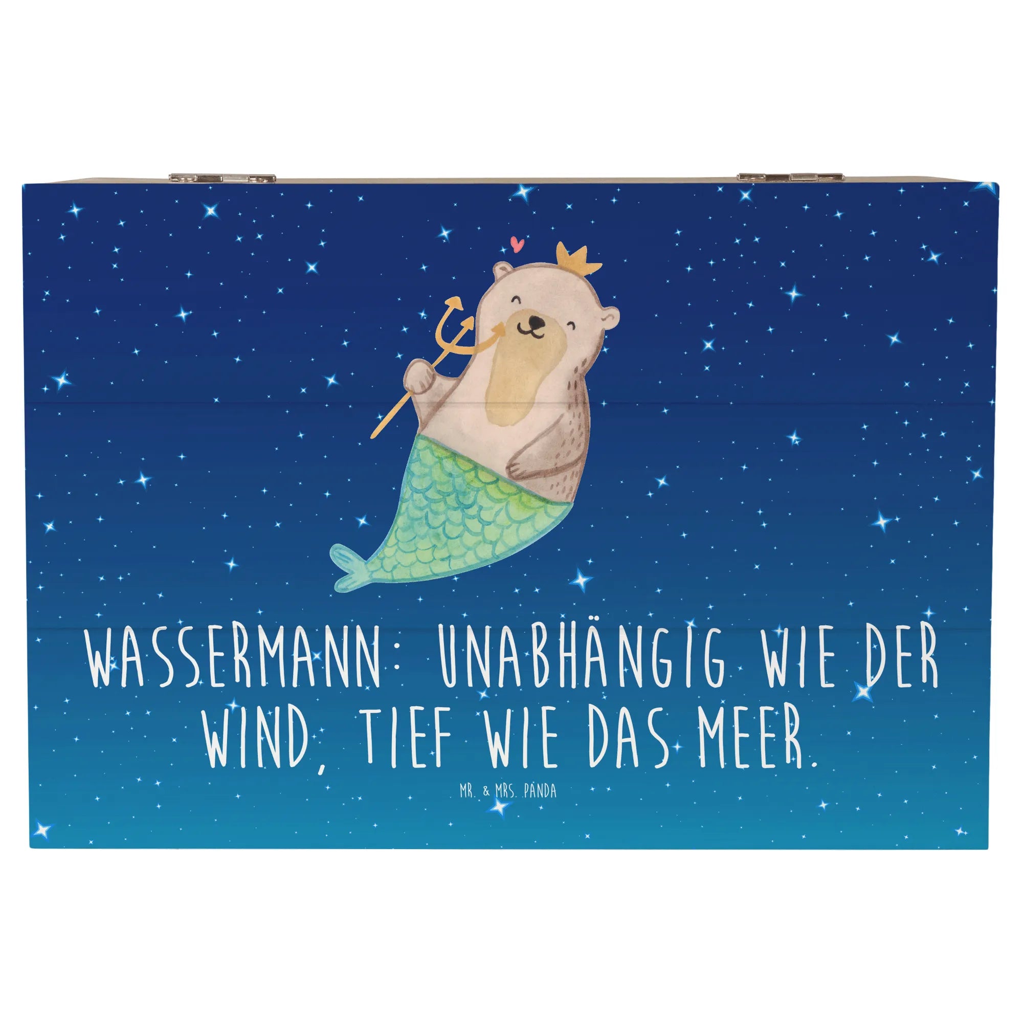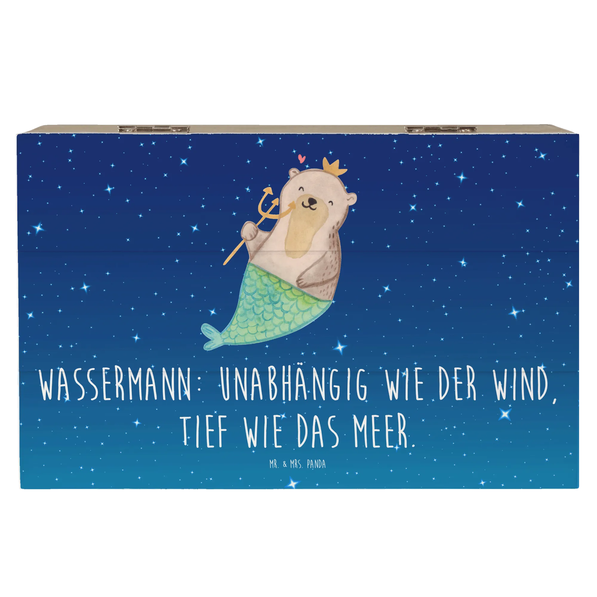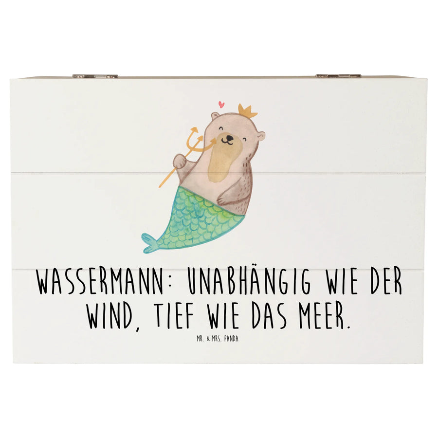 Mr. & Mrs. Panda Holzkiste Wassermann – eine zauberhafte Aufbewahrungsbox für alle, die das Meer, die Sterne und die Magie der Astrologie lieben. Das handgezeichnete Motiv zeigt einen liebenswerten Otter mit Fischflosse, Dreizack und goldener Krone. Der Satz „Wassermann: Unabhängig wie der Wind, tief wie das Meer.“ macht die Kiste zum idealen Geschenk für Wassermann-Geburtstage oder als persönliche Erinnerungskiste.