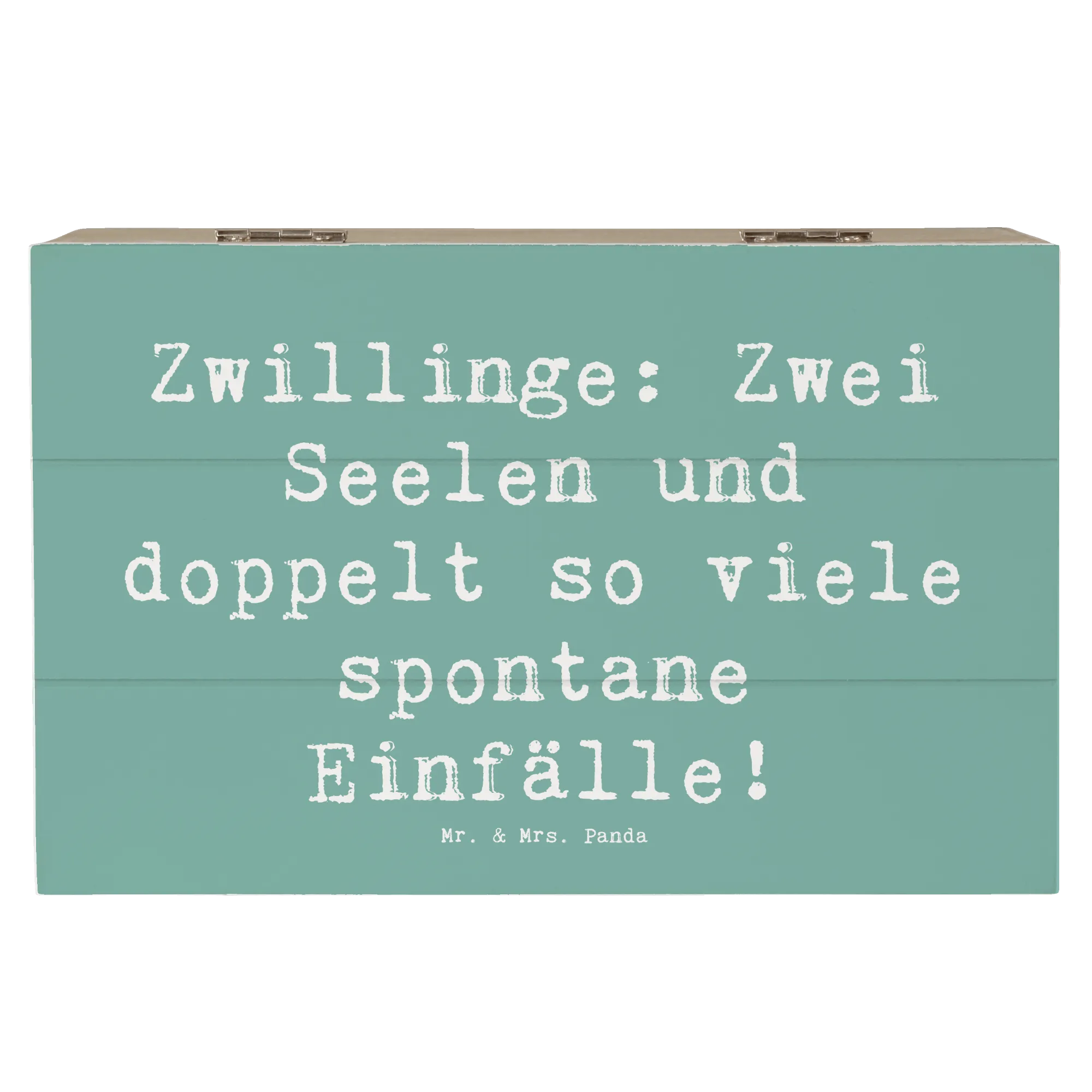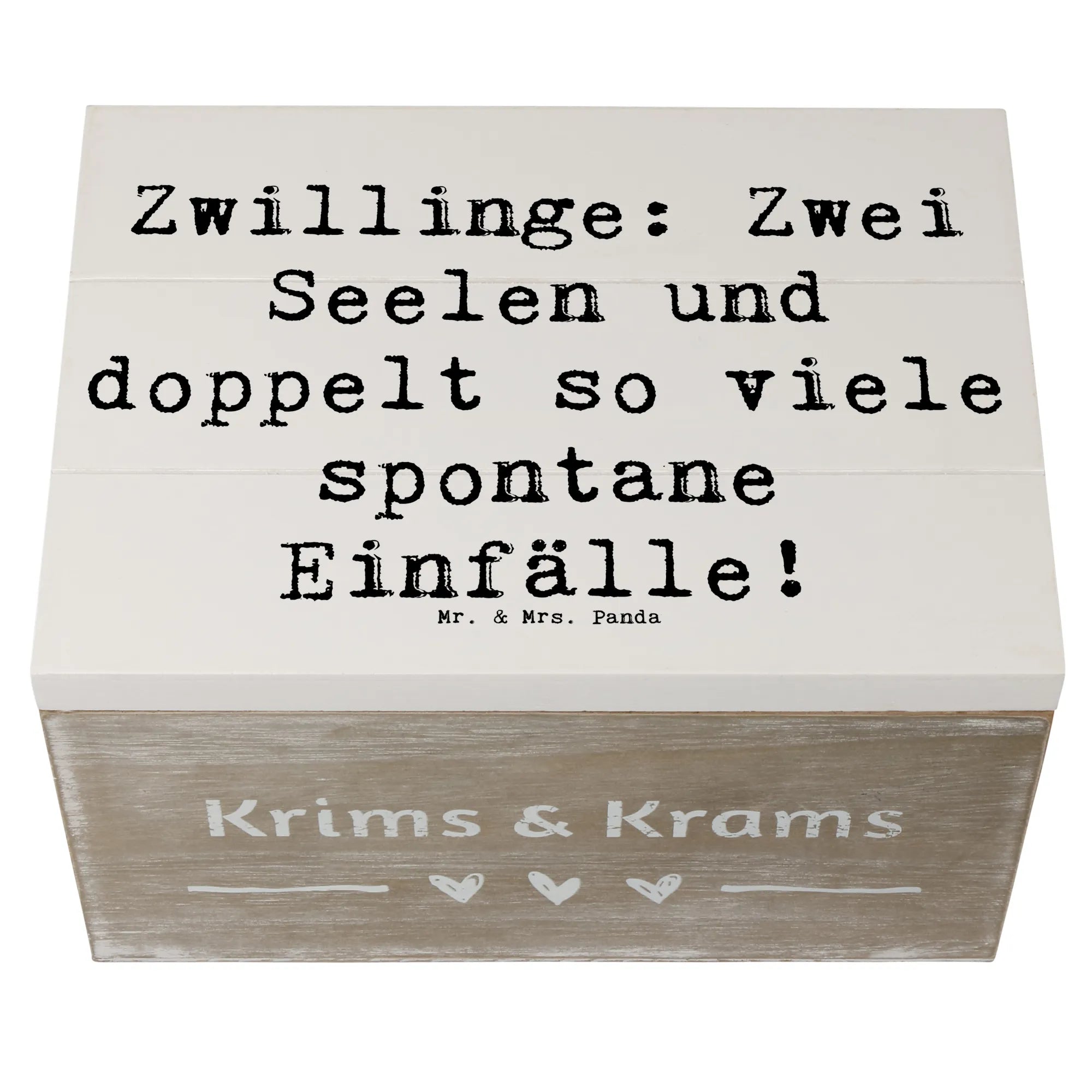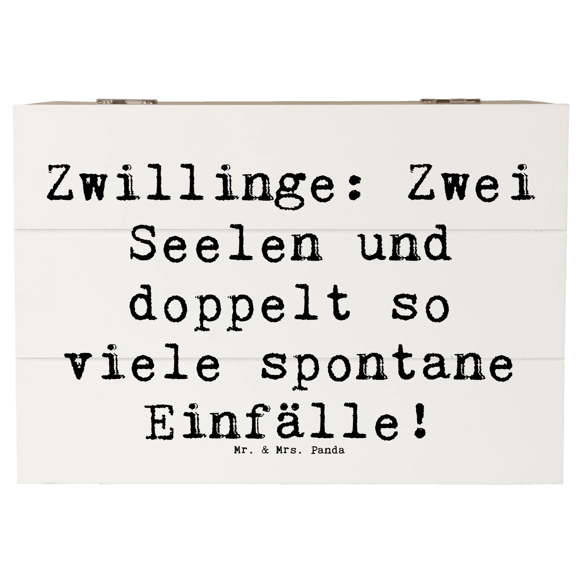 Die wunderschöne Holzkiste von Mr. & Mrs. Panda ist das perfekte Geschenk für alle Zwillinge. Ob zur Kommunion, Konfirmation oder als Aufbewahrungsort für die schönsten Erinnerungen, diese Erinnerungskiste aus robuster Holzfaser vereint Funktionalität mit einem tollen Design. Der originelle Spruch "Zwillinge: Zwei Seelen und doppelt so viele spontane Einfälle!" sorgt für ein Lächeln bei jeder Gelegenheit.