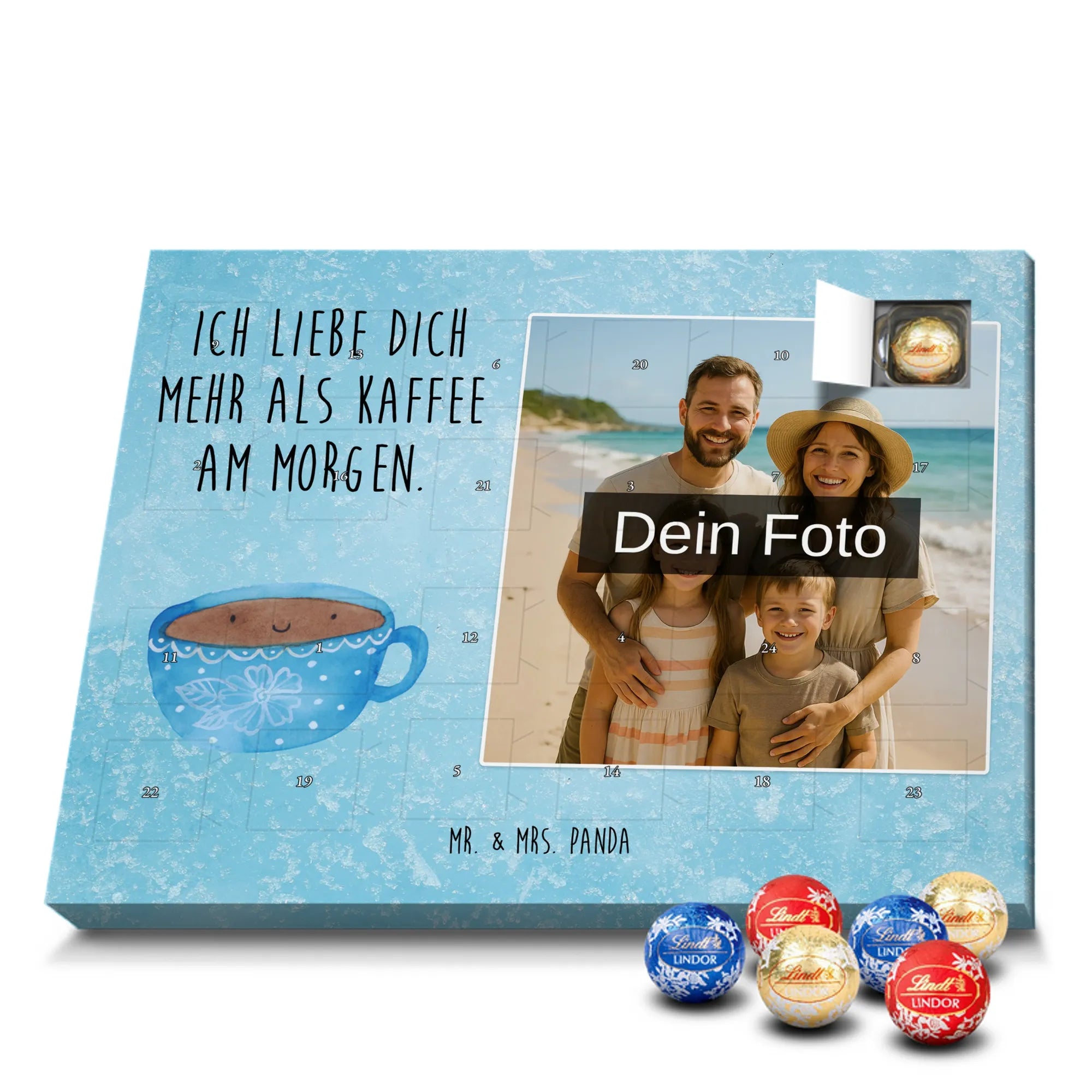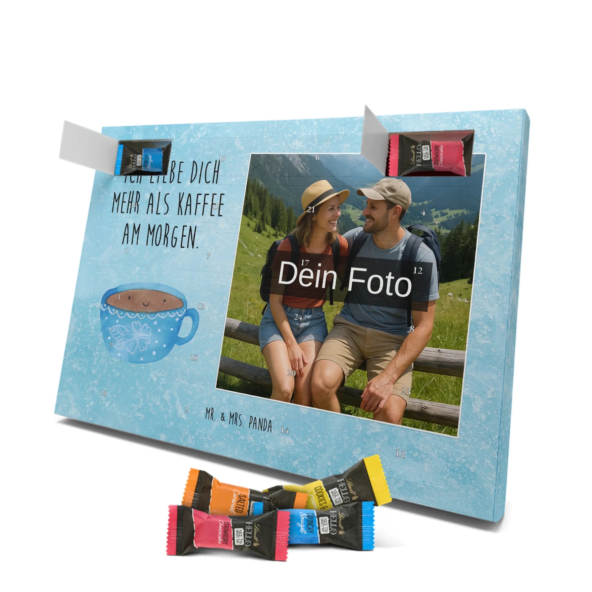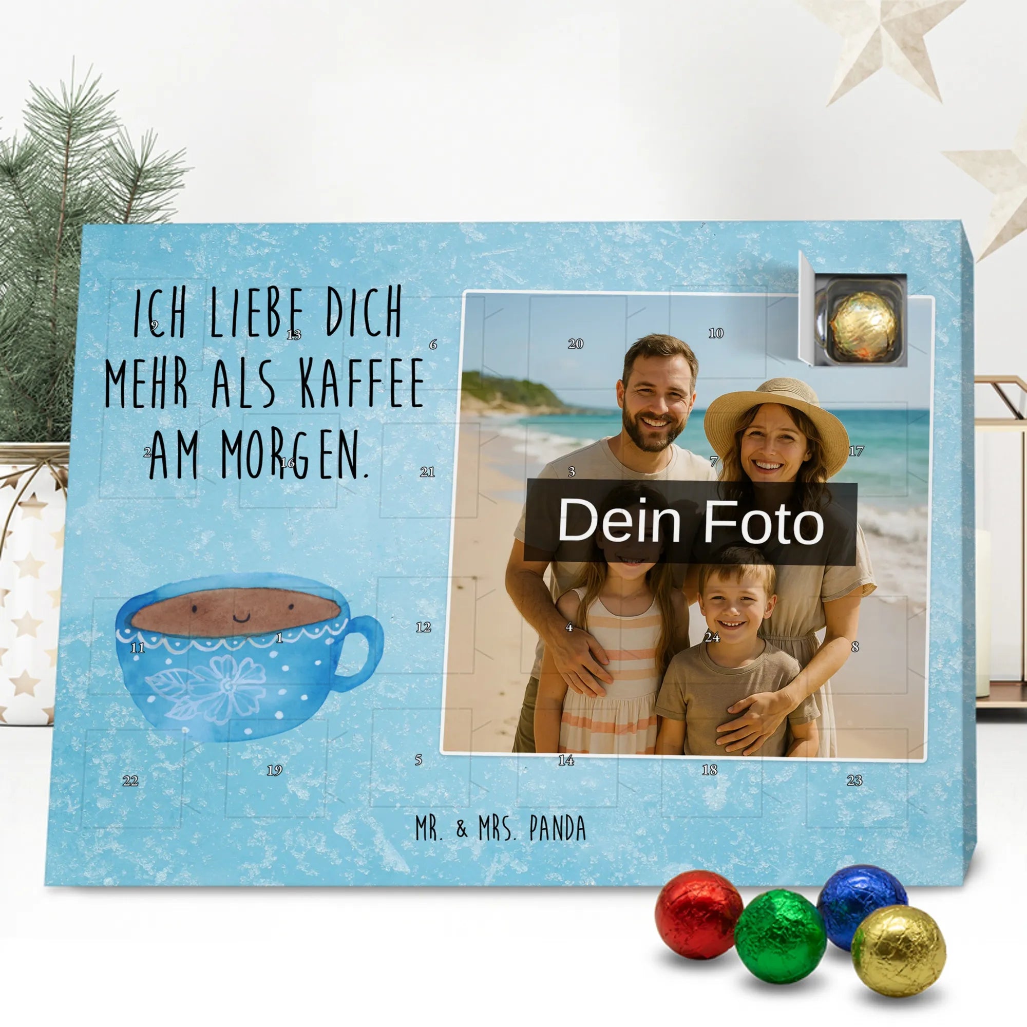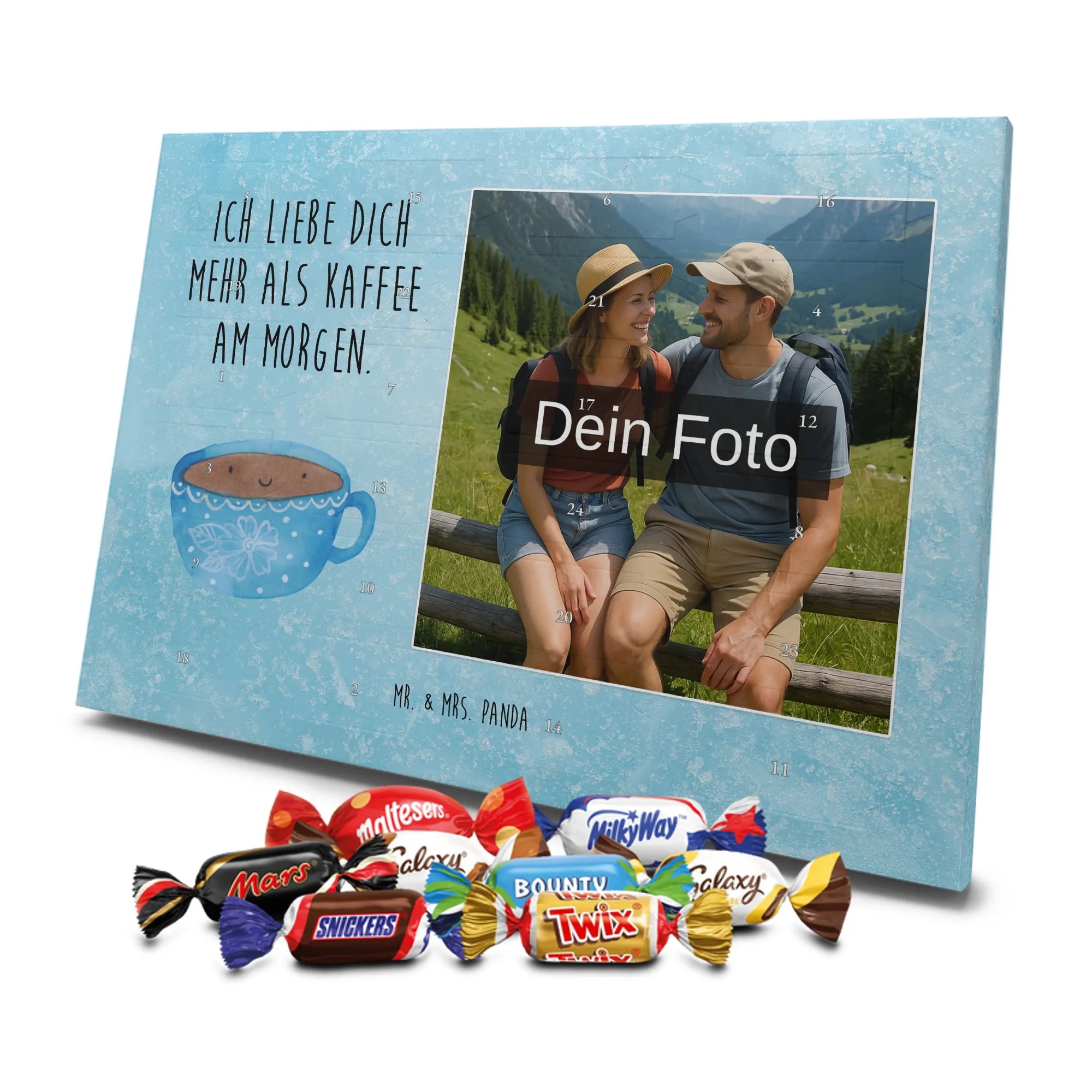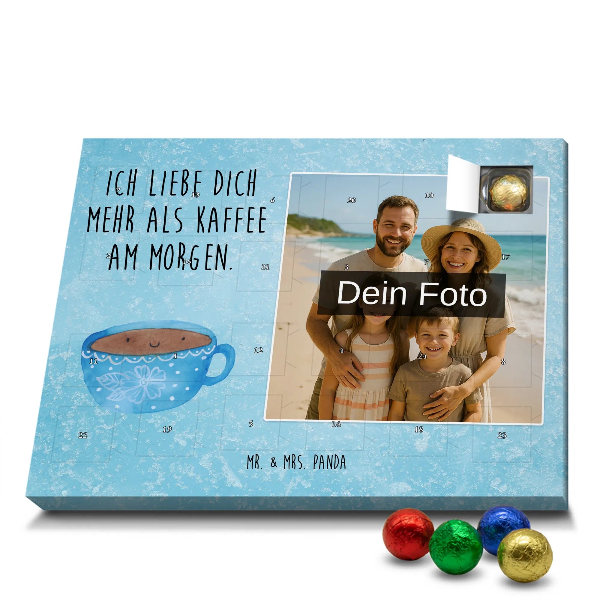 Verschenke Freude, Liebe und süßen Genuss: Unser personalisierbarer Adventskalender kombiniert dein Lieblingsfoto mit dem fröhlichen Tassen-Motiv von Mr. & Mrs. Panda. Die süße Kaffeetasse strahlt mit dem liebevollen Slogan „Ich liebe dich mehr als Kaffee am Morgen.“ und macht jeden Dezembermorgen zu einem besonderen Moment.